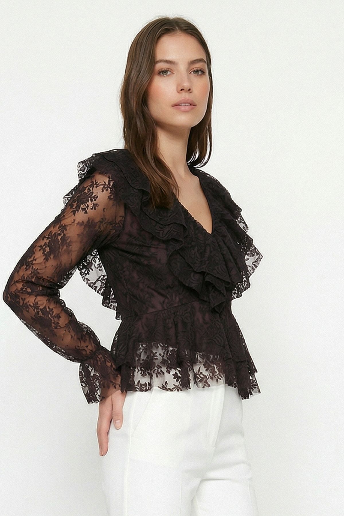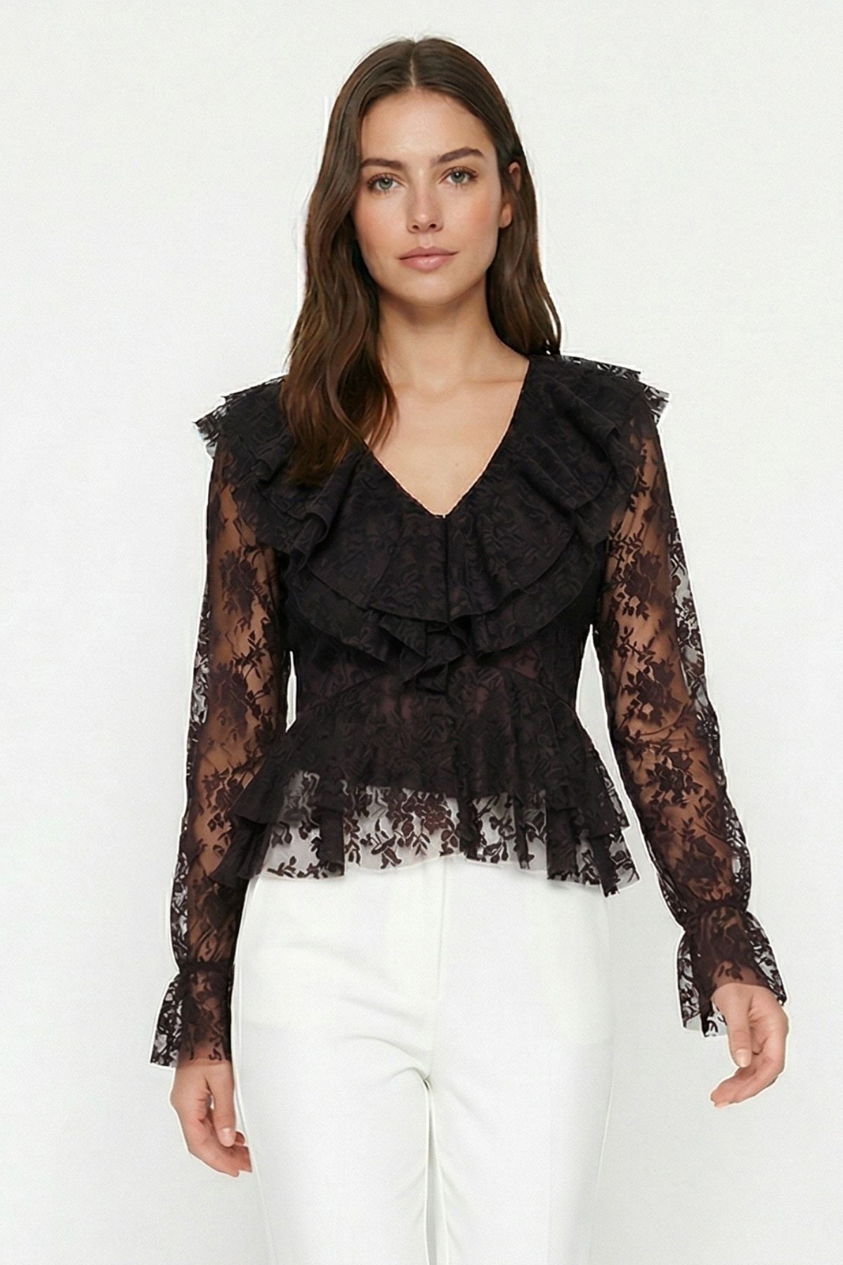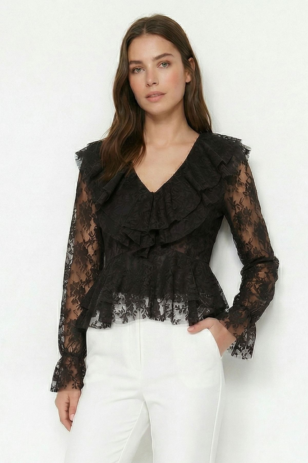 Siyah V Yaka Önü Fırfırlı Dantelli Bluz 8490