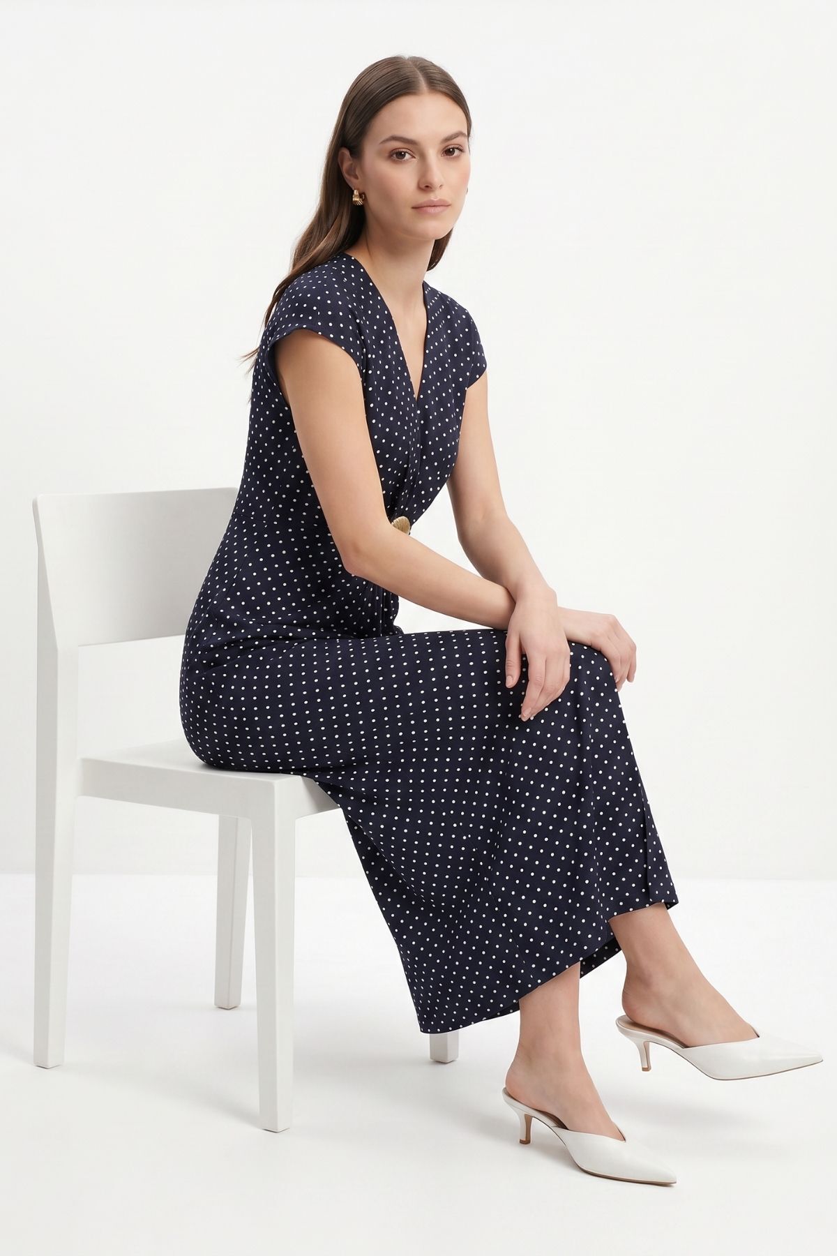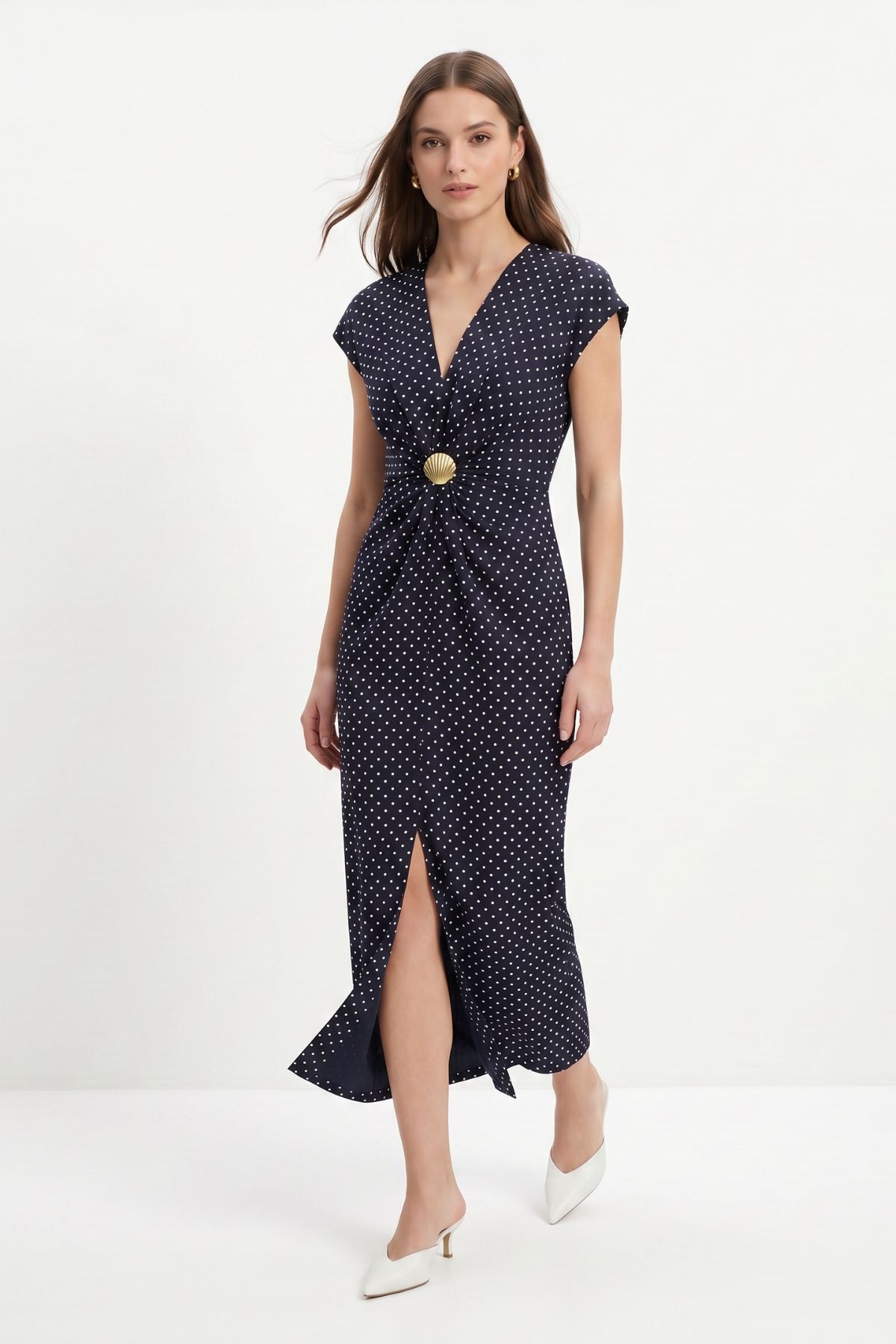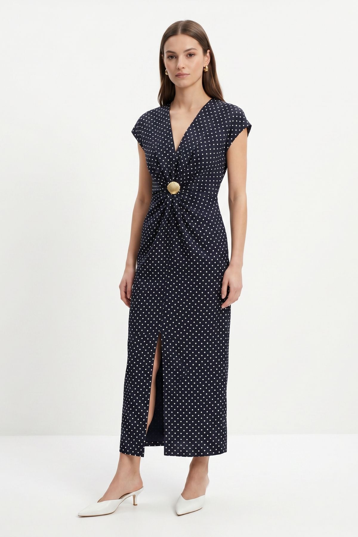 261680 V Yaka Tokalı Yırtmaçlı Puantiye Uzun Elbise