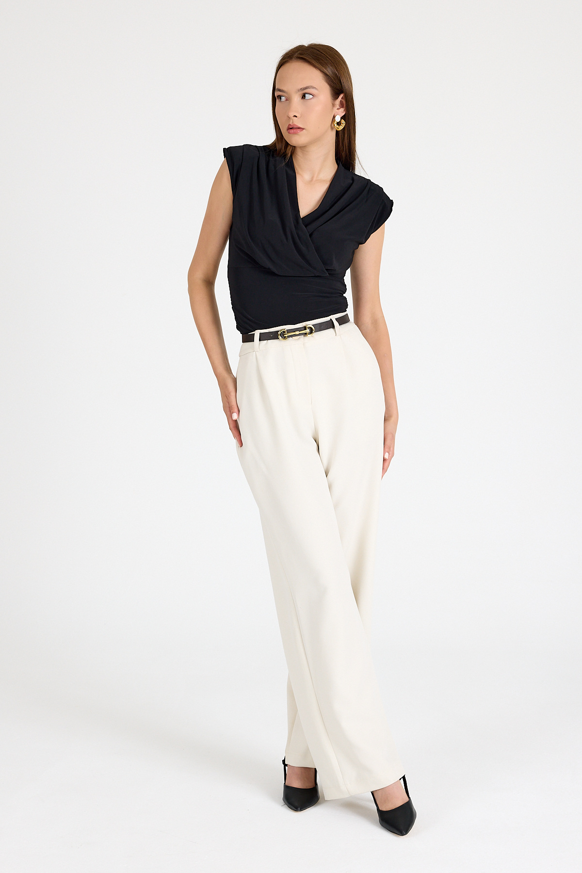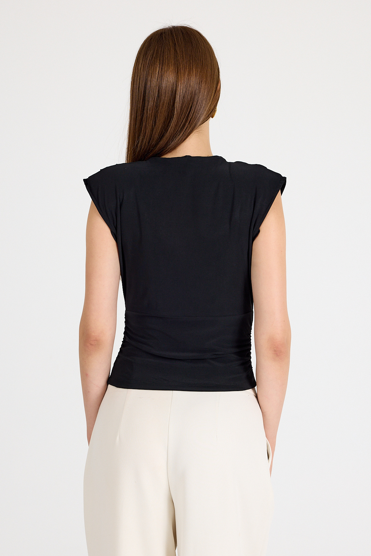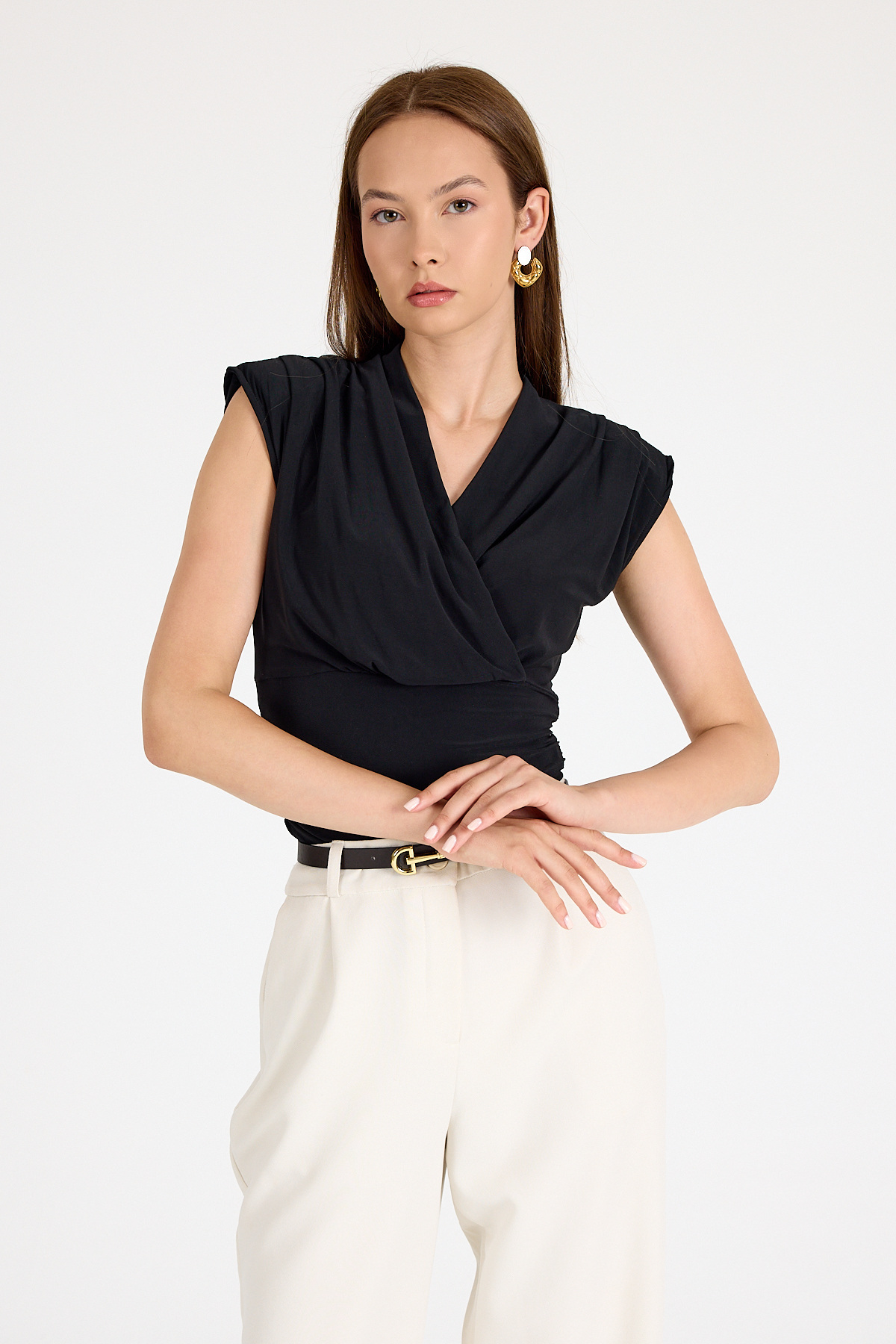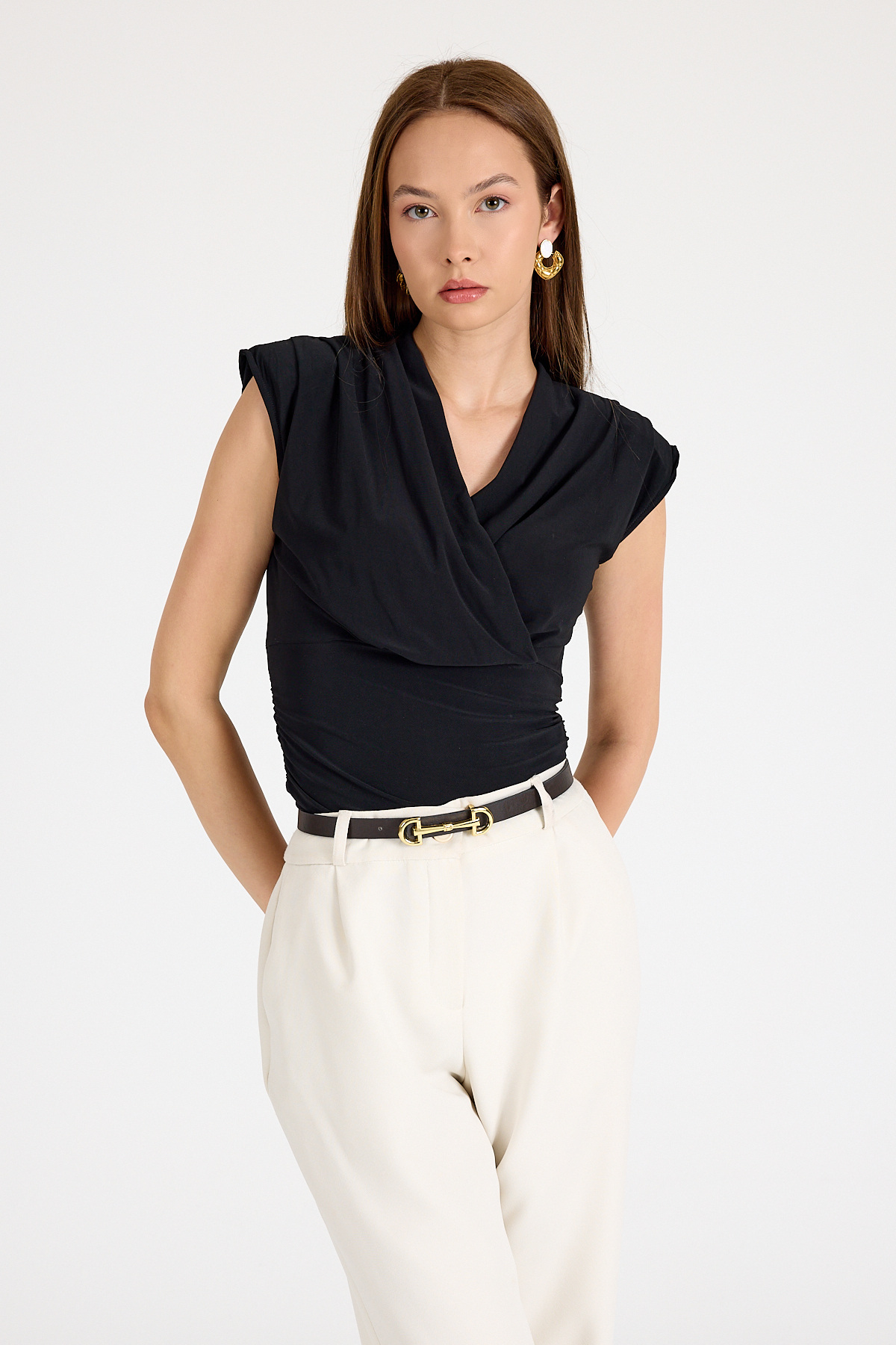 Siyah Vatkalı Kruvaze Yaka Drapeli Bluz 2487