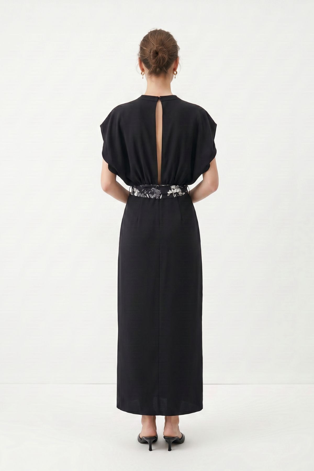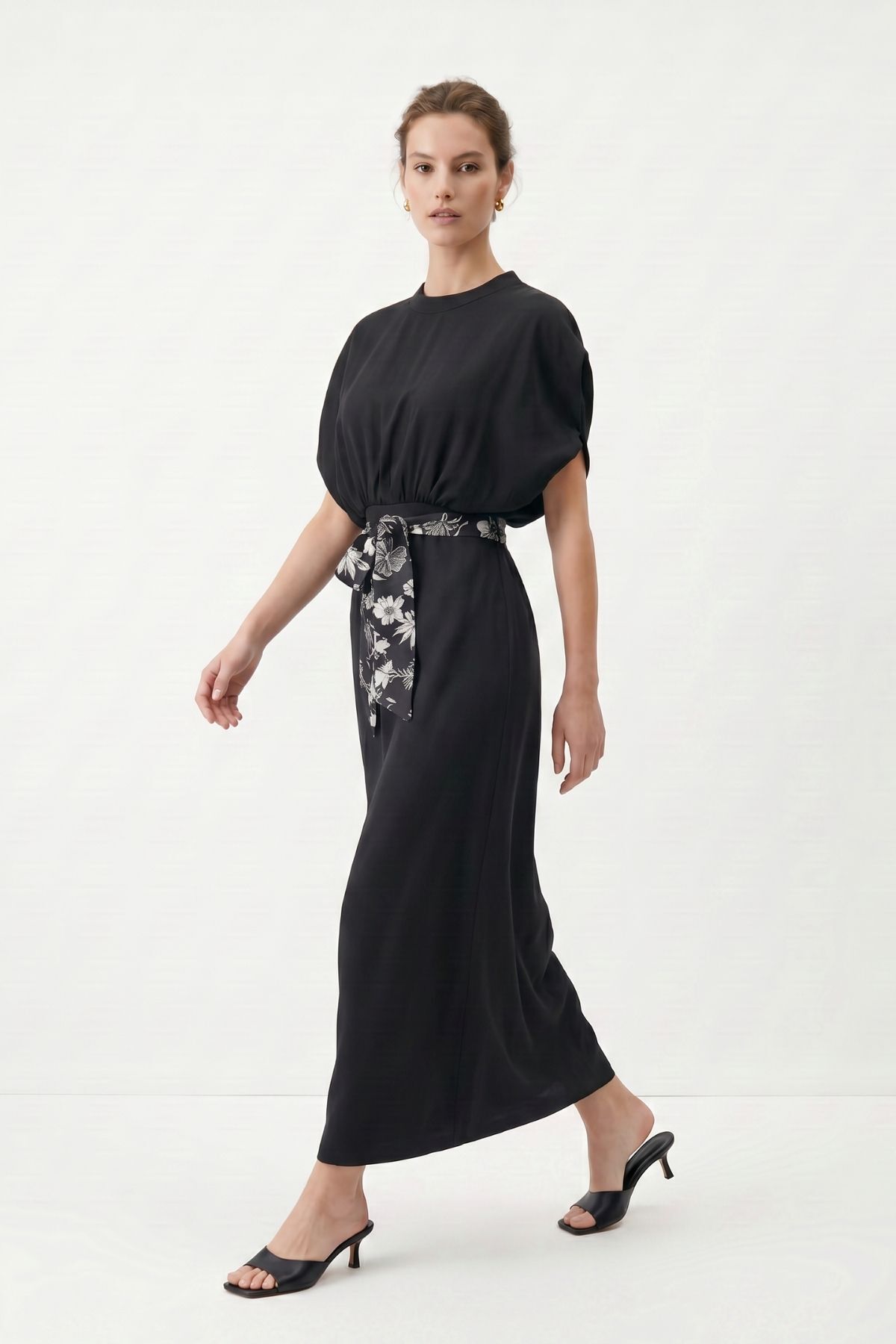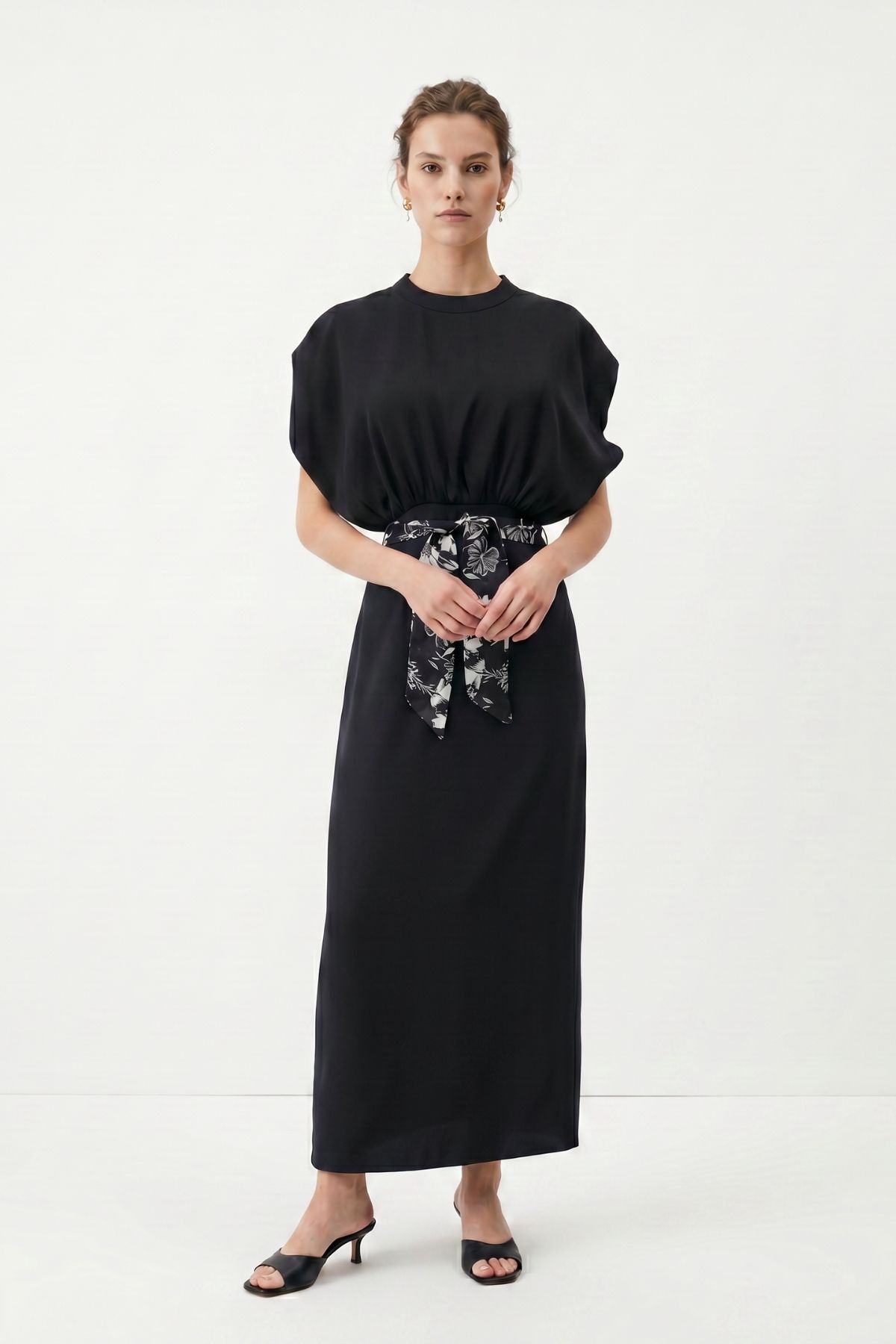 Siyah Vatkalı Kuşaklı Elbise 261653