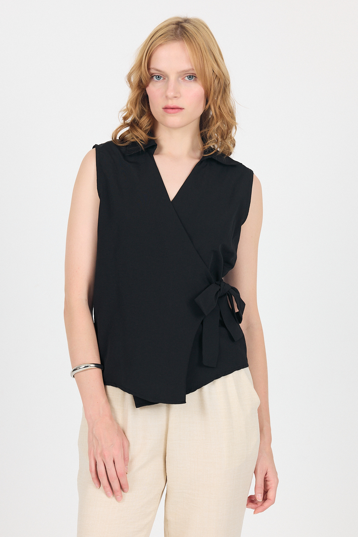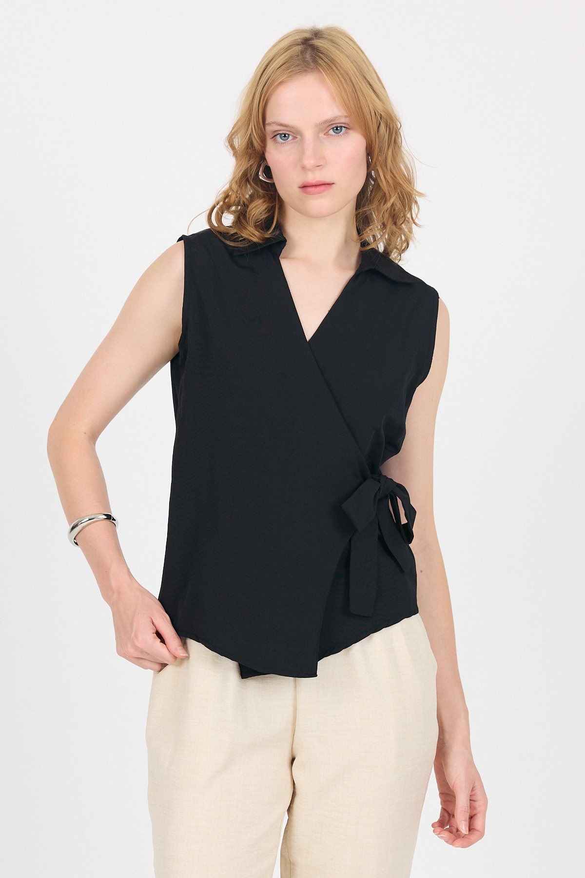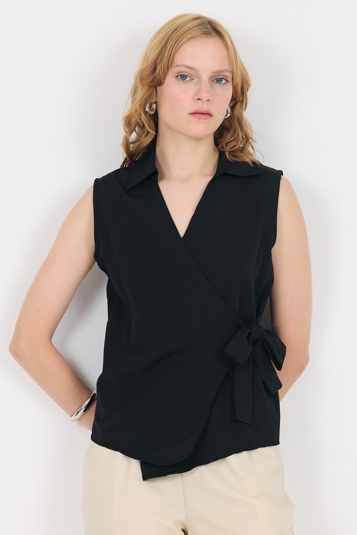 Siyah Yan Bağlama Detaylı Kolsuz Kruvaze Bluz 8047