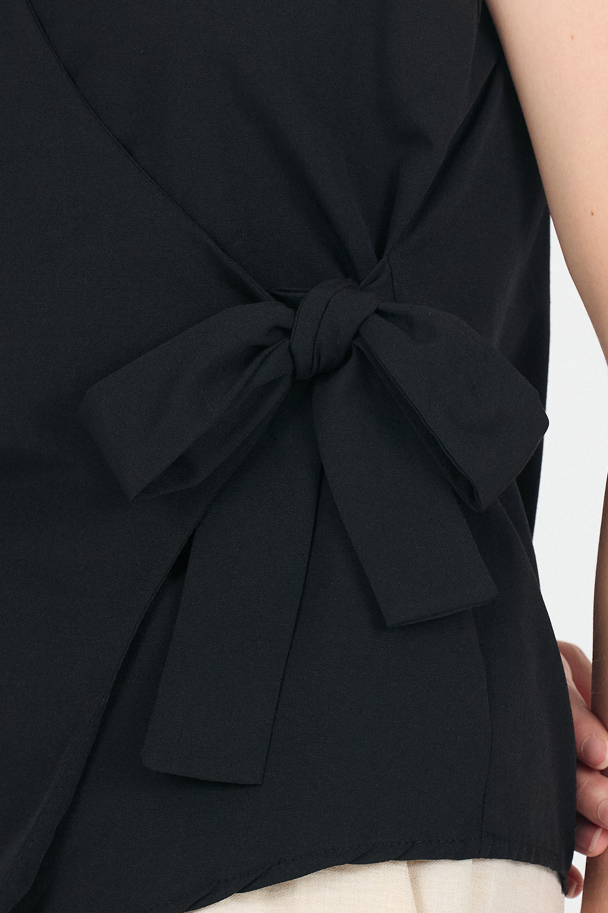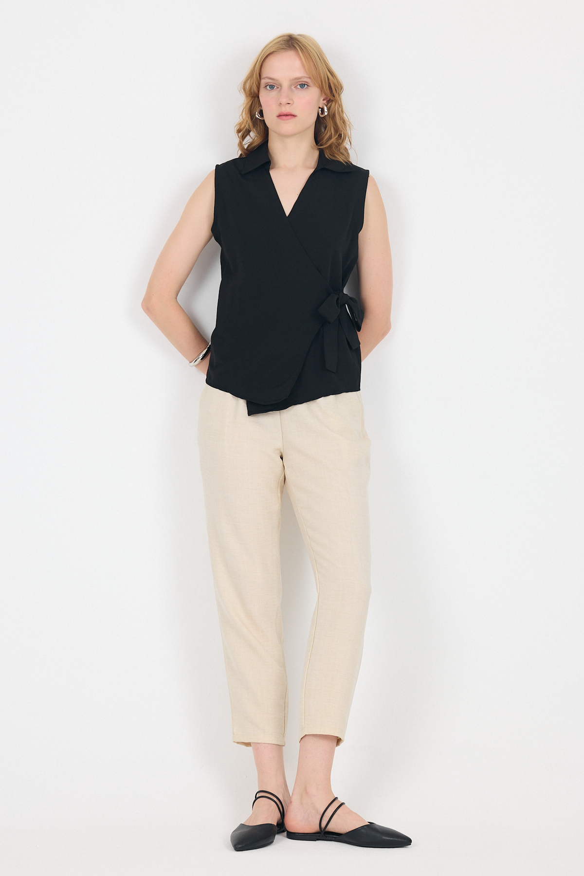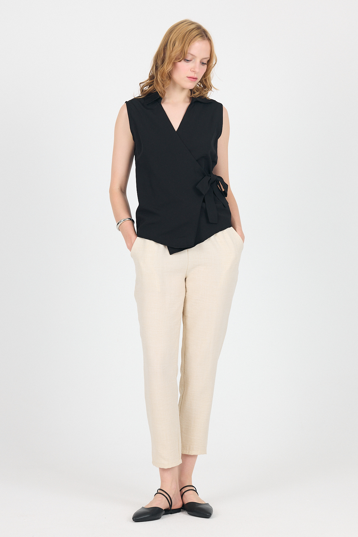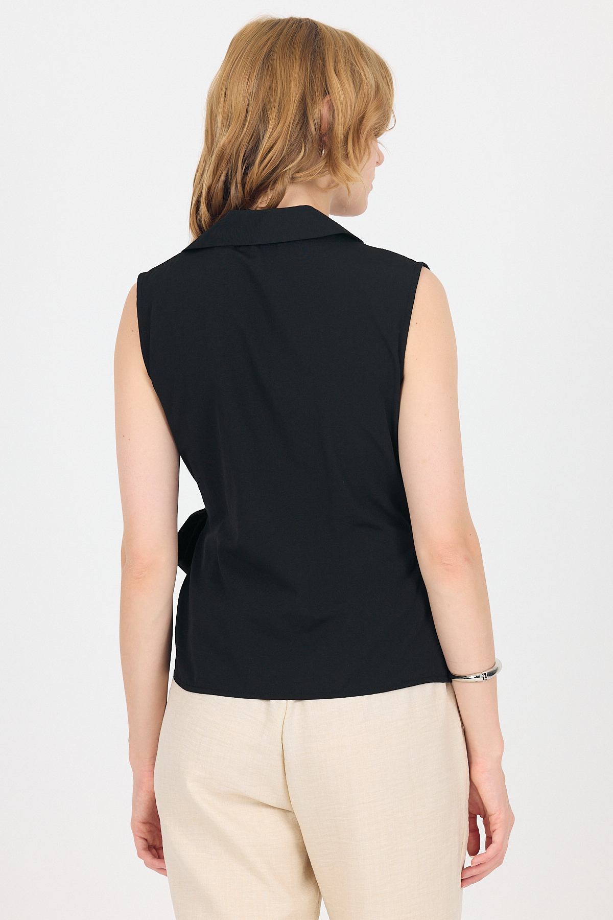 Siyah Yan Bağlama Detaylı Kolsuz Kruvaze Bluz 8047