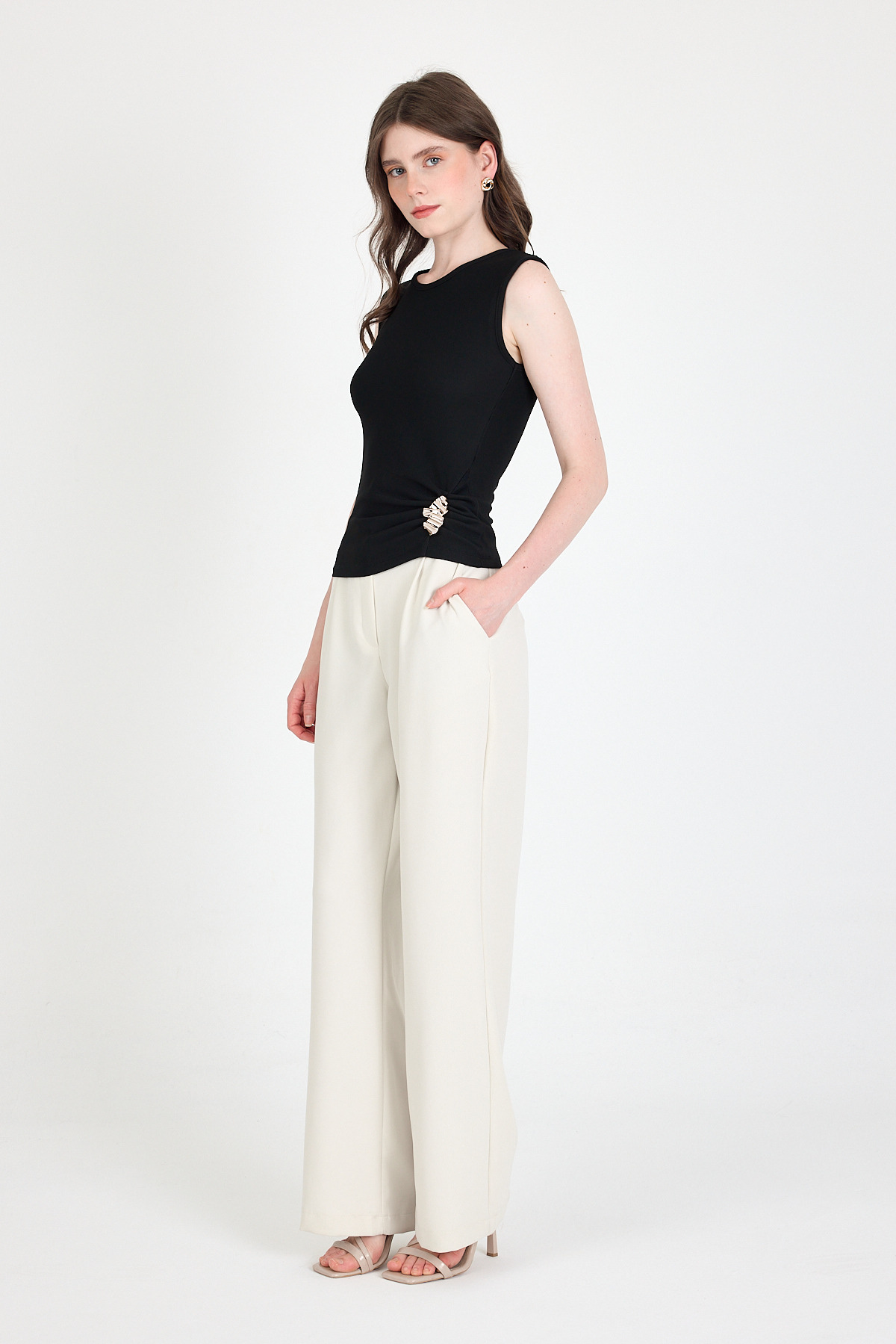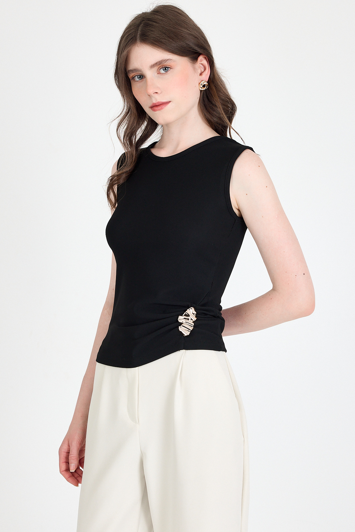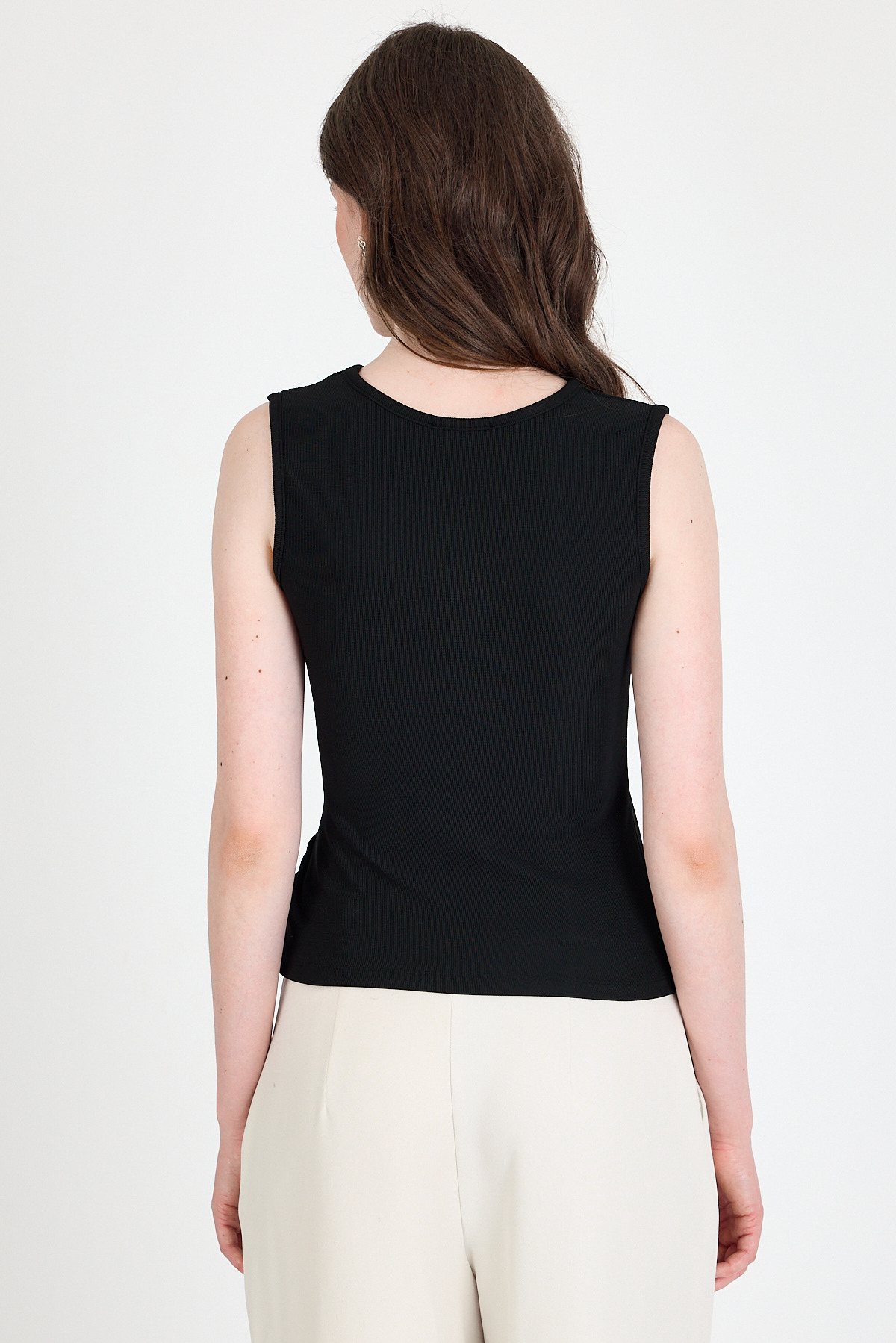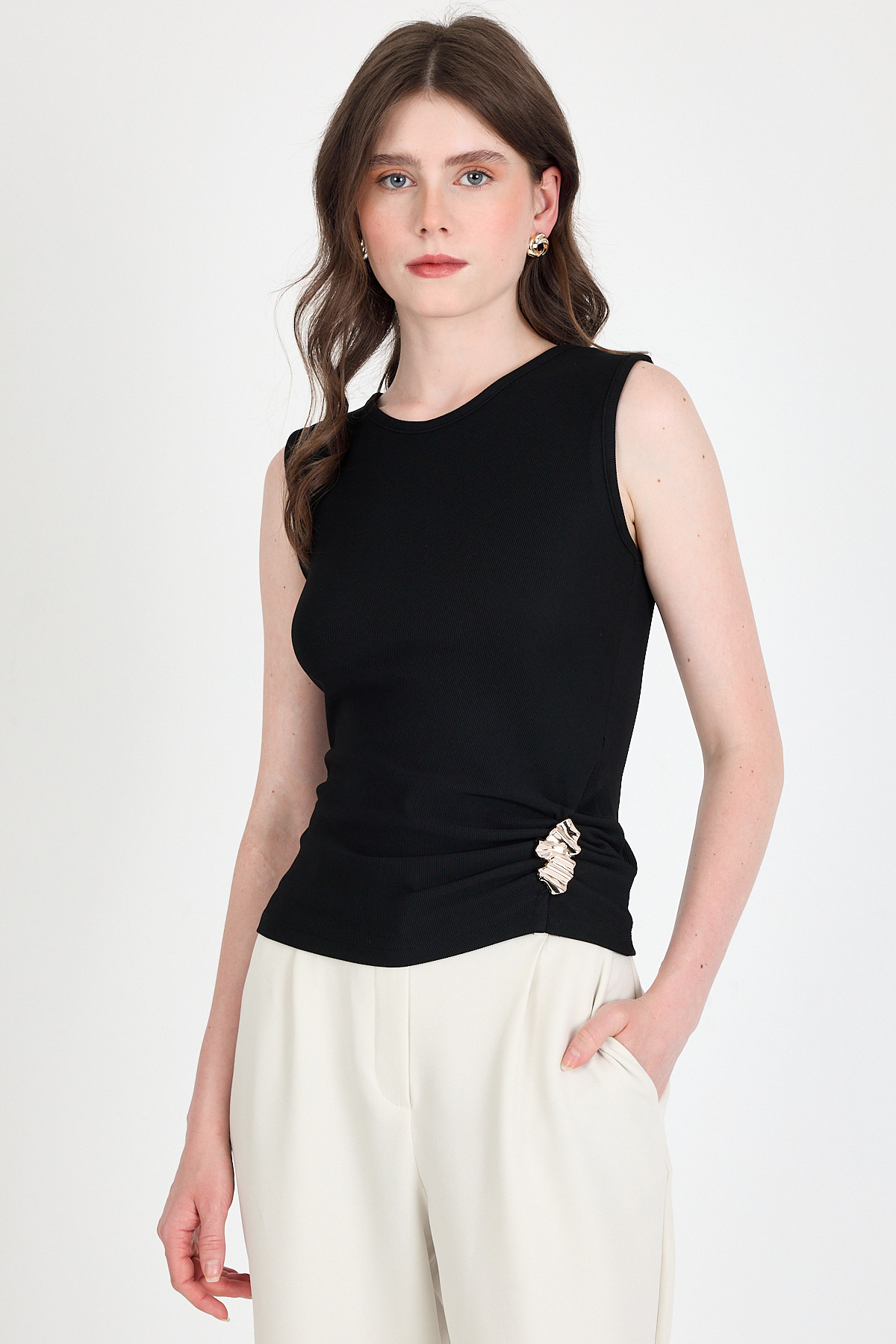 Siyah Yan Toka Detaylı Büzgülü Kolsuz Bluz 020