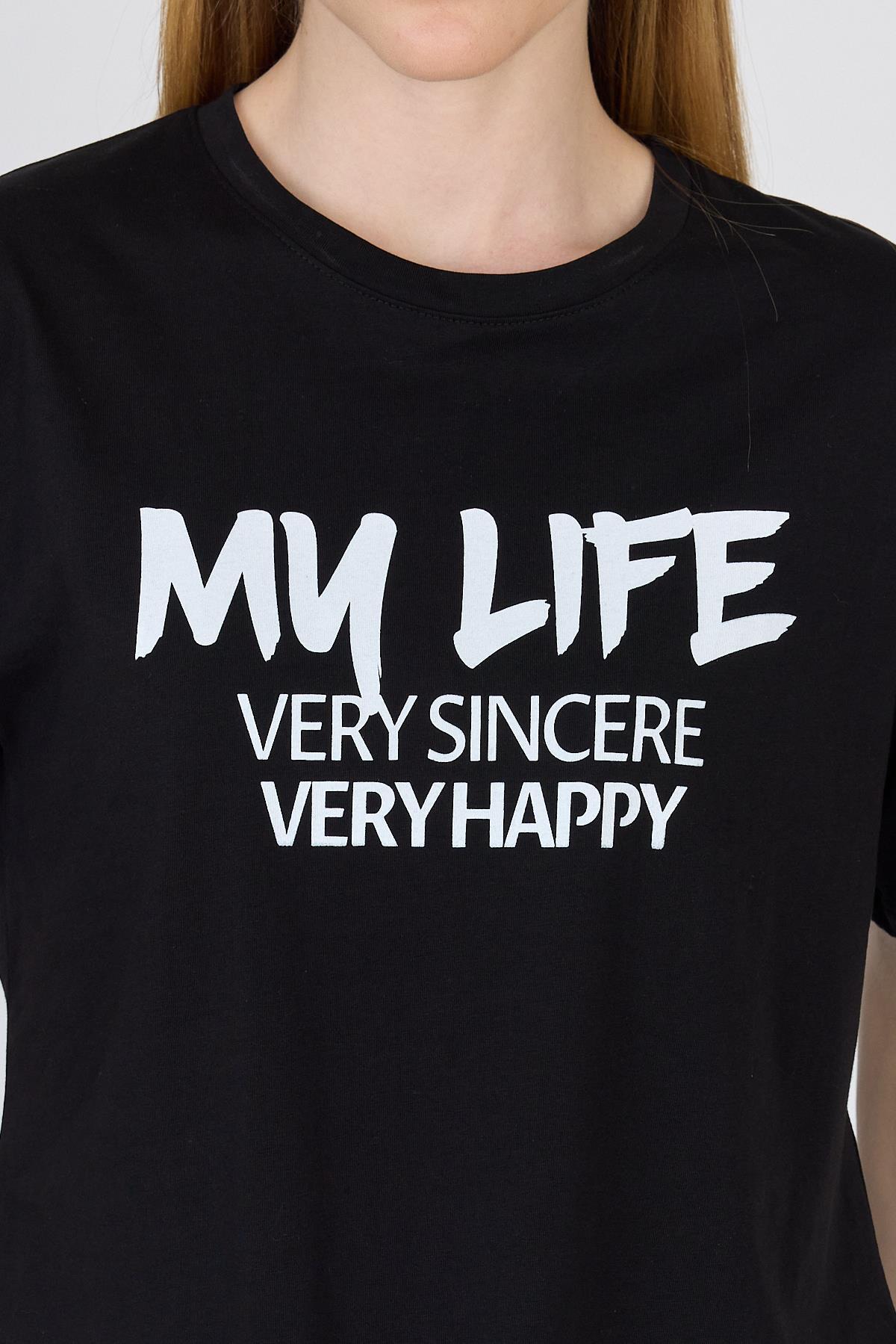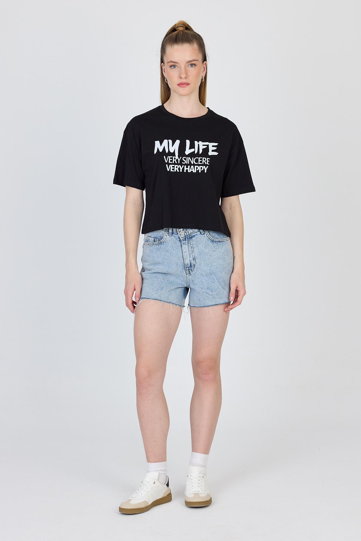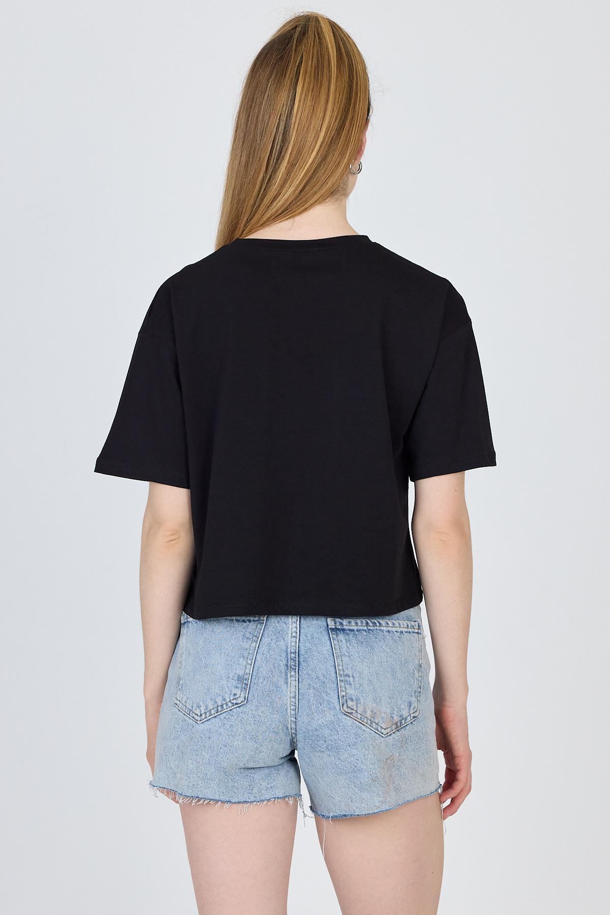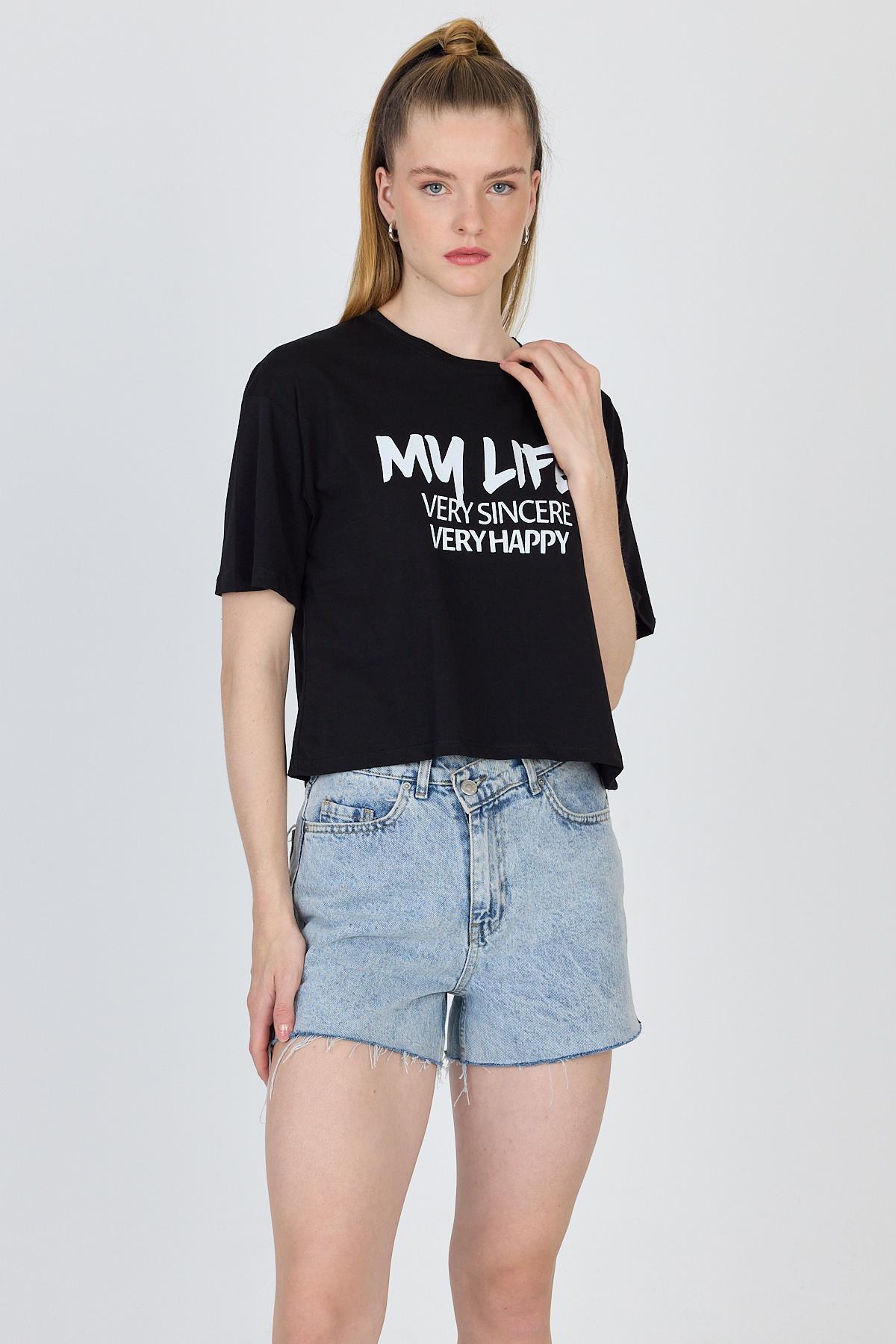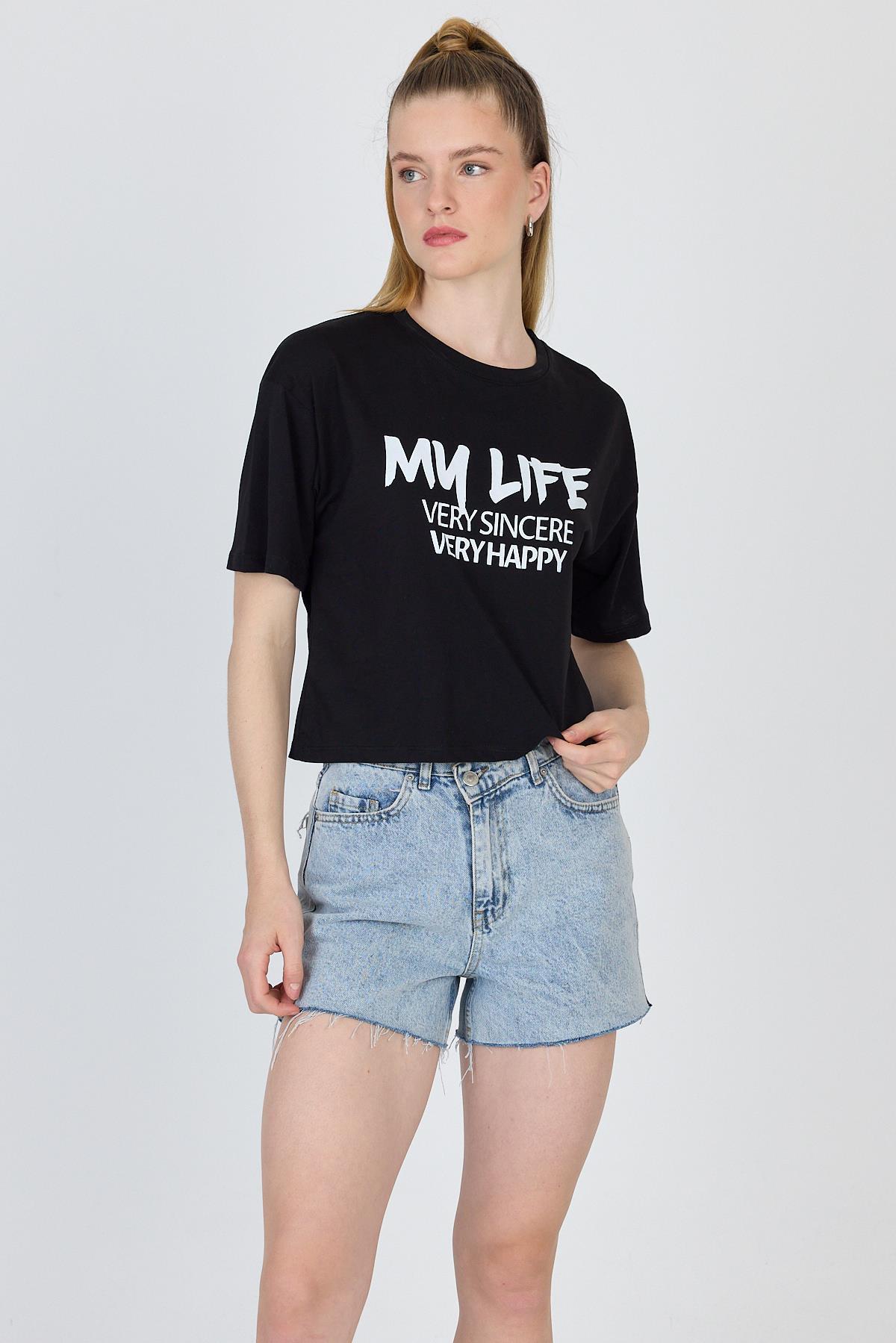 Siyah Yazı Baskılı %100 Pamuk Crop Tişört 9187M