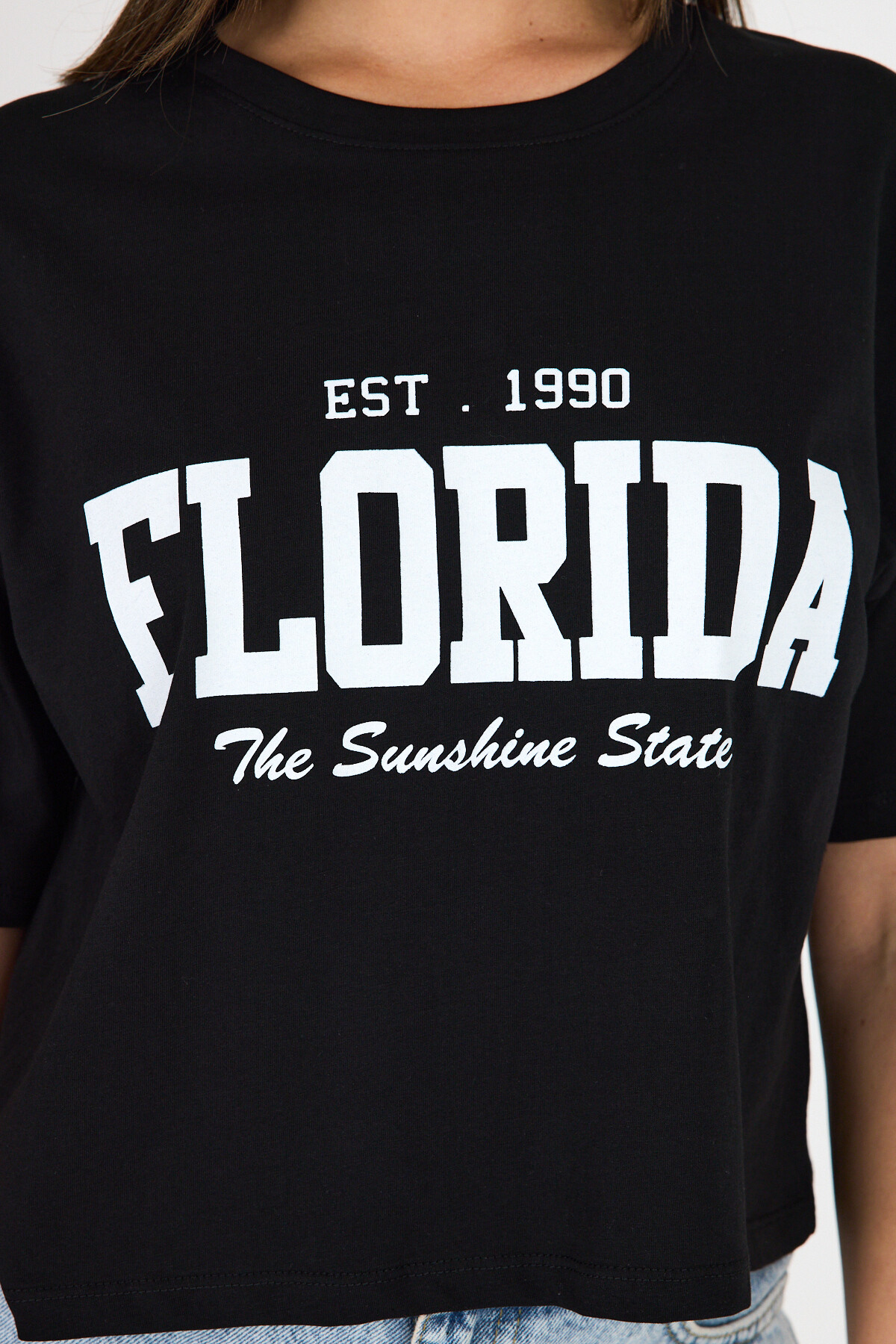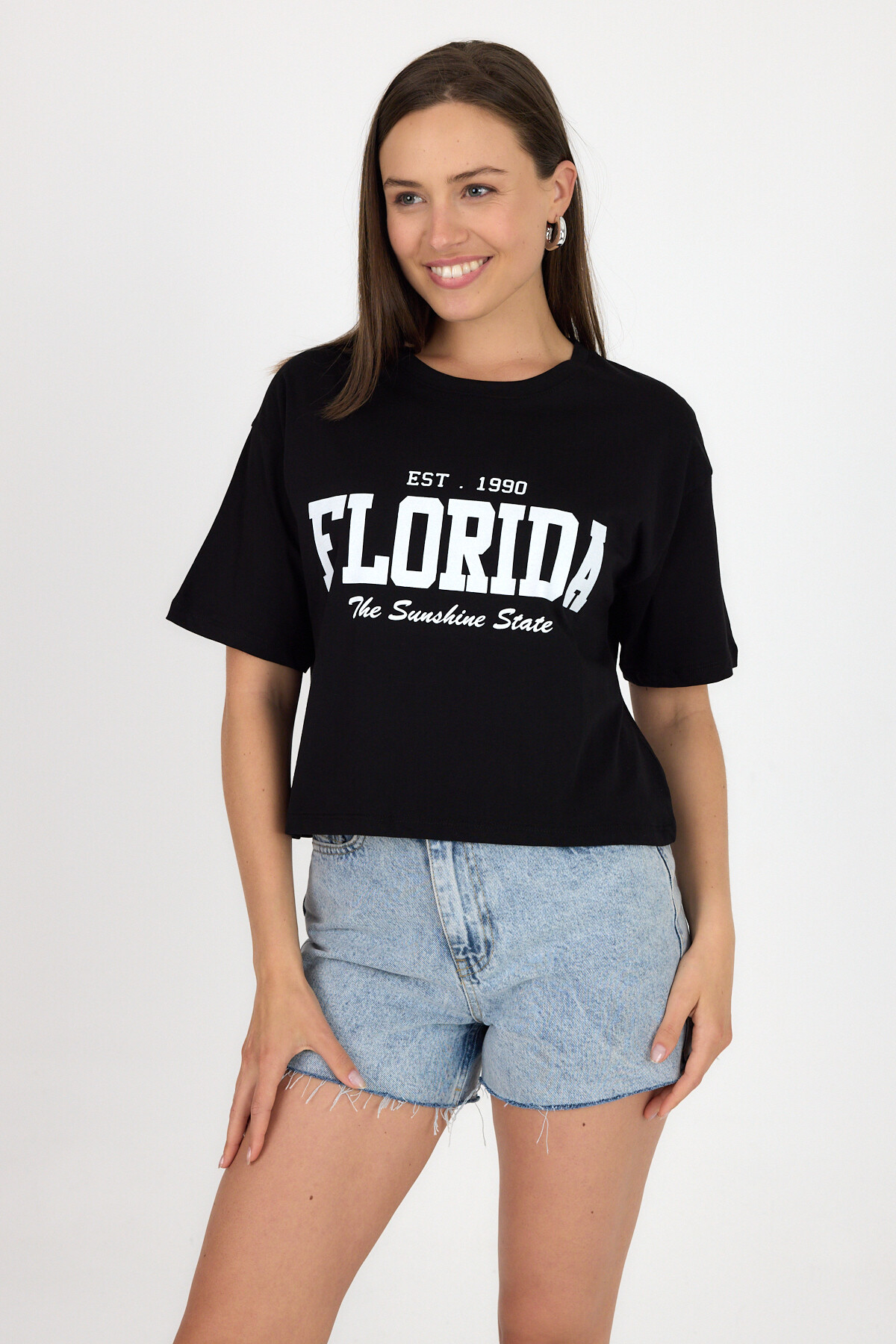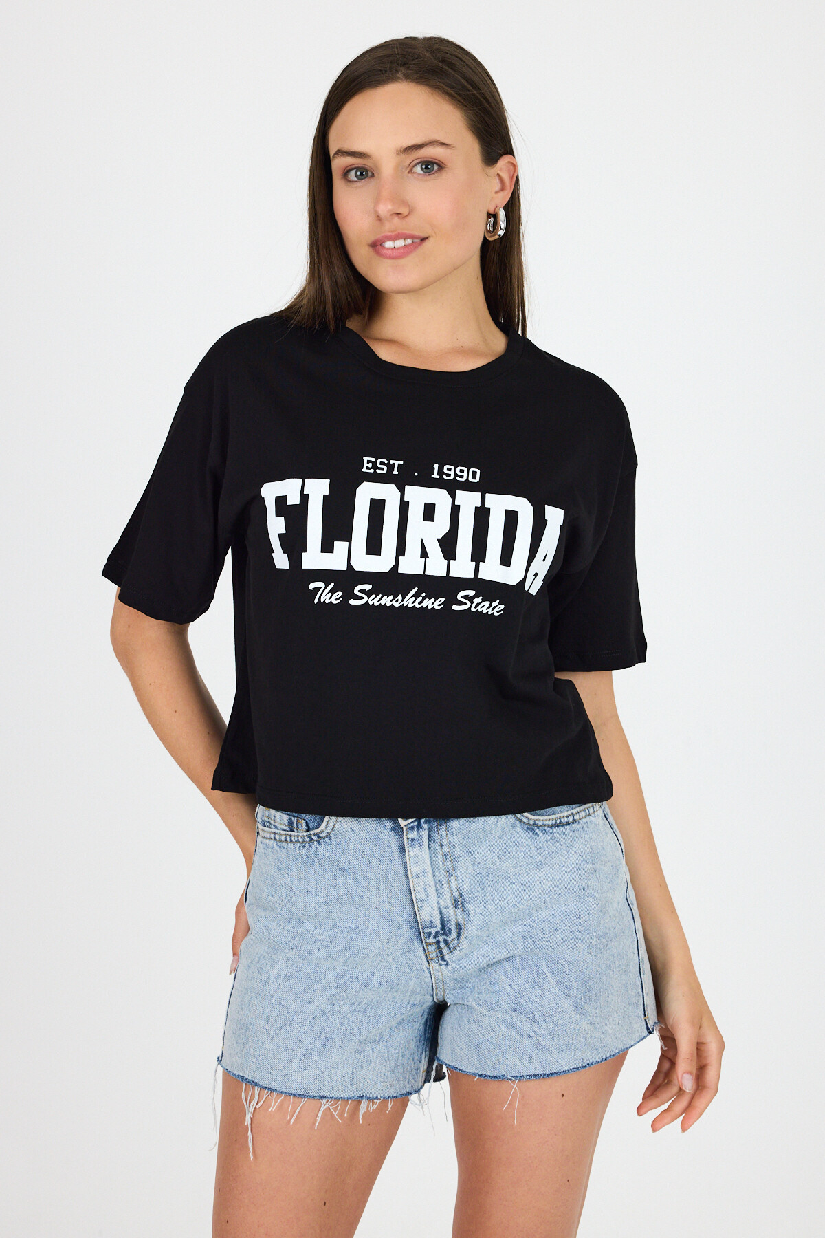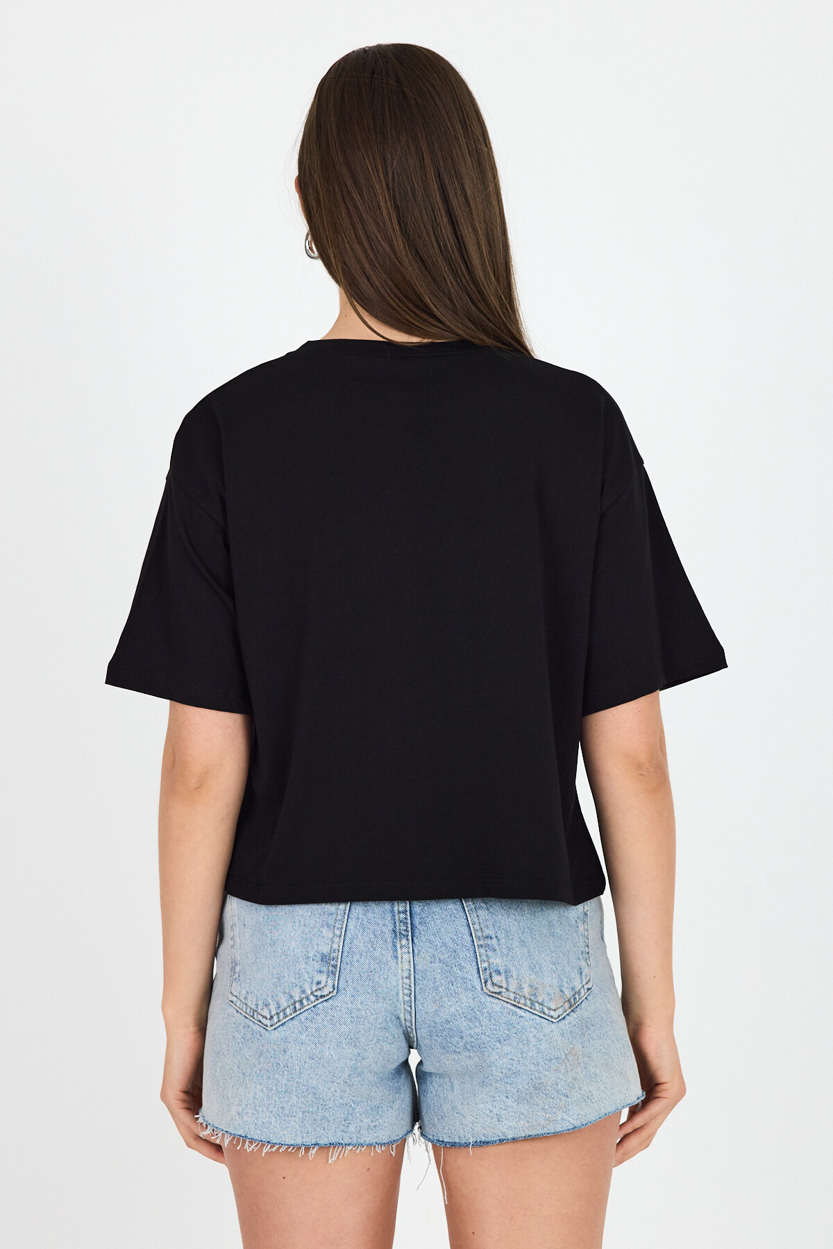 Siyah Yazı Baskılı %100 Pamuk Crop Tişört 9188M