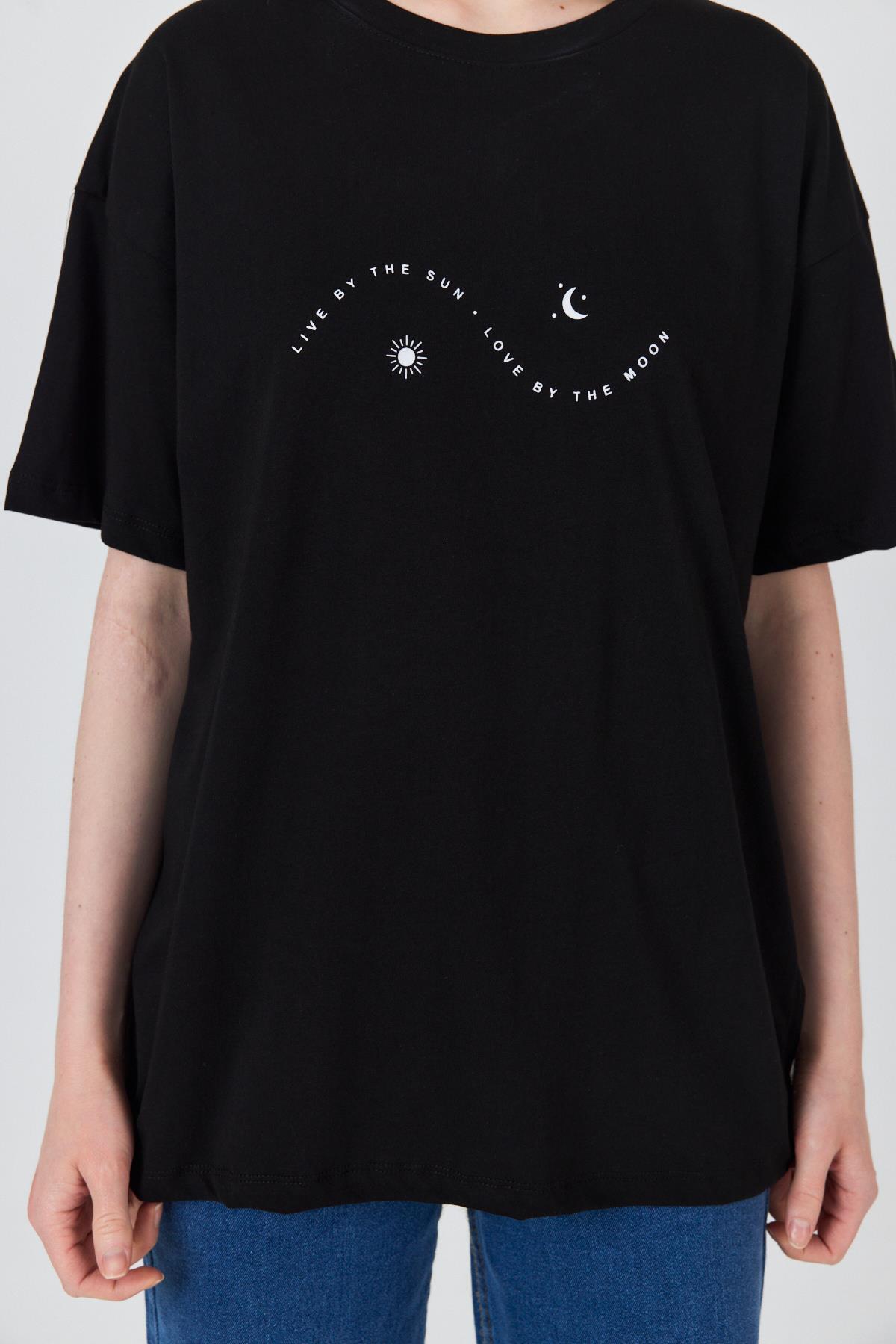 Siyah Yazı Baskılı Oversize Pamuklu Tişört 2150-32M
