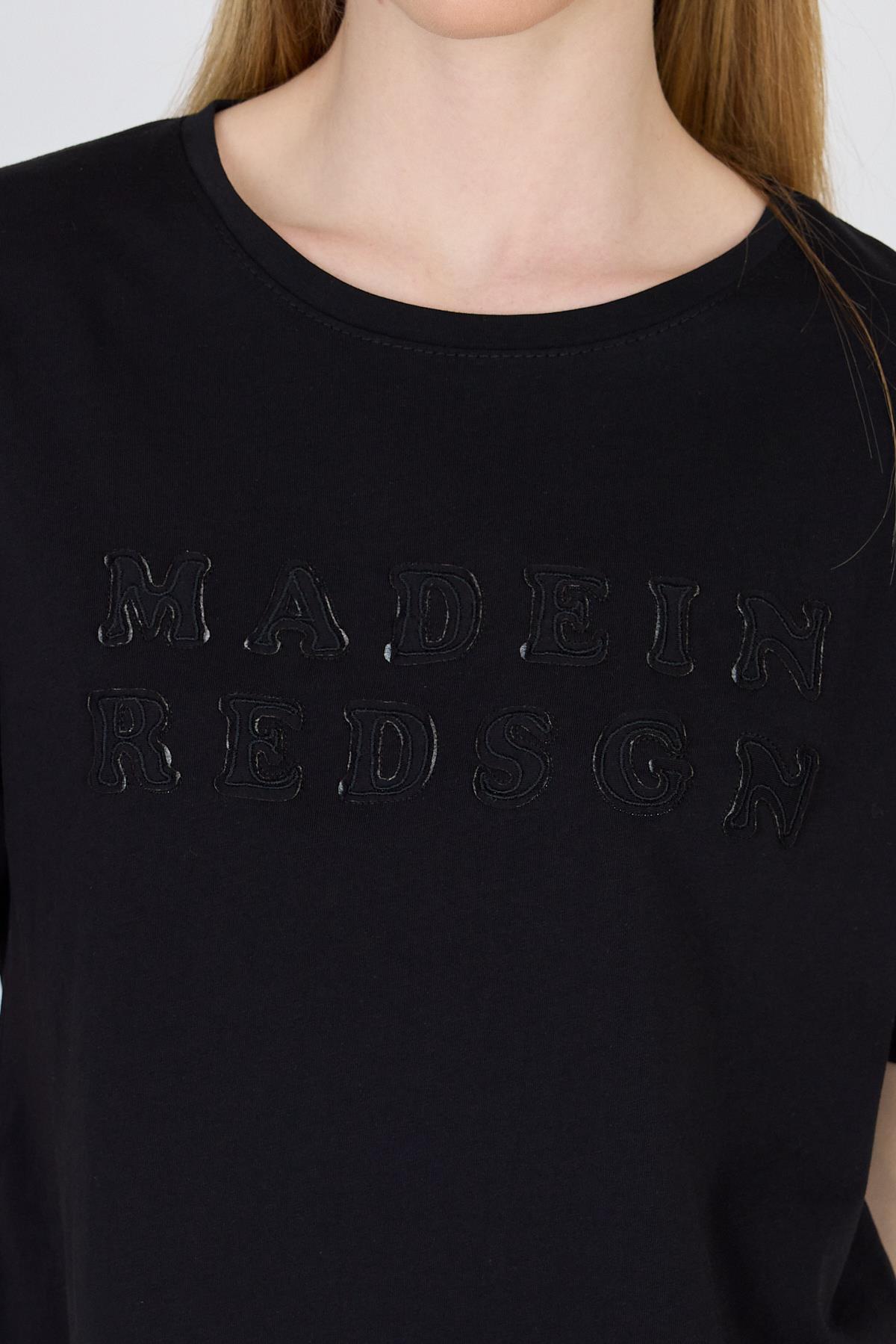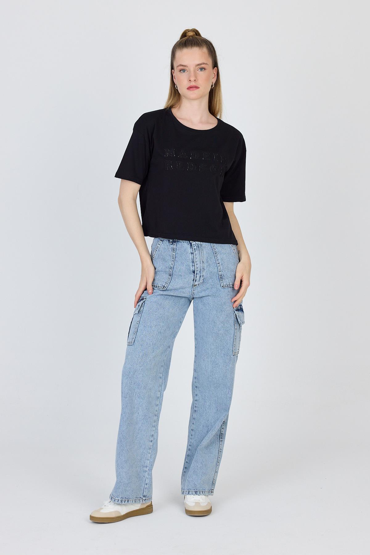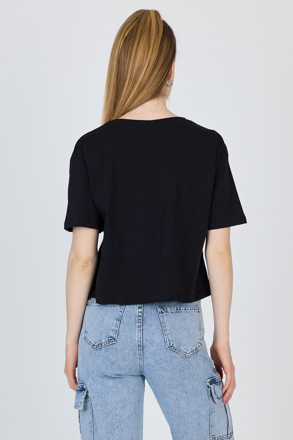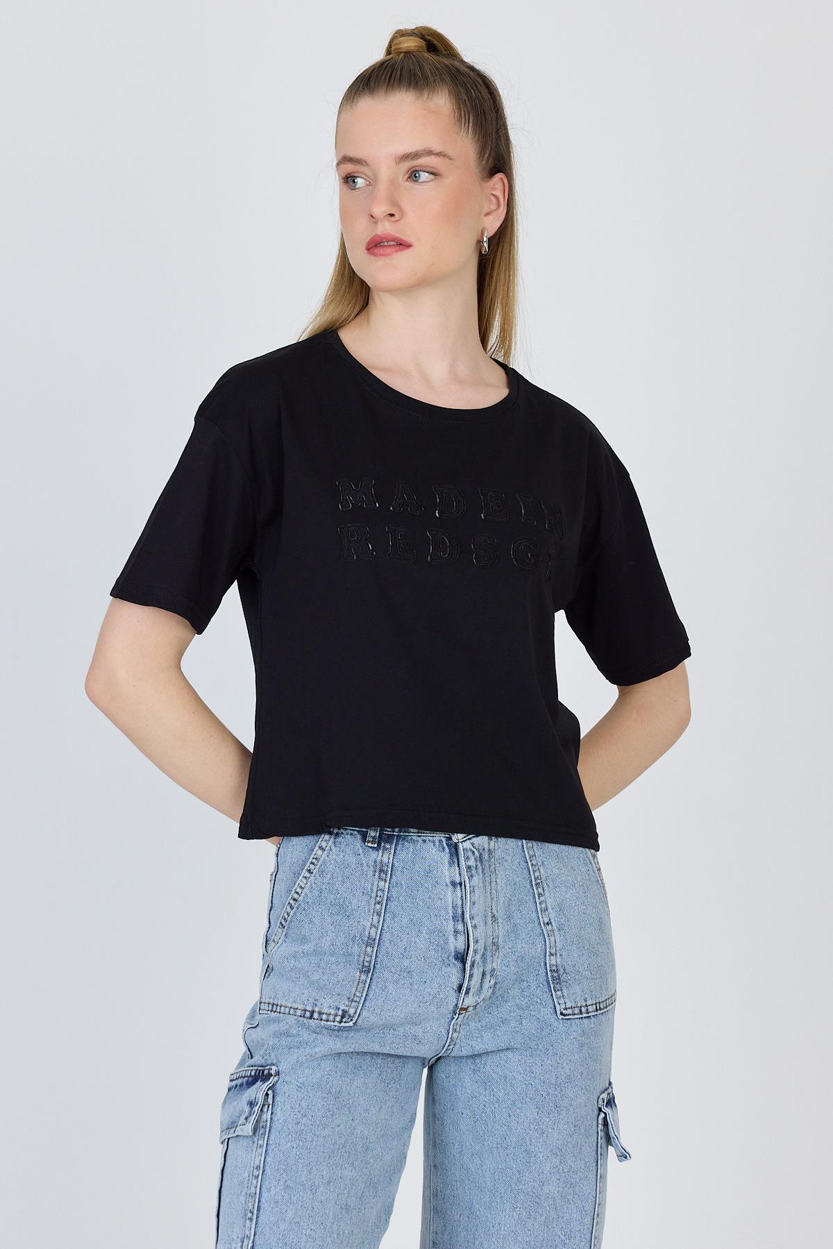 Siyah Yazı Nakışlı Crop Tişört 25259