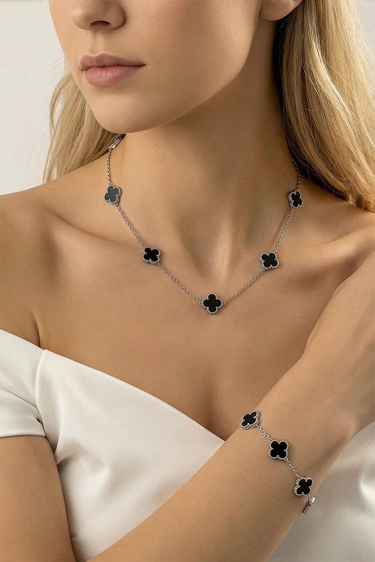Siyah Yonca Figürlü Kolye Bileklik Seti Gümüş 0133
