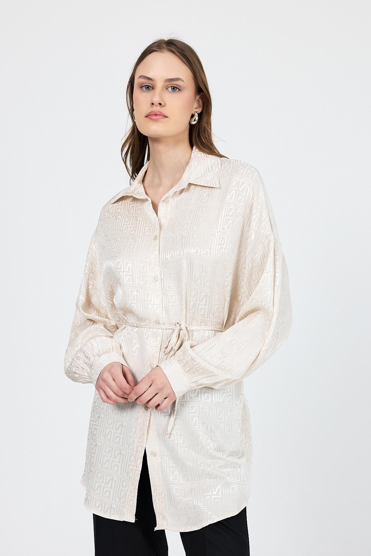 Taş Desenli Saten Görünümlü İp Bağlama Detaylı Gömlek 4293A