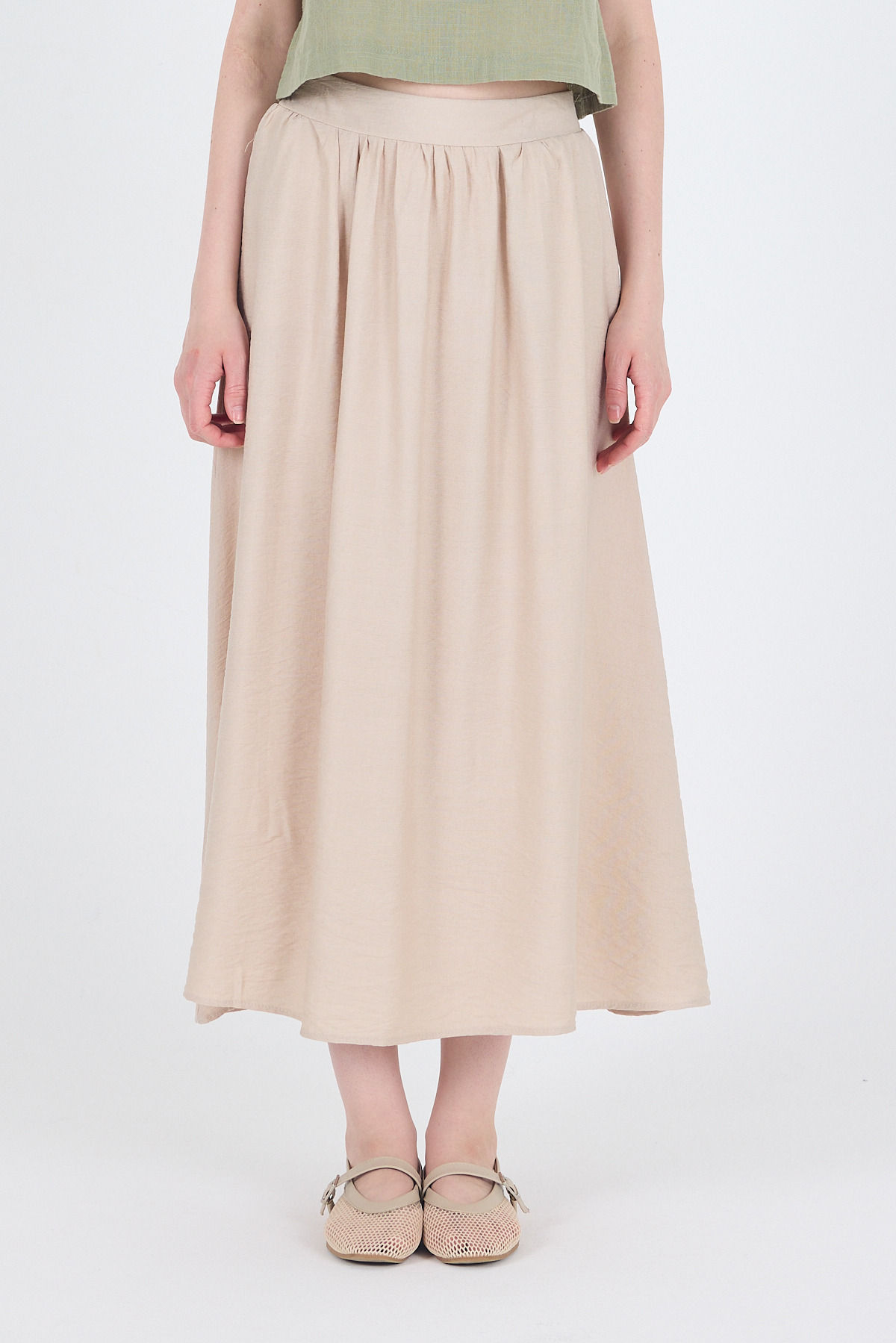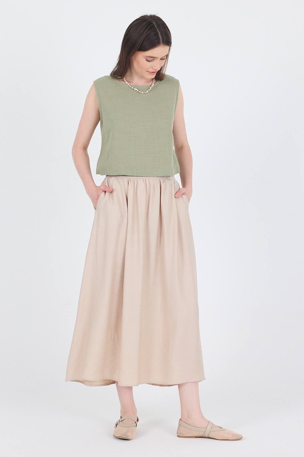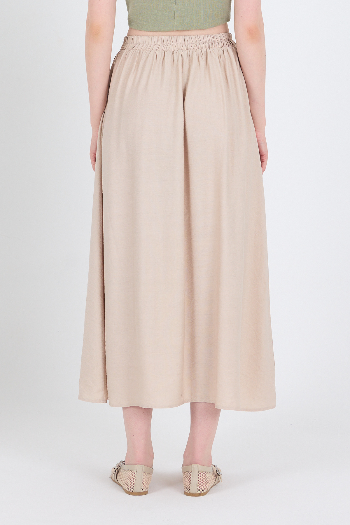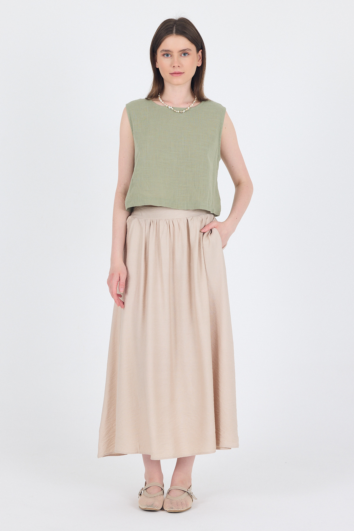 Taş Keten Görünümlü Cep Detaylı Midi Etek 2344