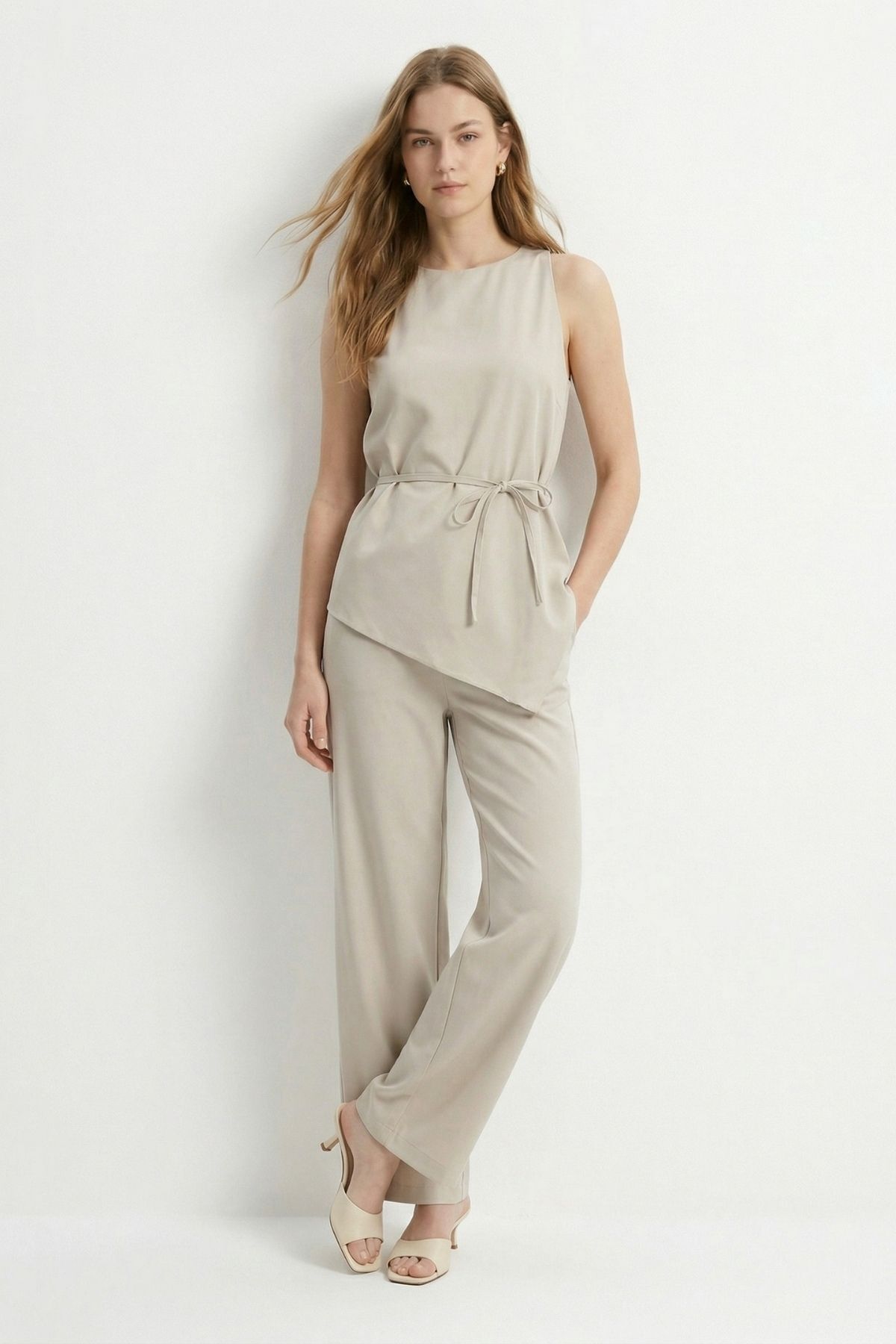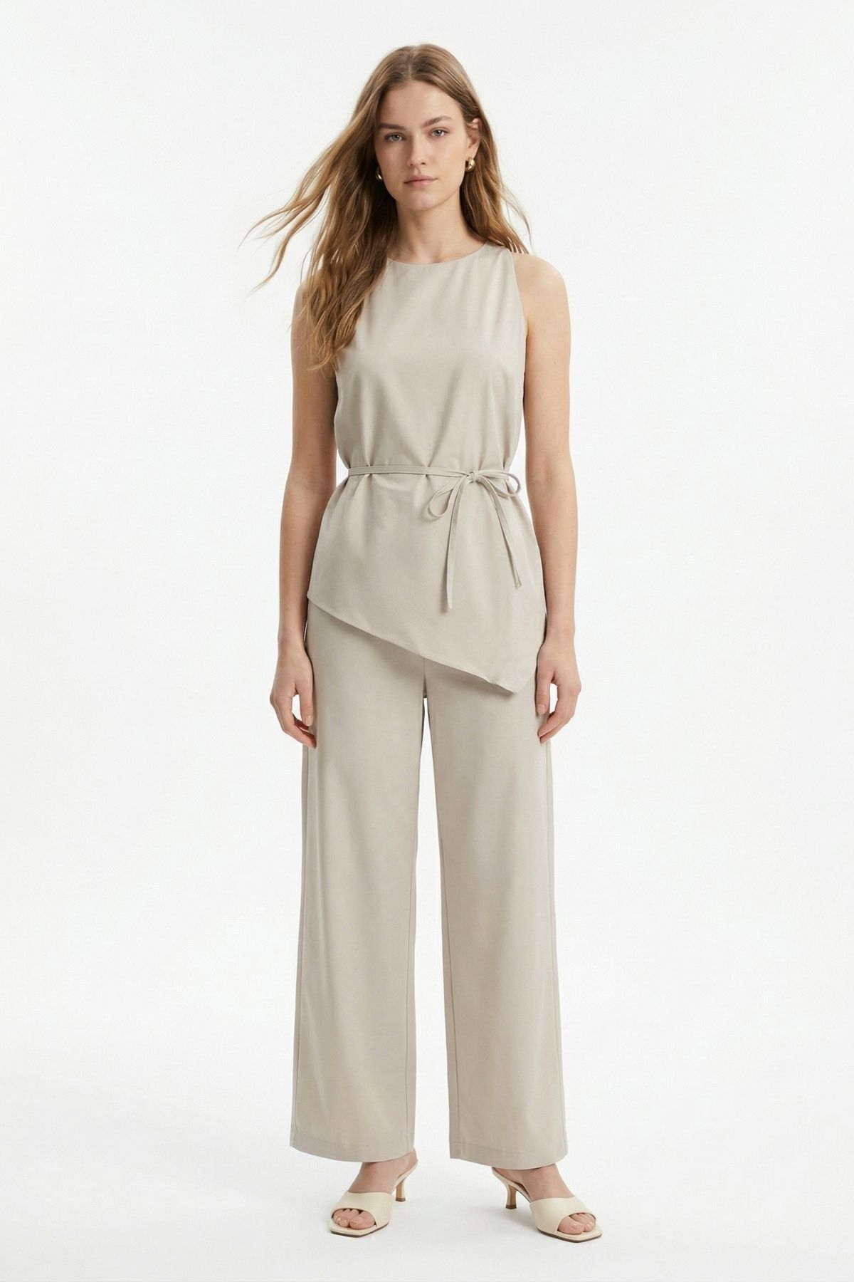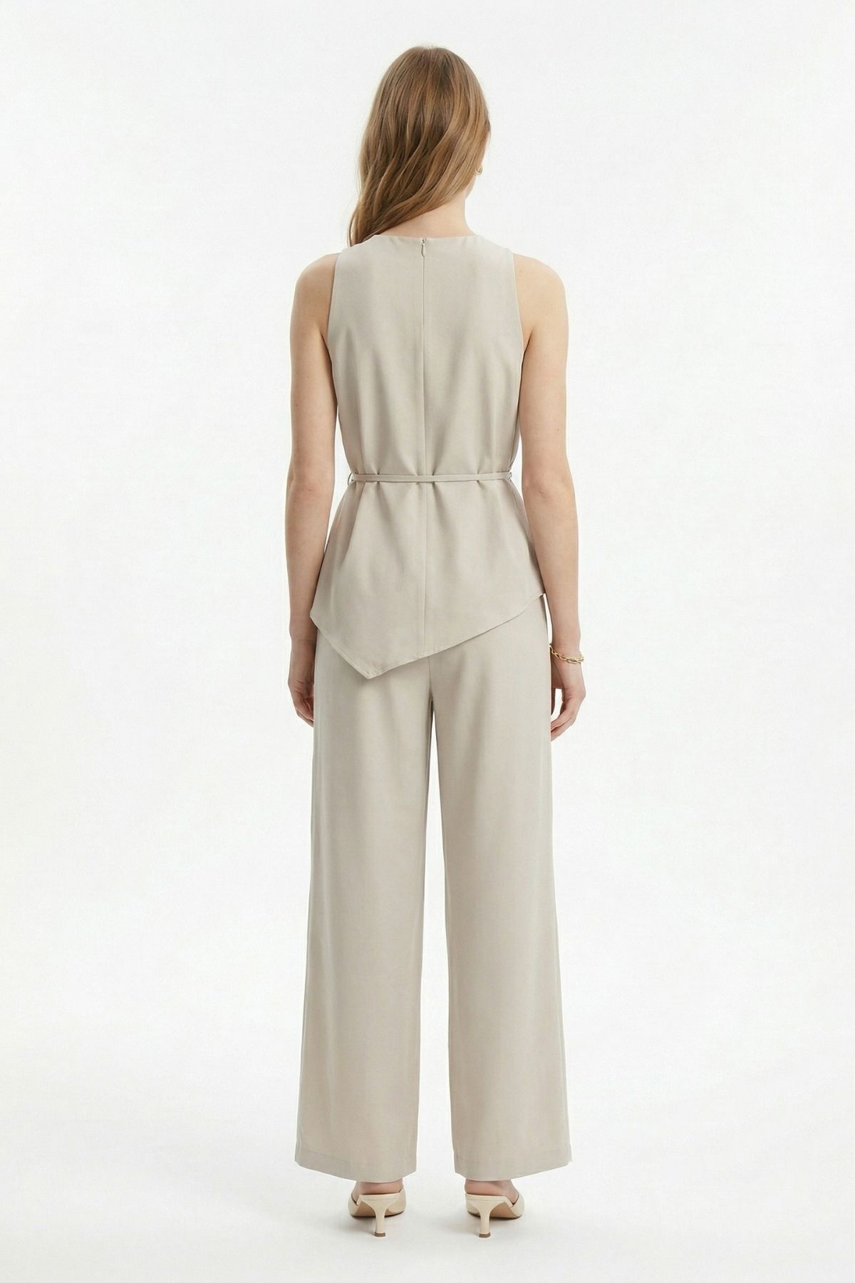Taş Sıfır Kollu Kuşaklı Asimetrik Bluz ve Bol Paça Pantolon Takım 8861