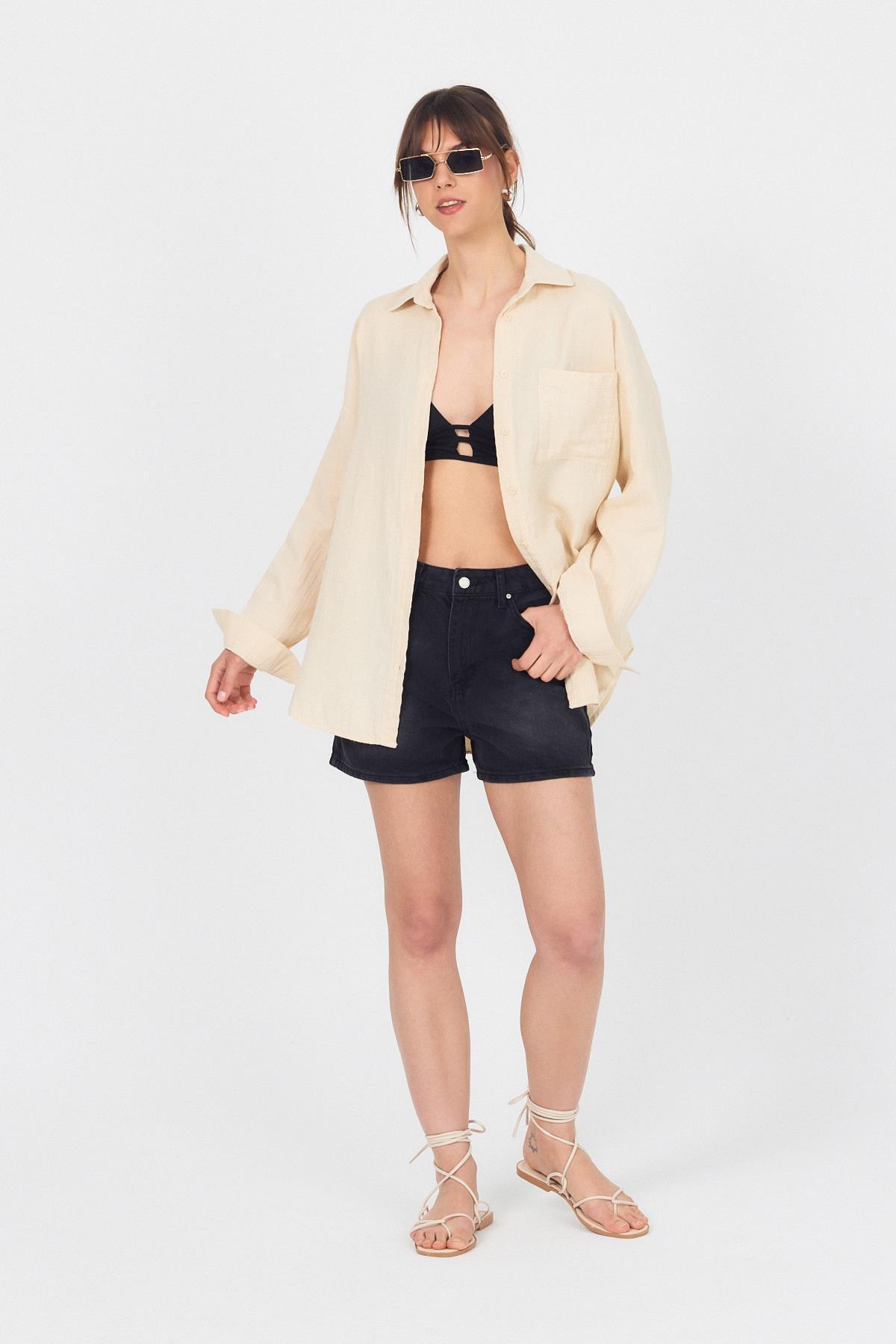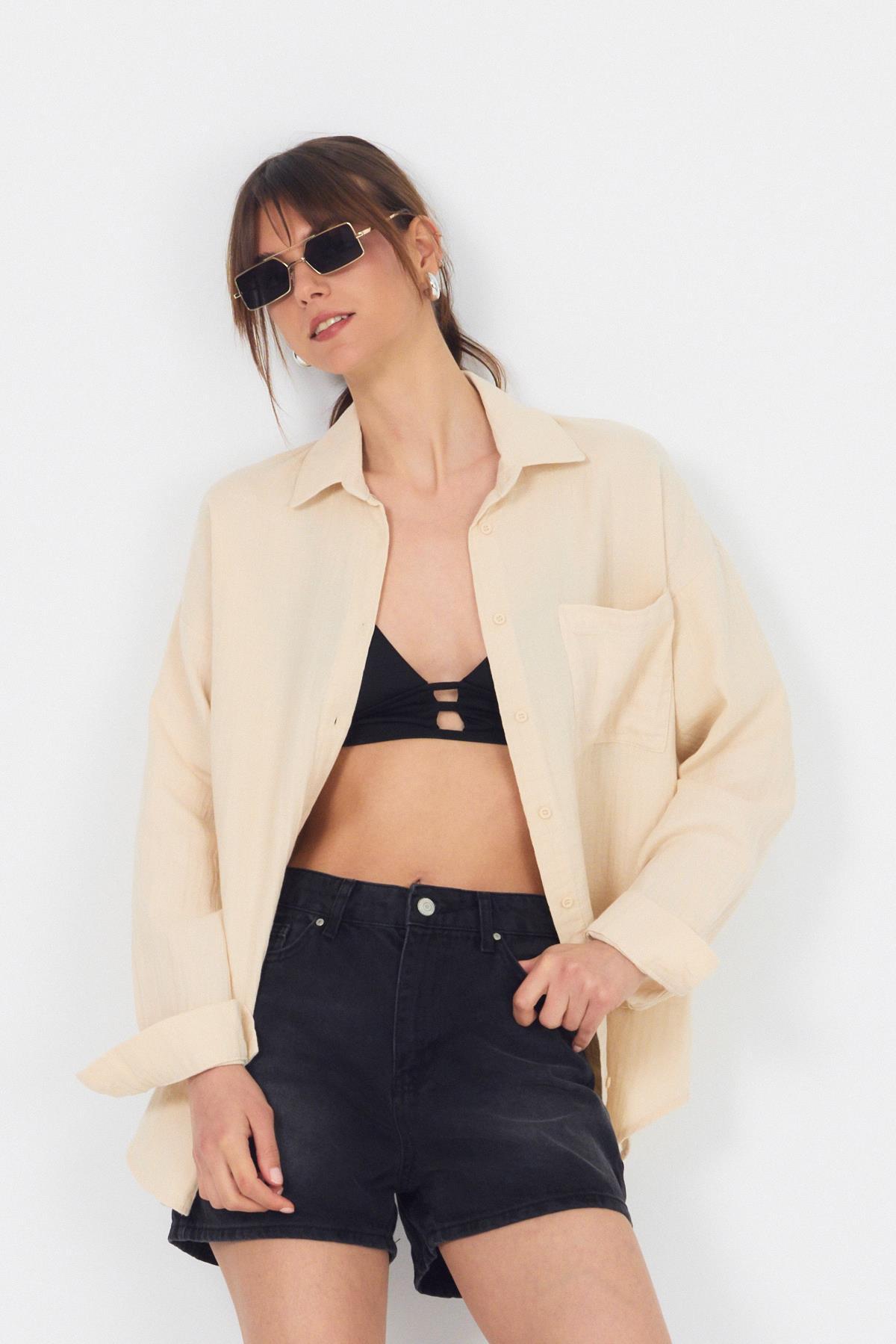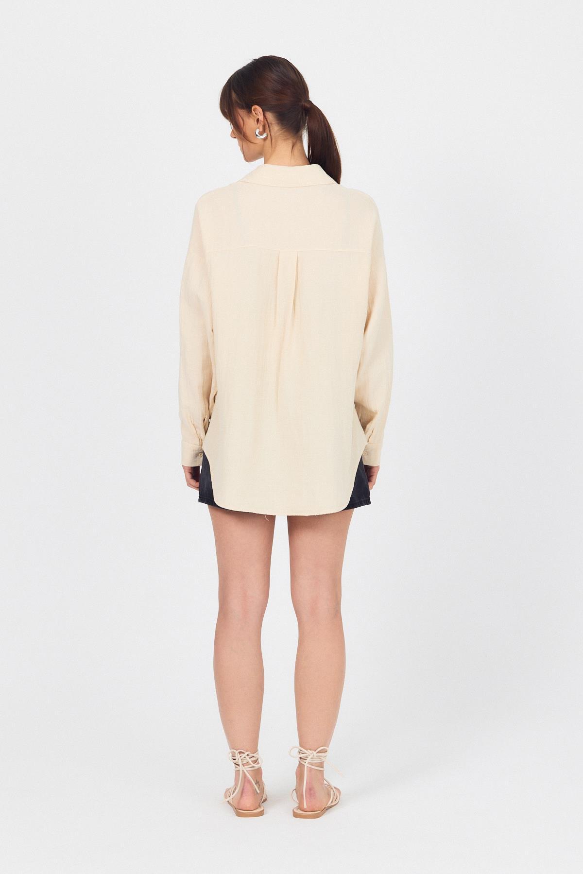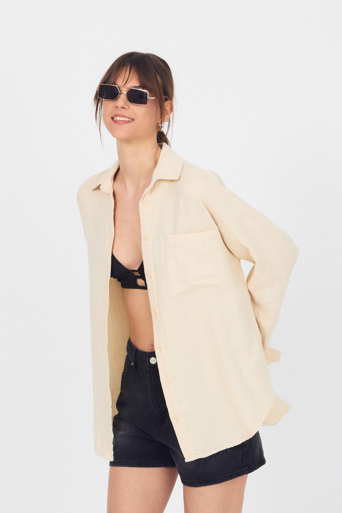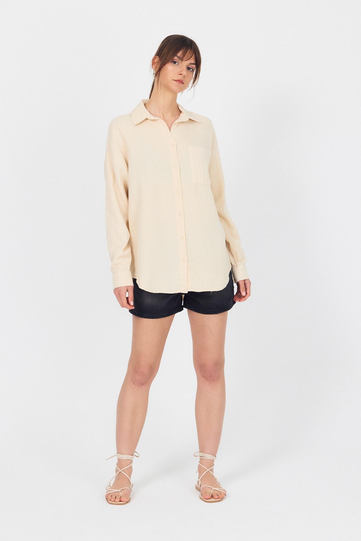 Taş Tek Cepli %100 Pamuk Oversize Müslin Gömlek 4697A