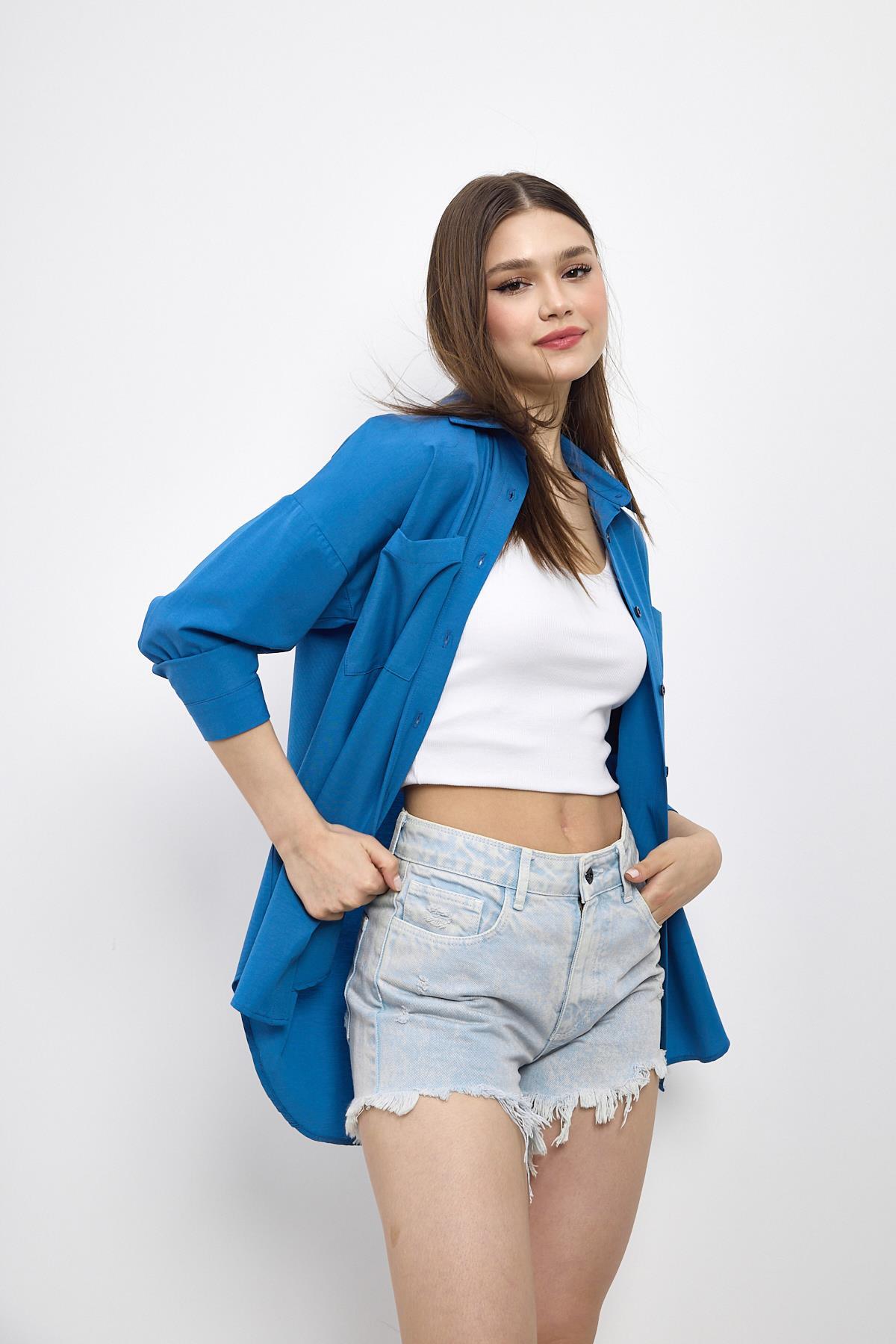 İndigo Çift Cepli Oversize Uzun Basic Gömlek TCR 6256A