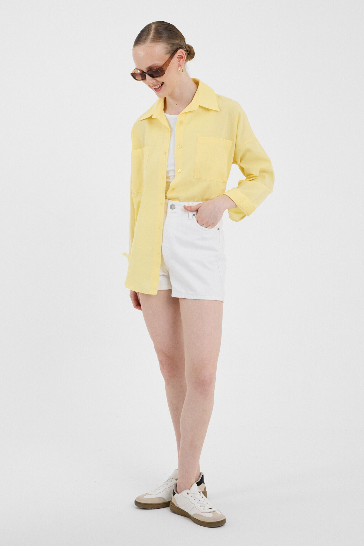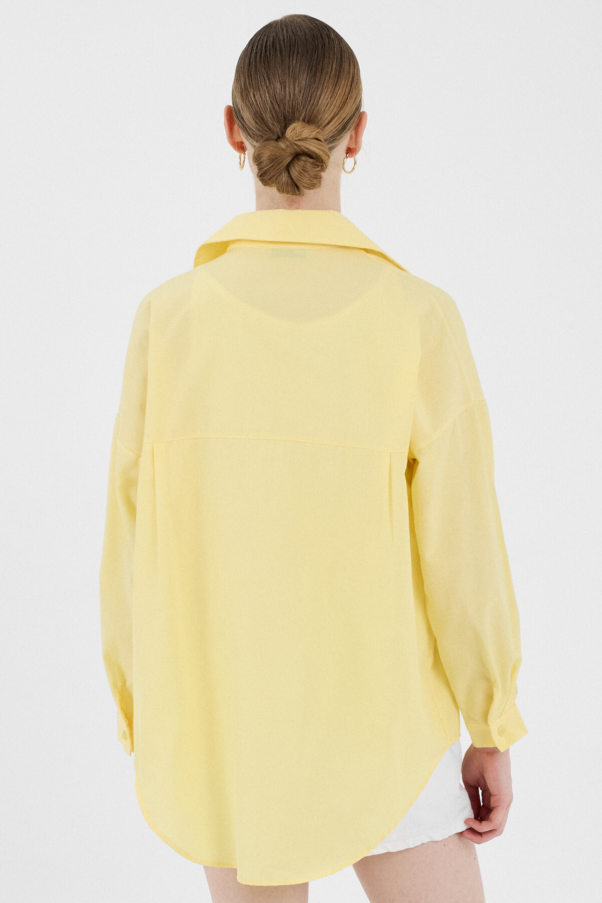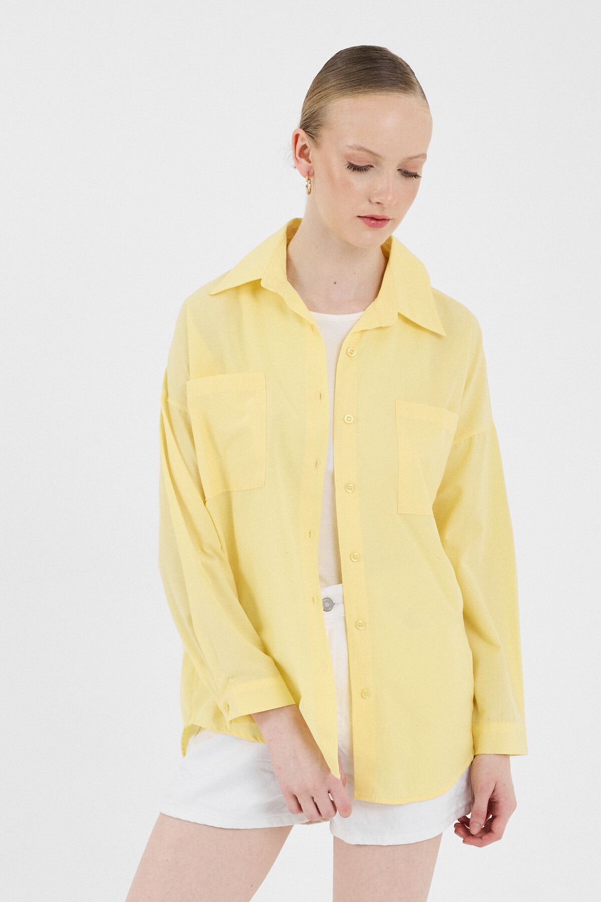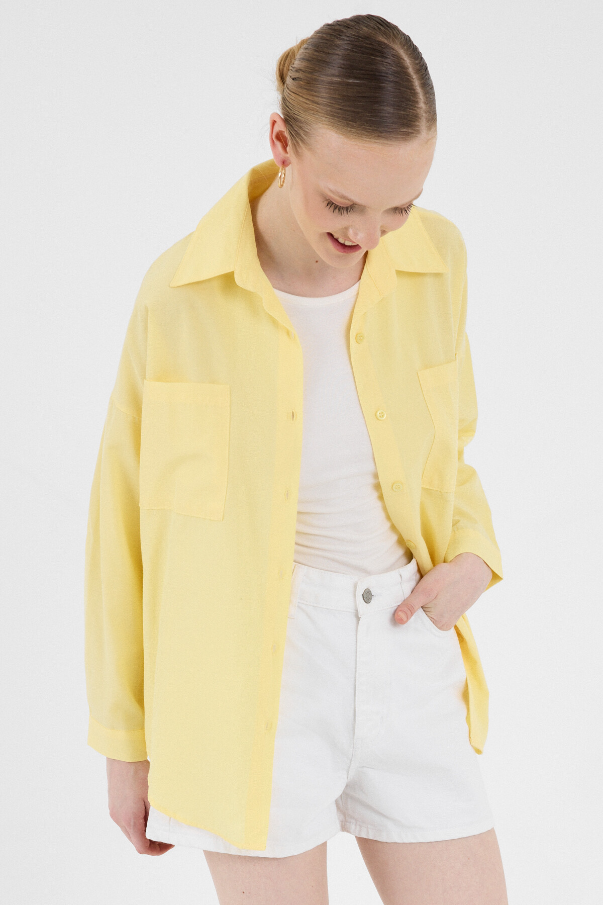 Tereyağ Sarısı Çift Cepli Oversize Uzun Basic Gömlek TCR 6256A