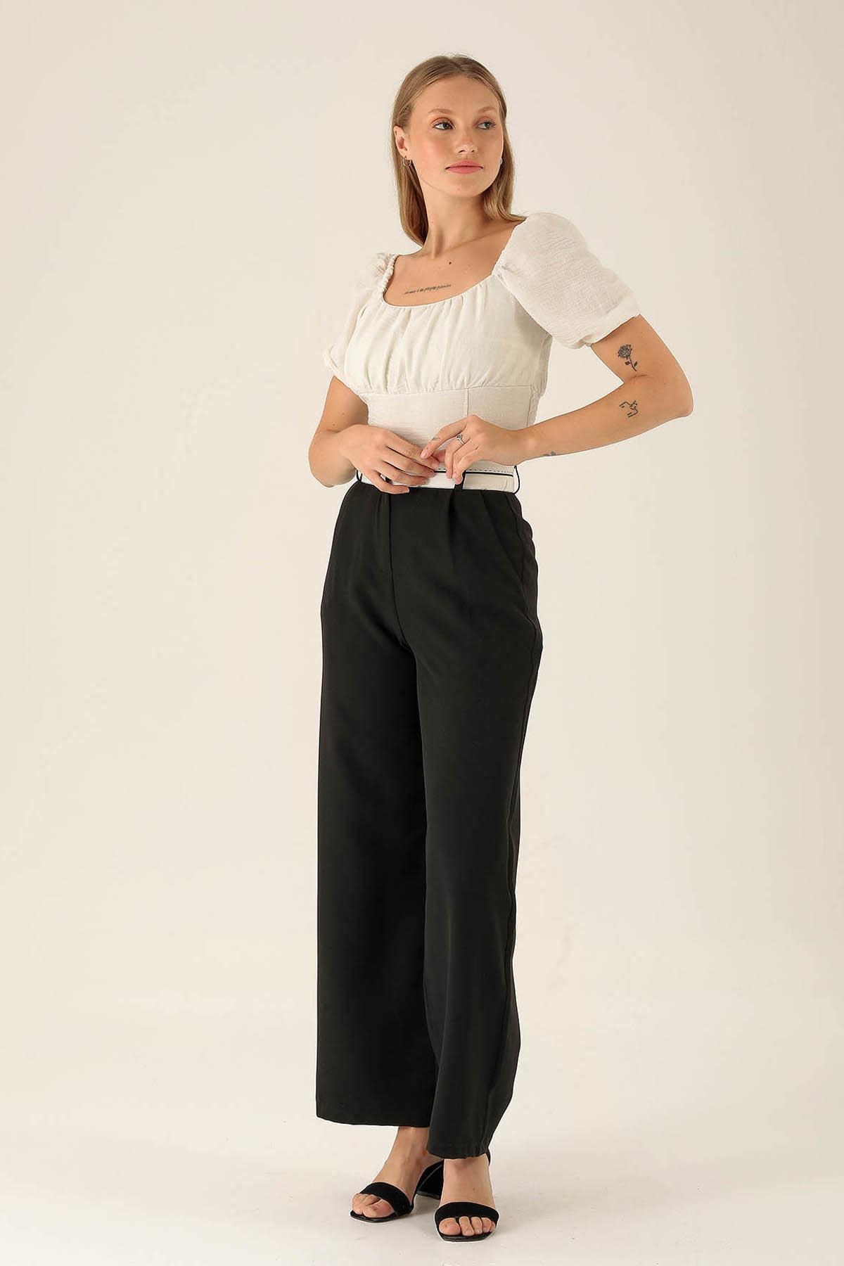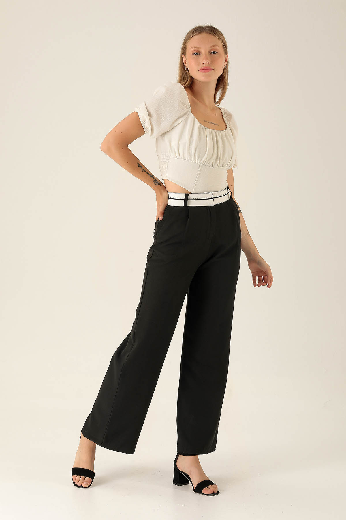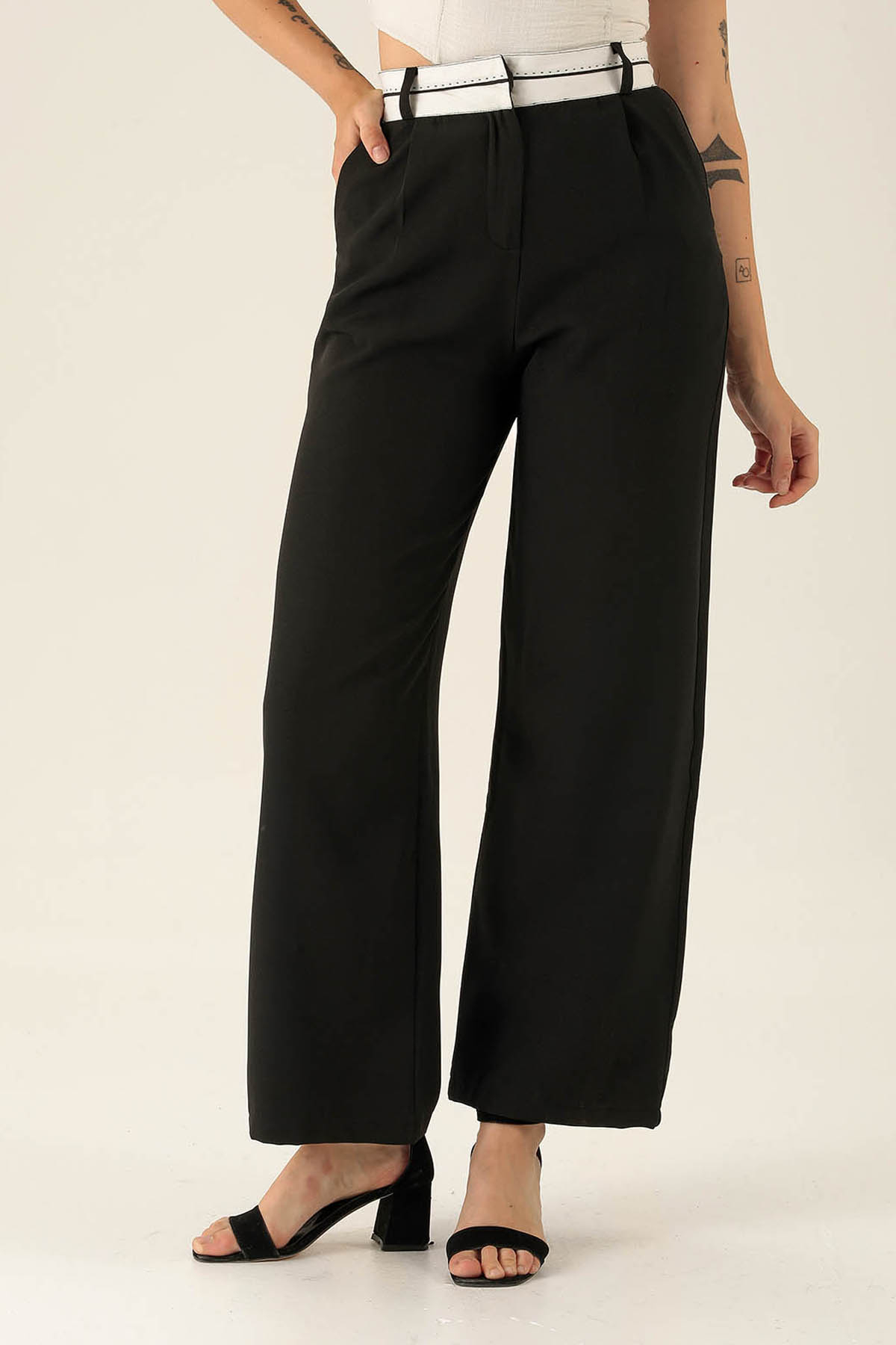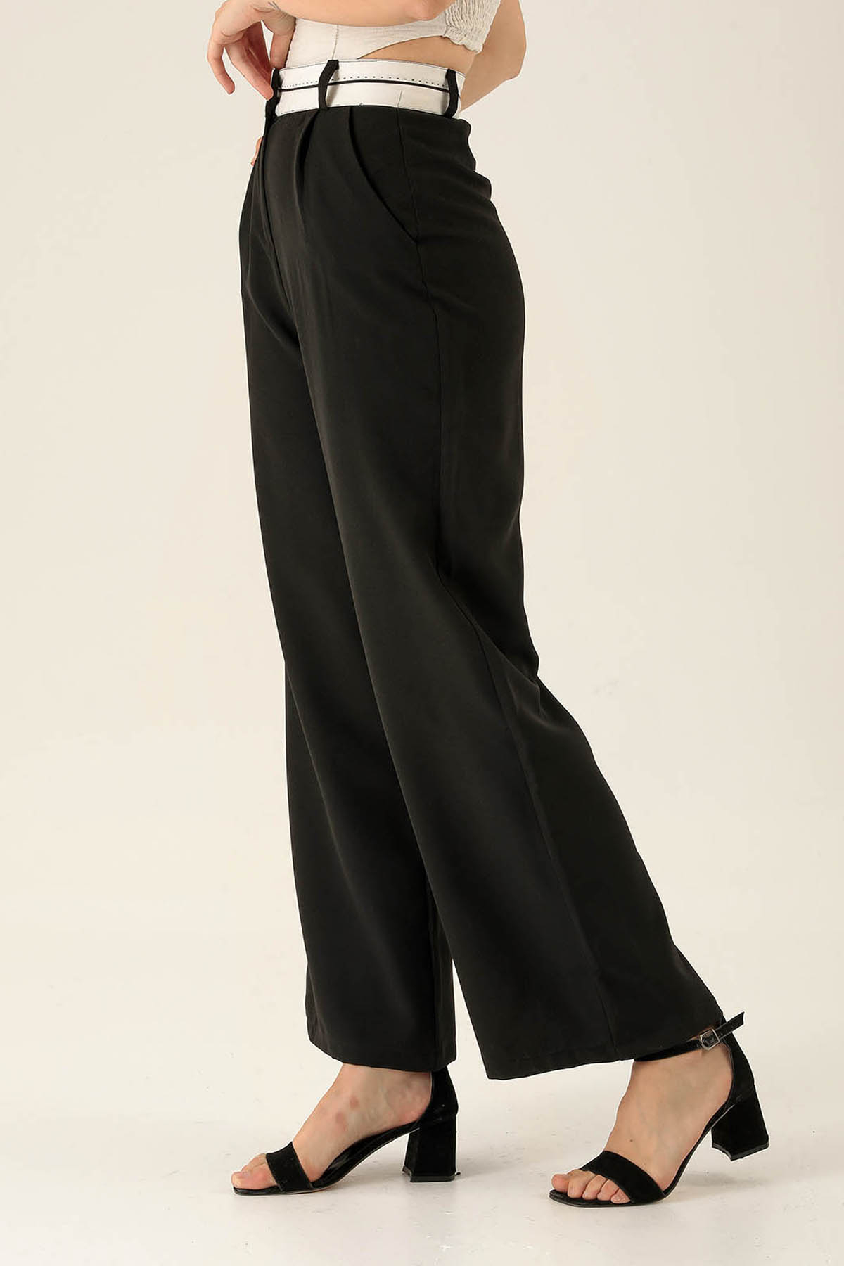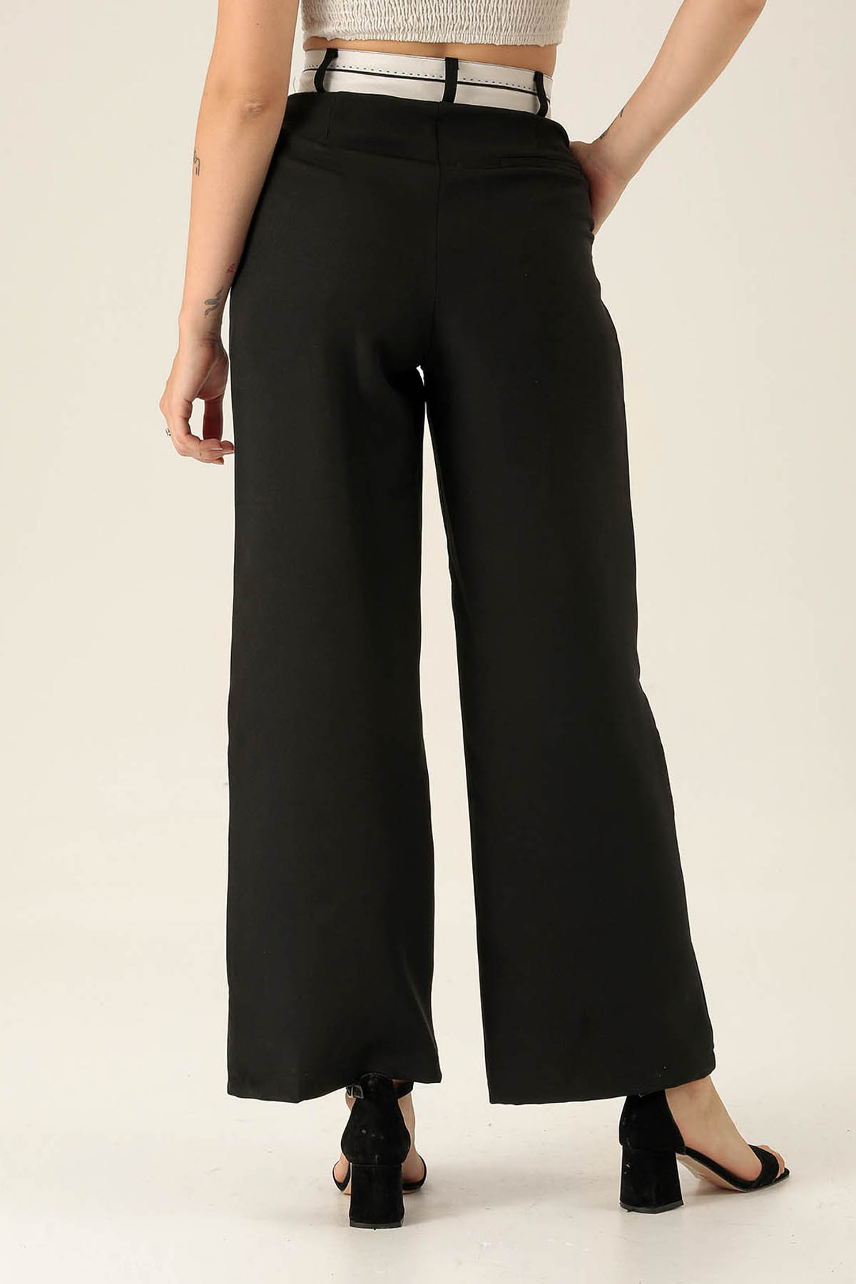 Ters Dikiş Bayan Kemer Palazzo Bayan Pantolon - 6643A Siyah