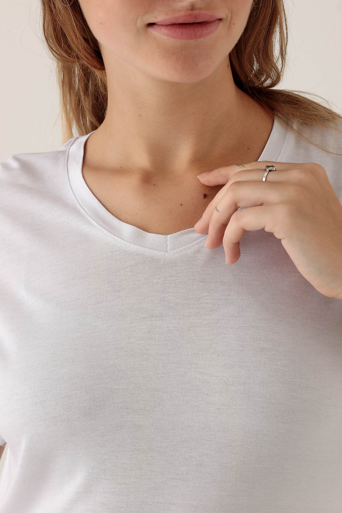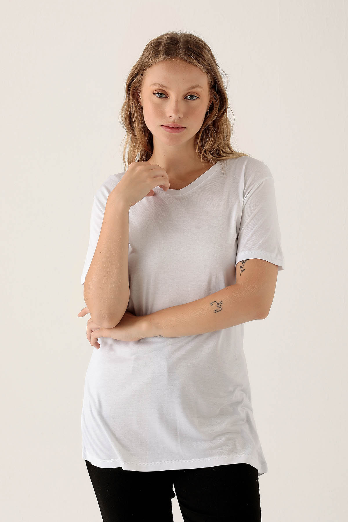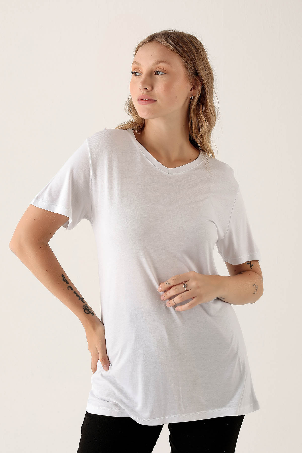 V Yaka Basic Bayan Tişort - 2209 Beyaz