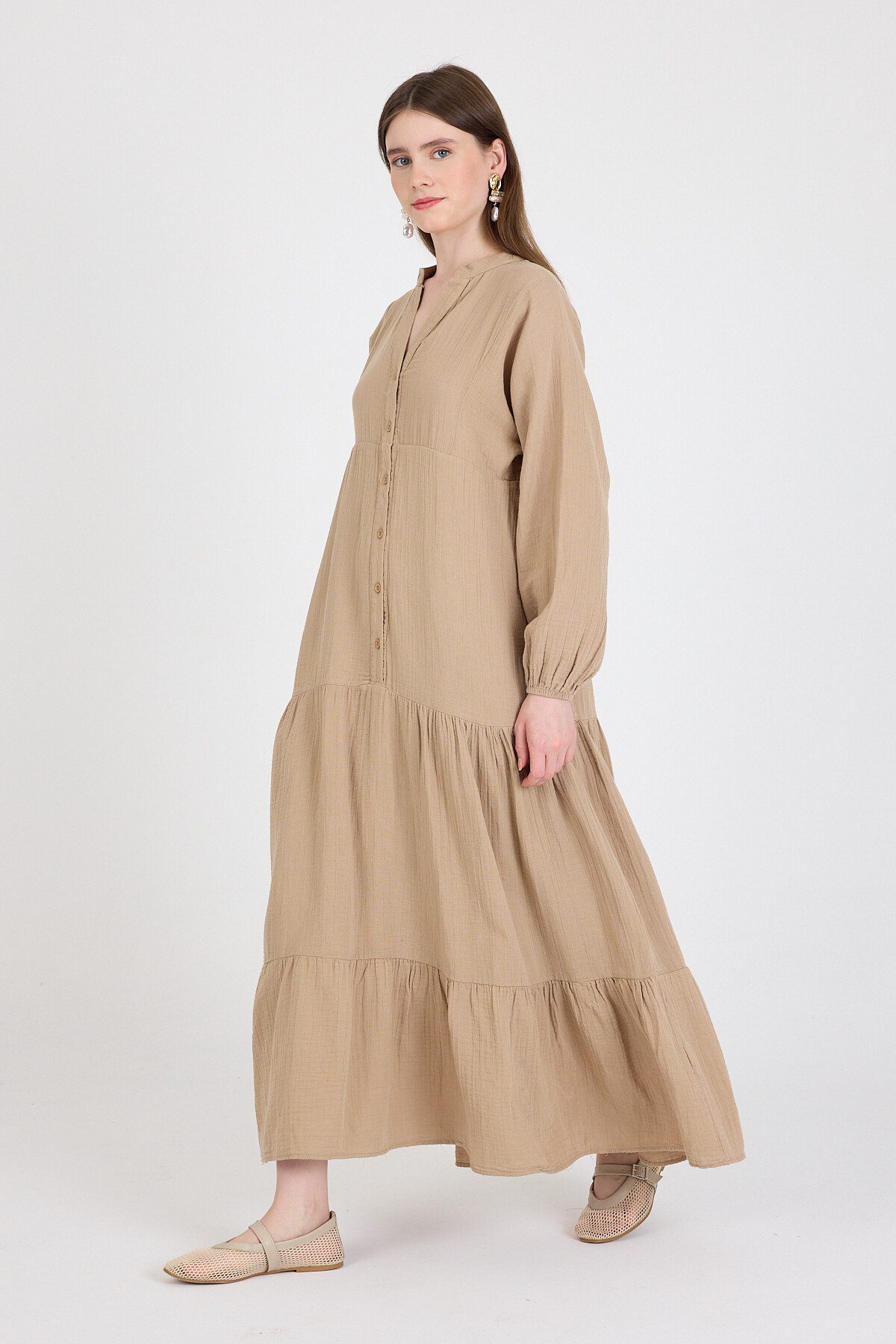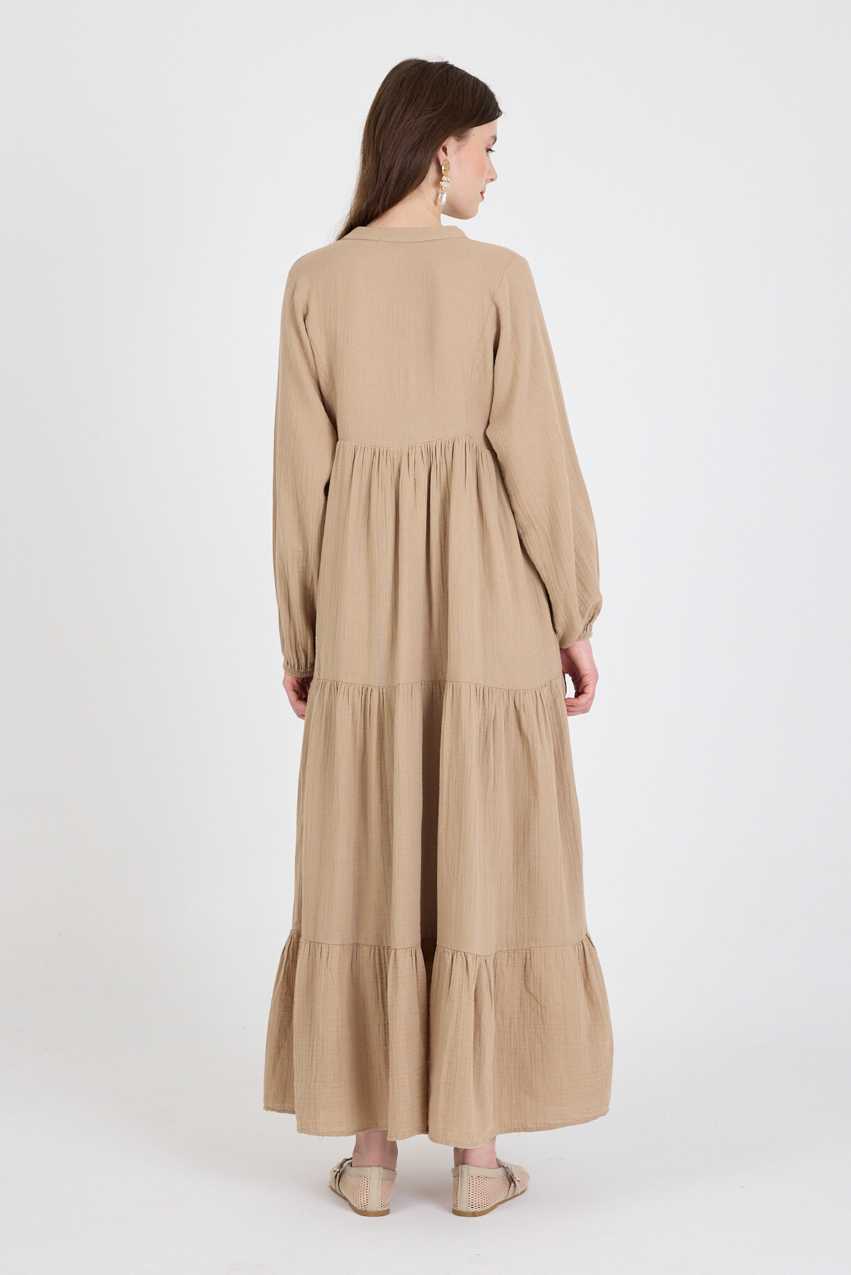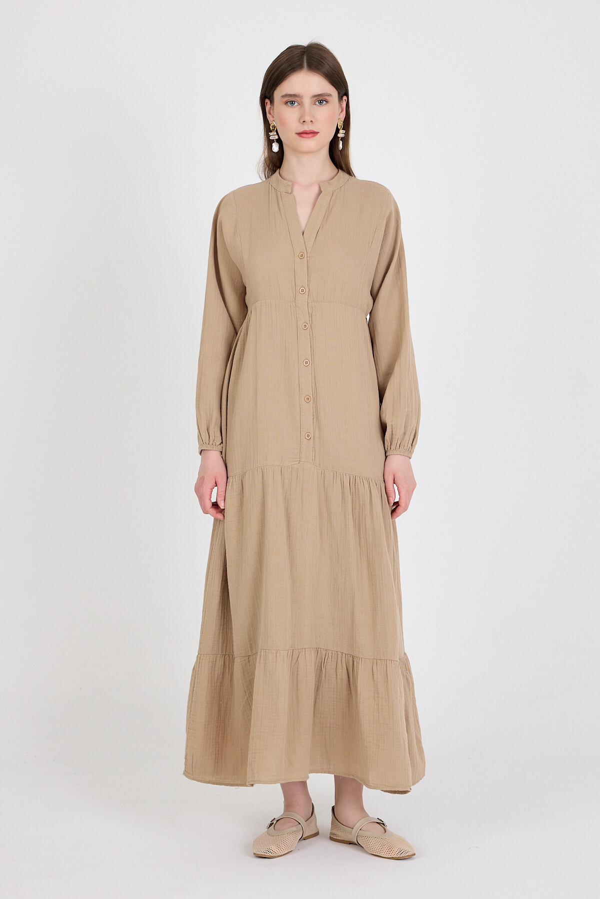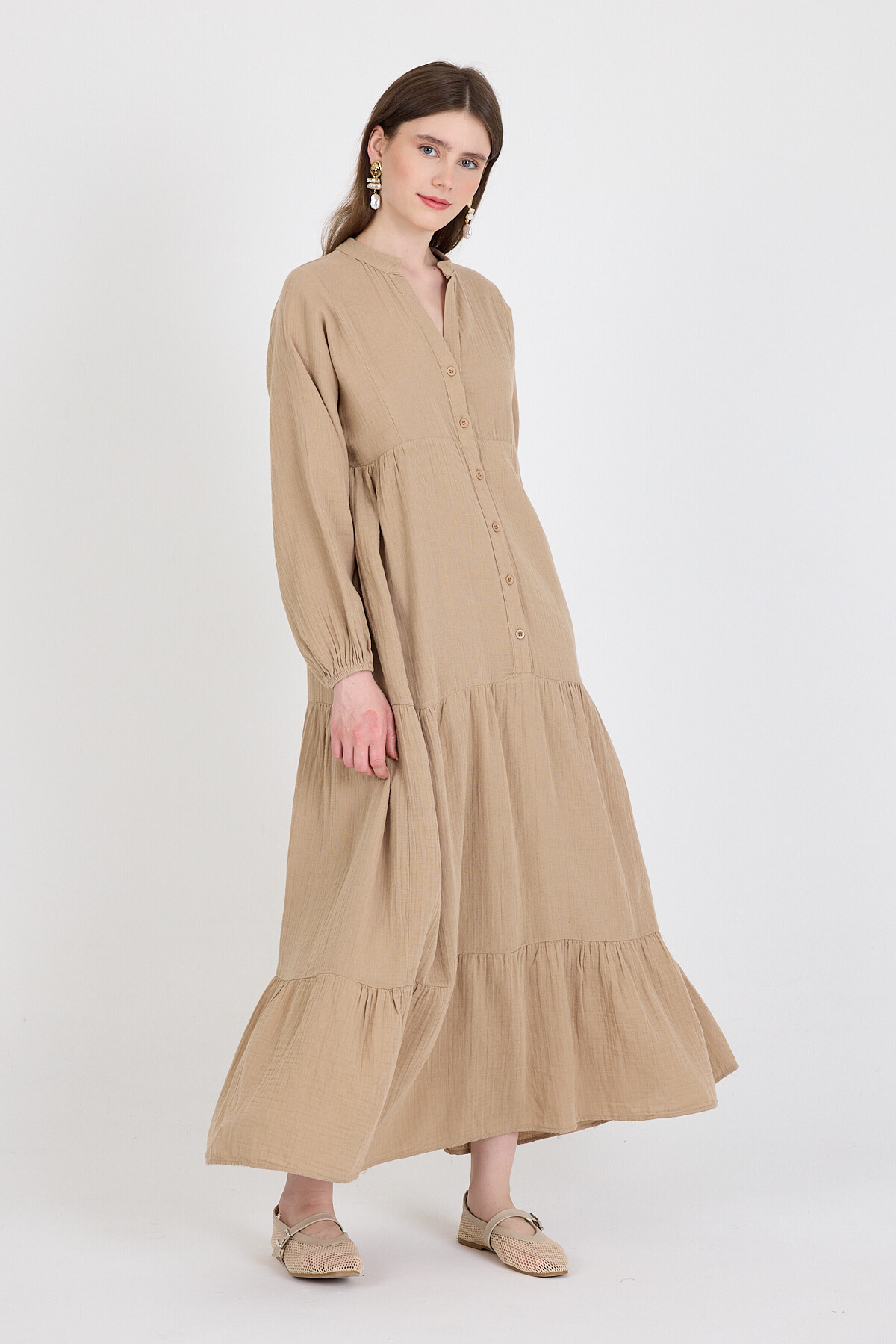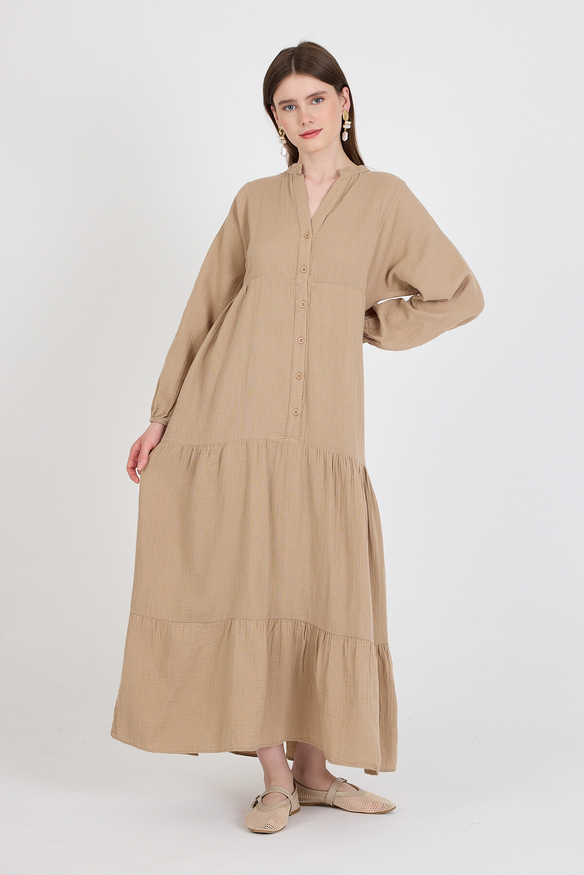 Vizon %100 Pamuk Düğmeli Kat Etekli Uzun Kollu Elbise 4782A
