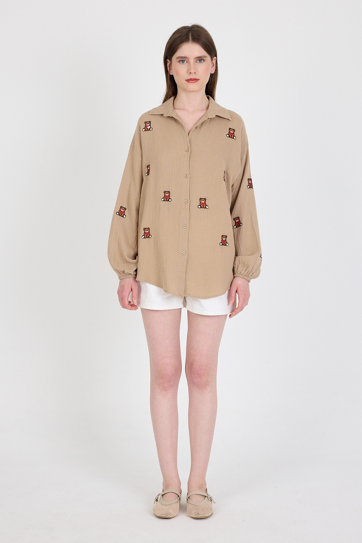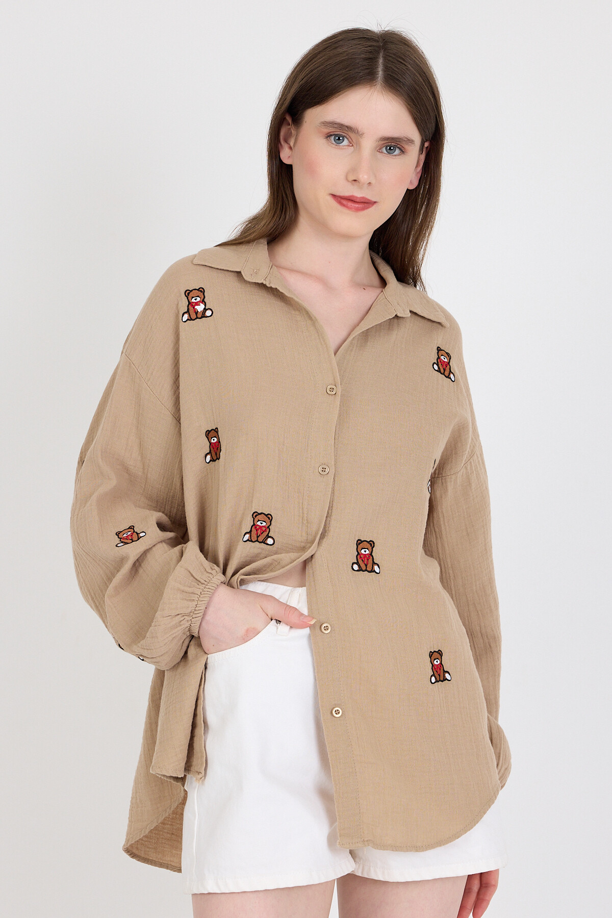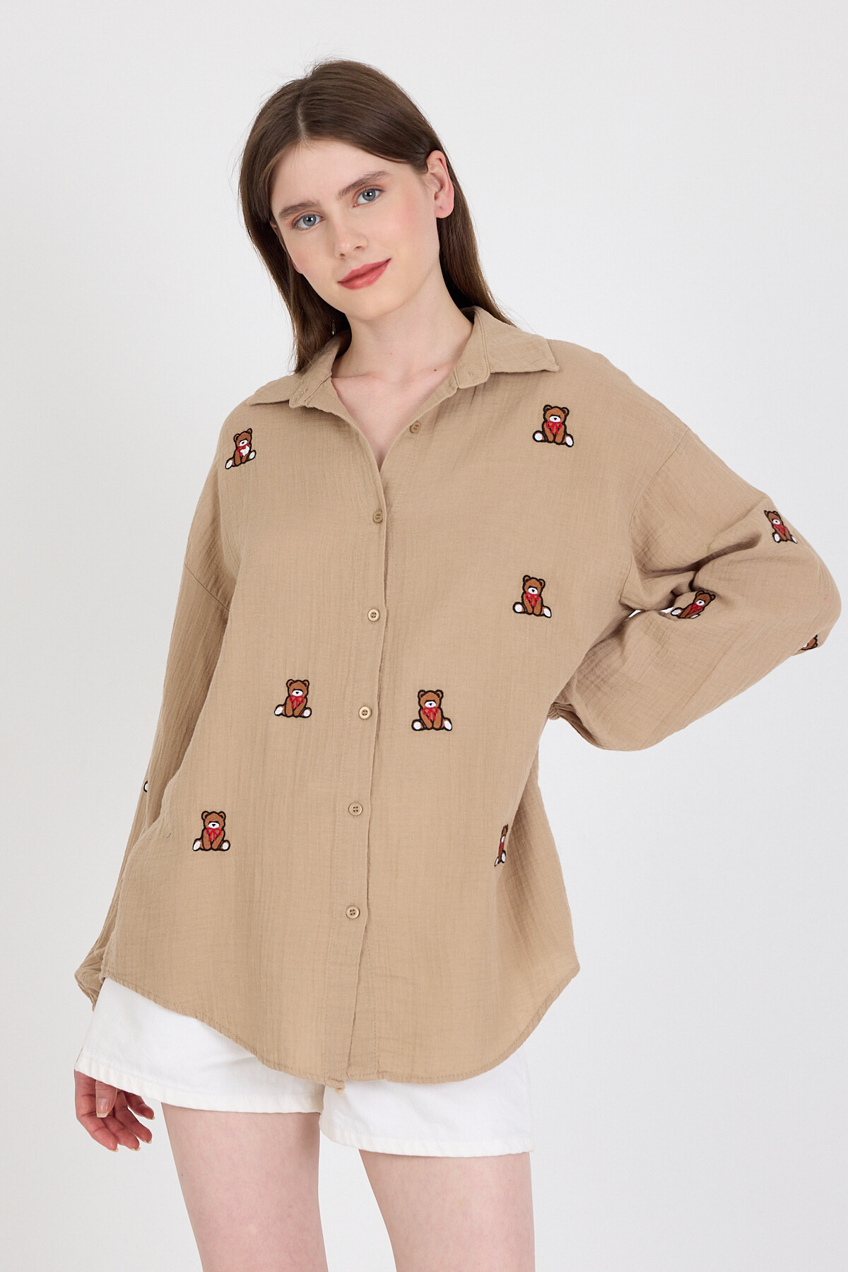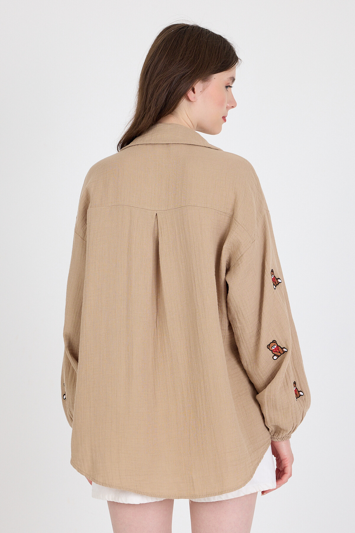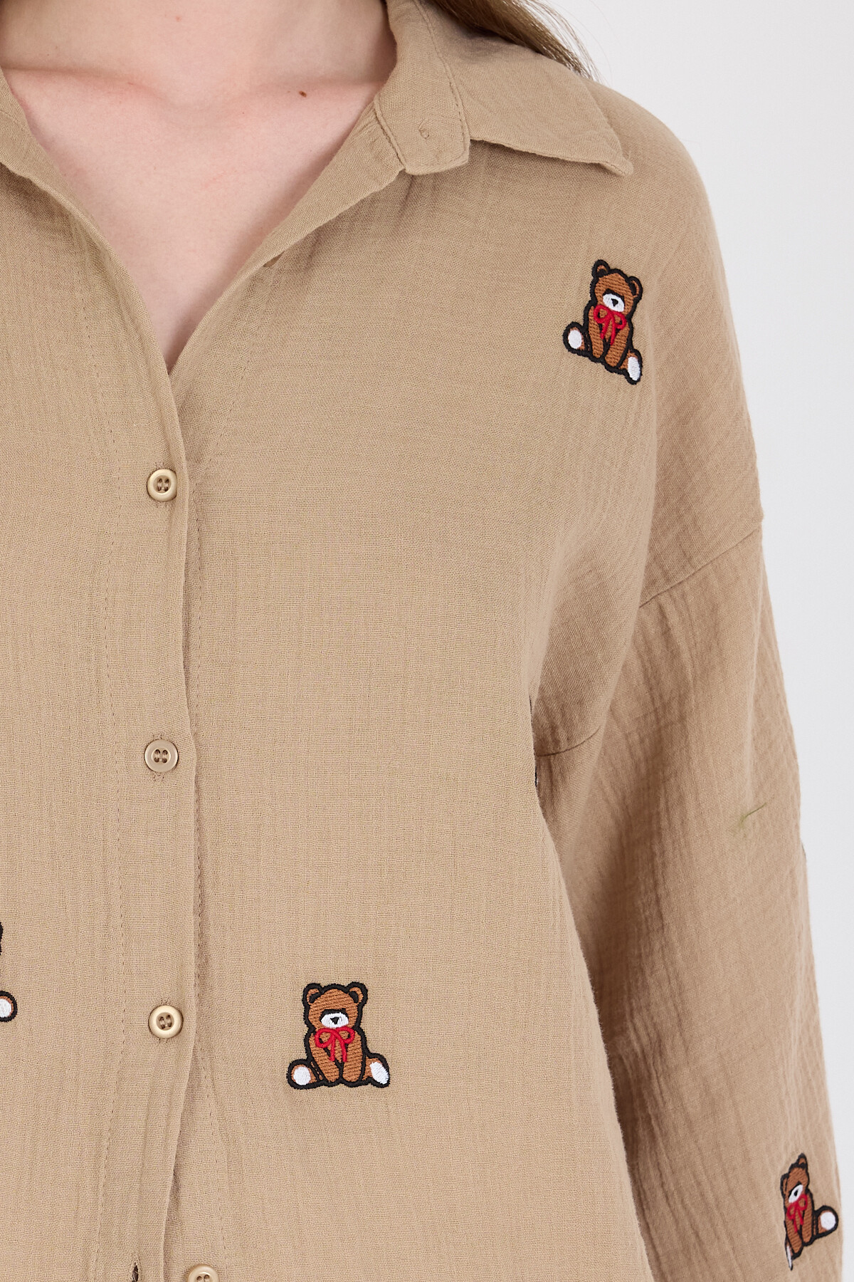 Vizon Keten Görünümlü %100 Pamuk Ayıcık Nakışlı Gömlek 4798A