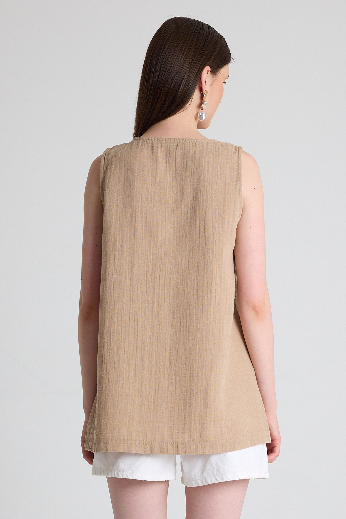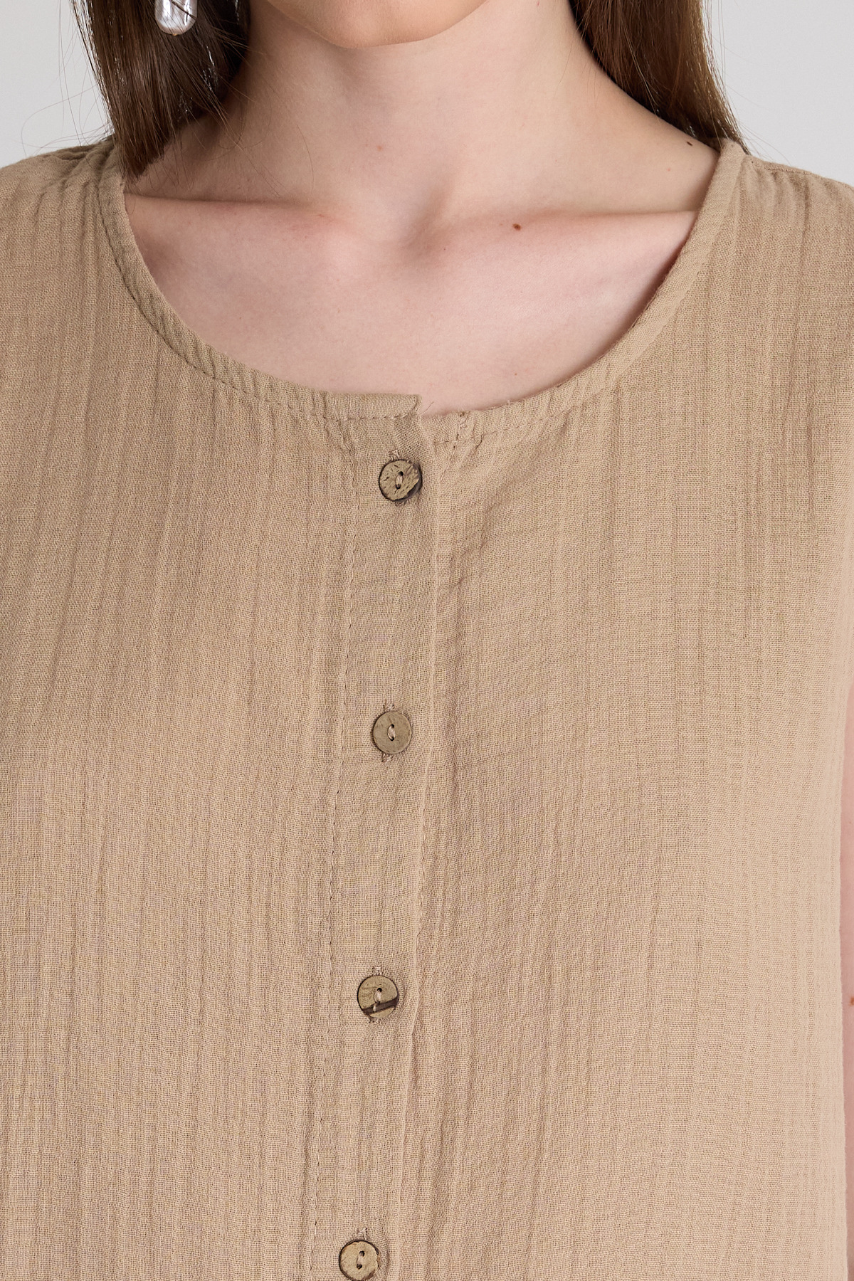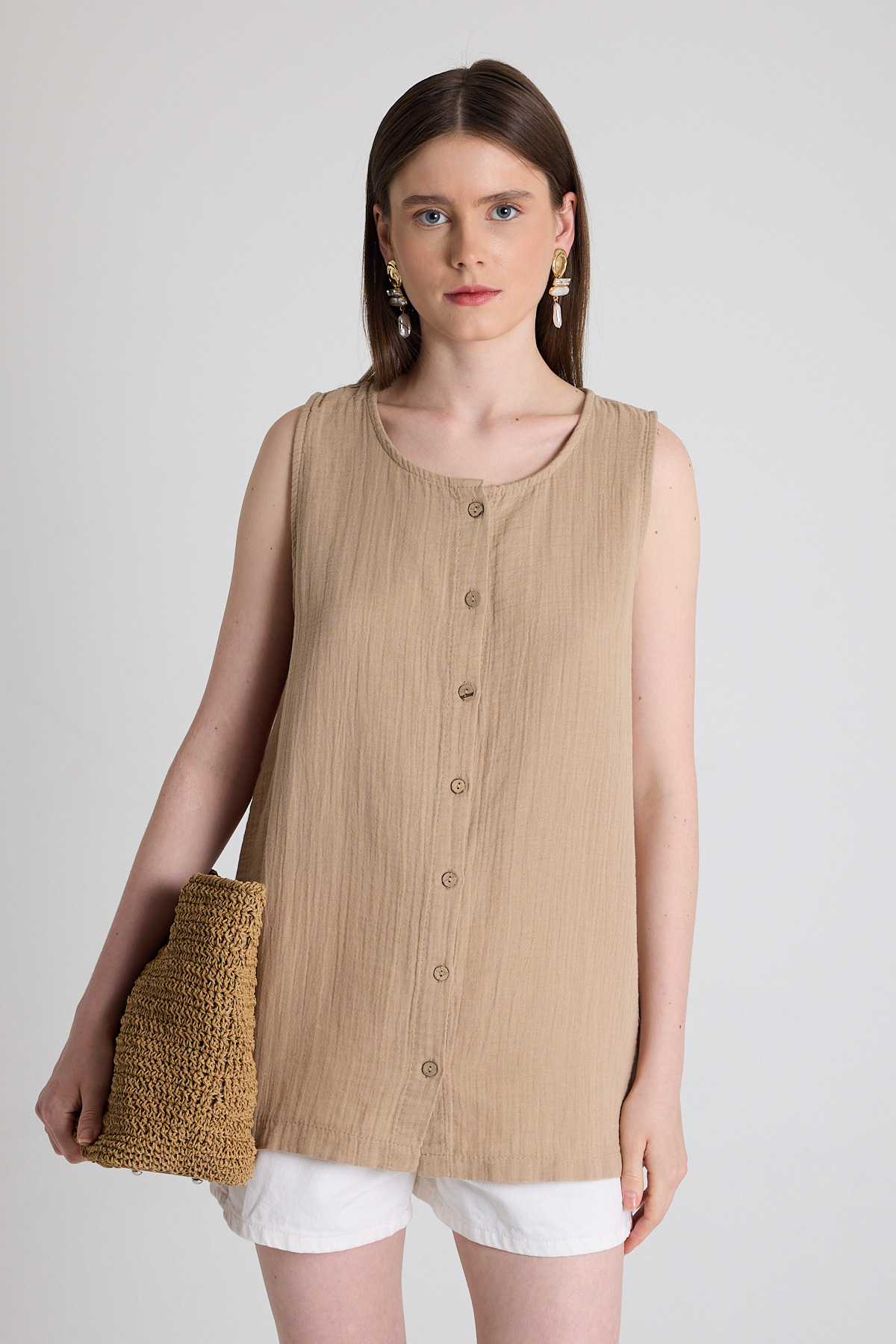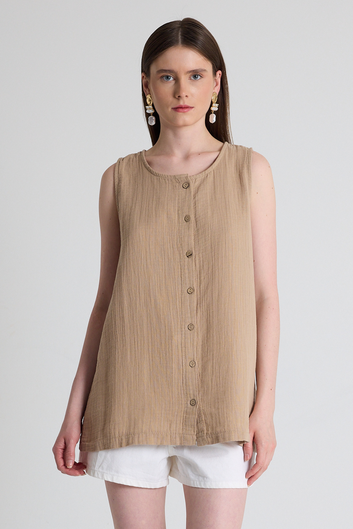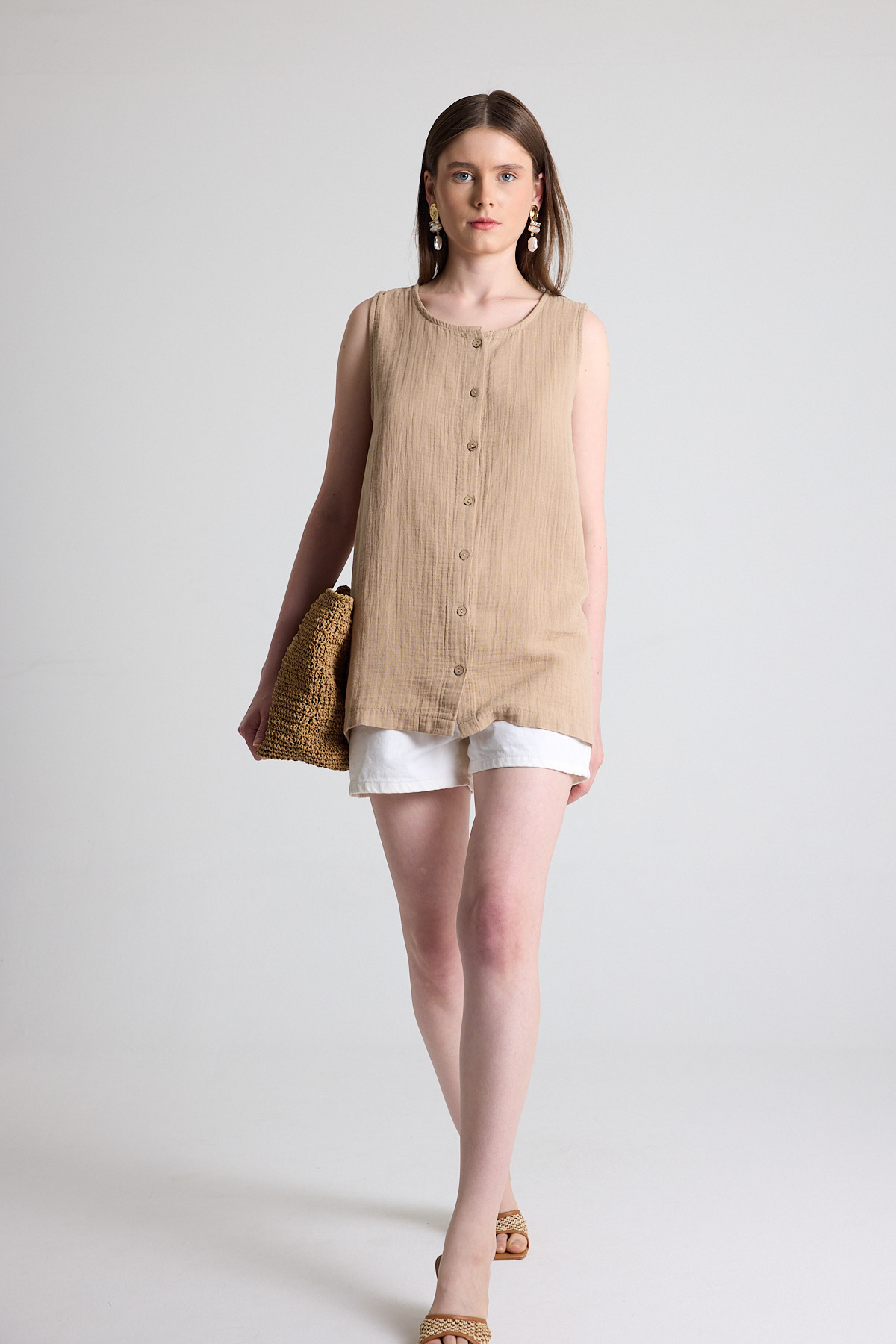 Vizon Keten Görünümlü %100 Pamuk Düğmeli Kolsuz Bluz 4808A