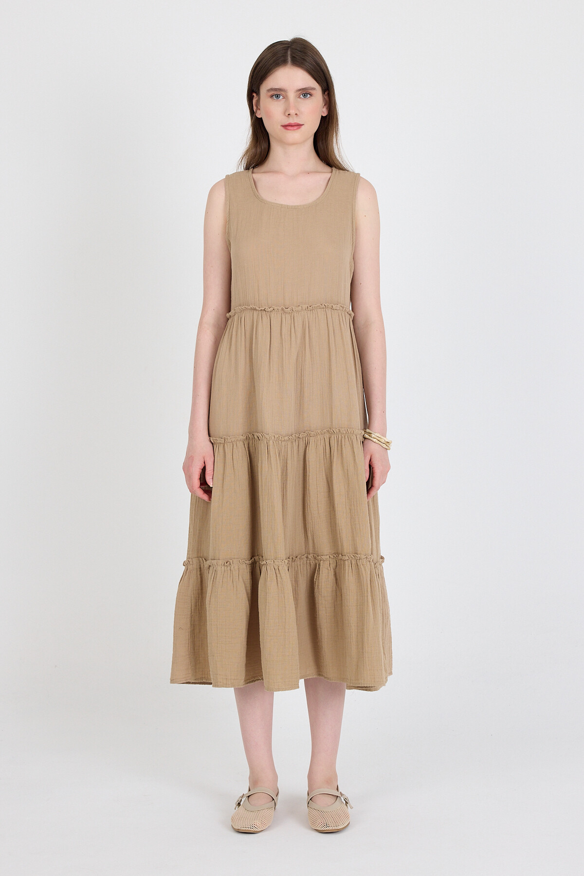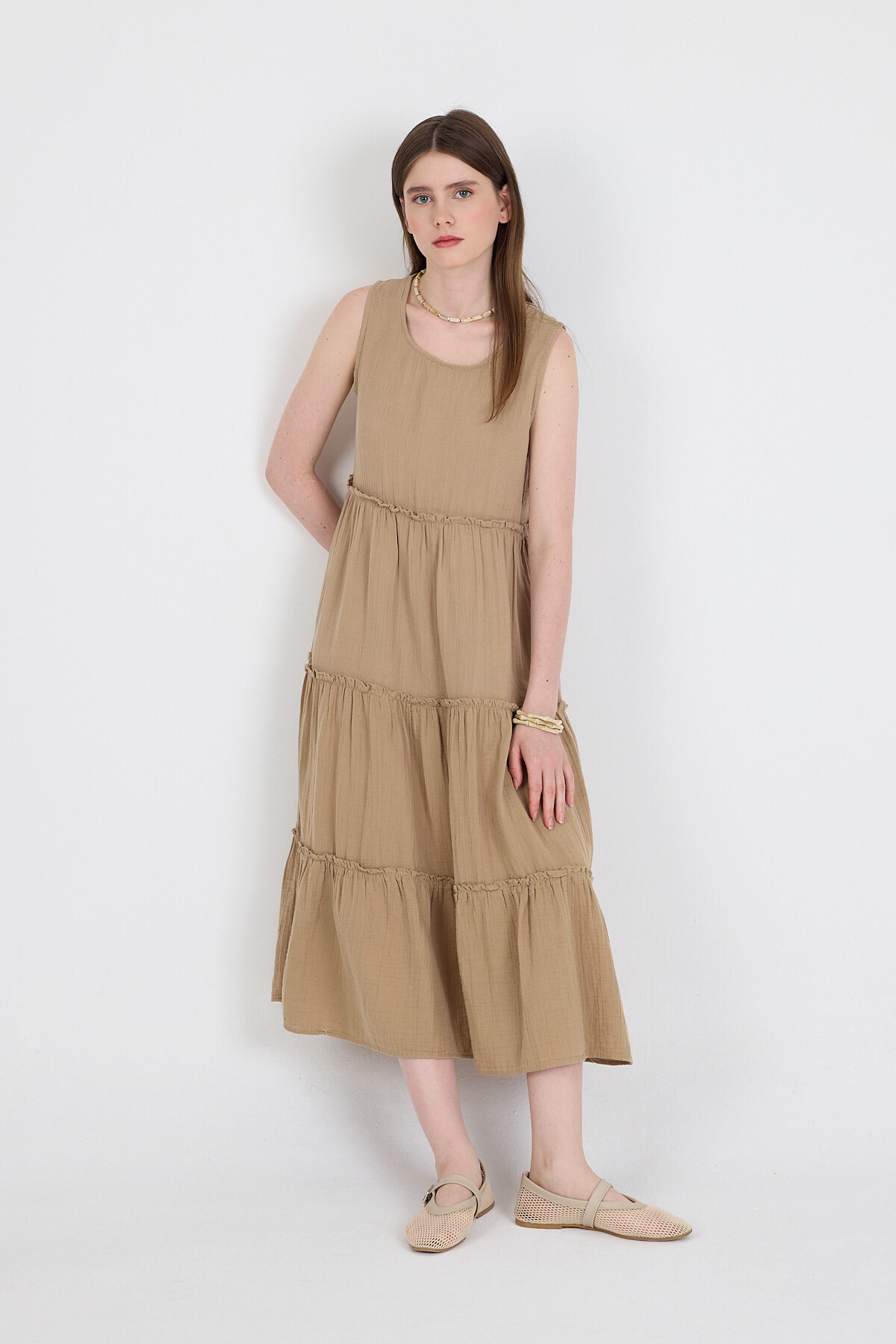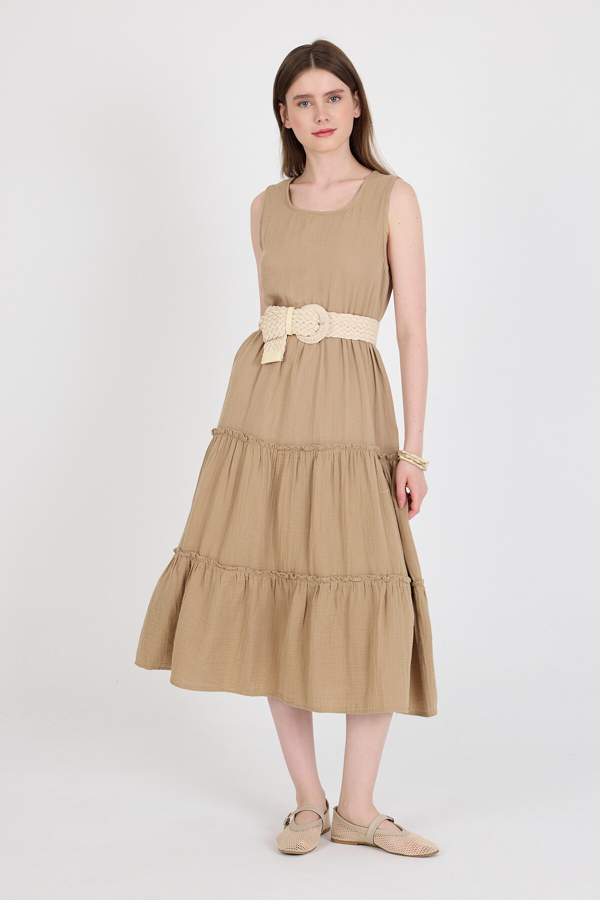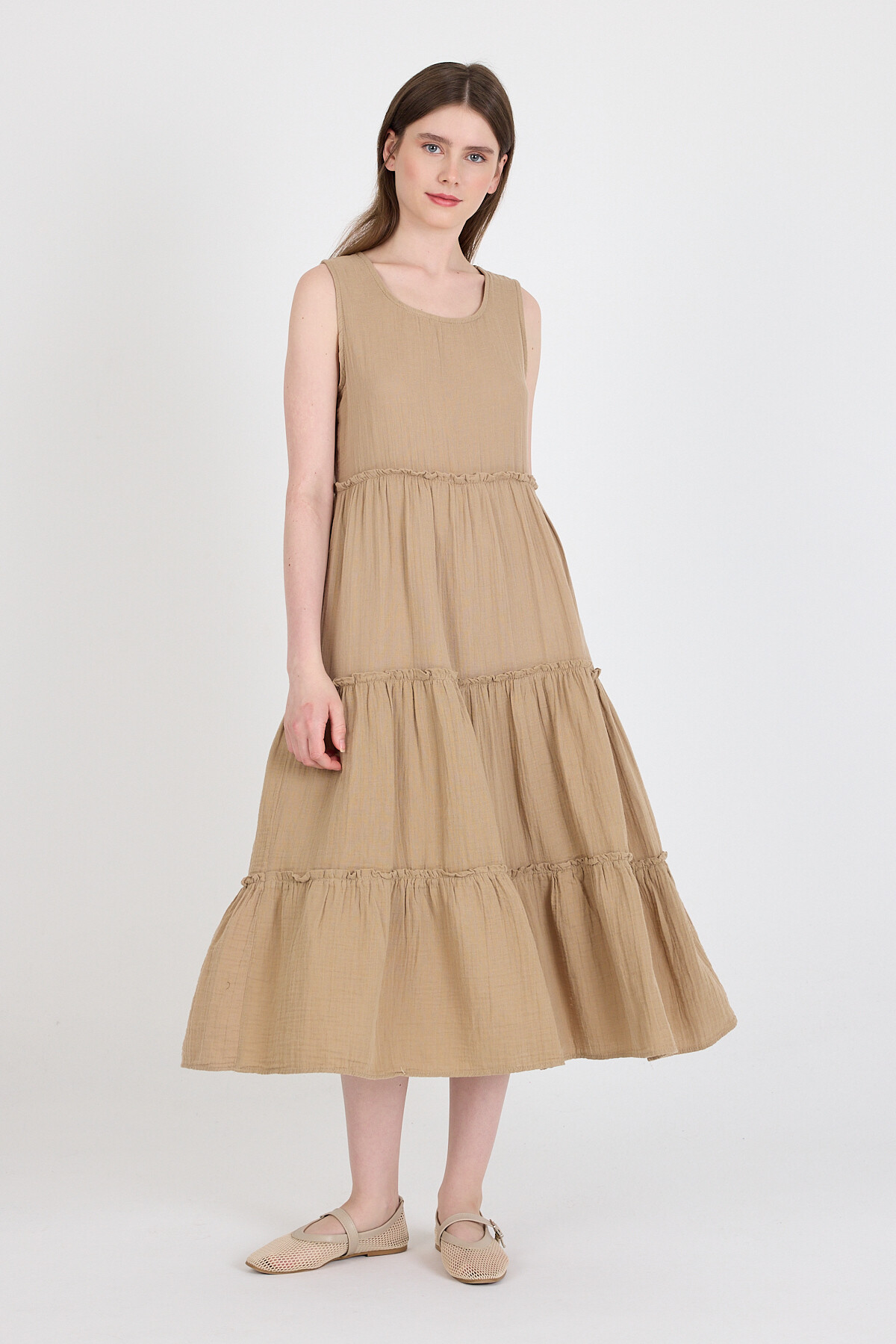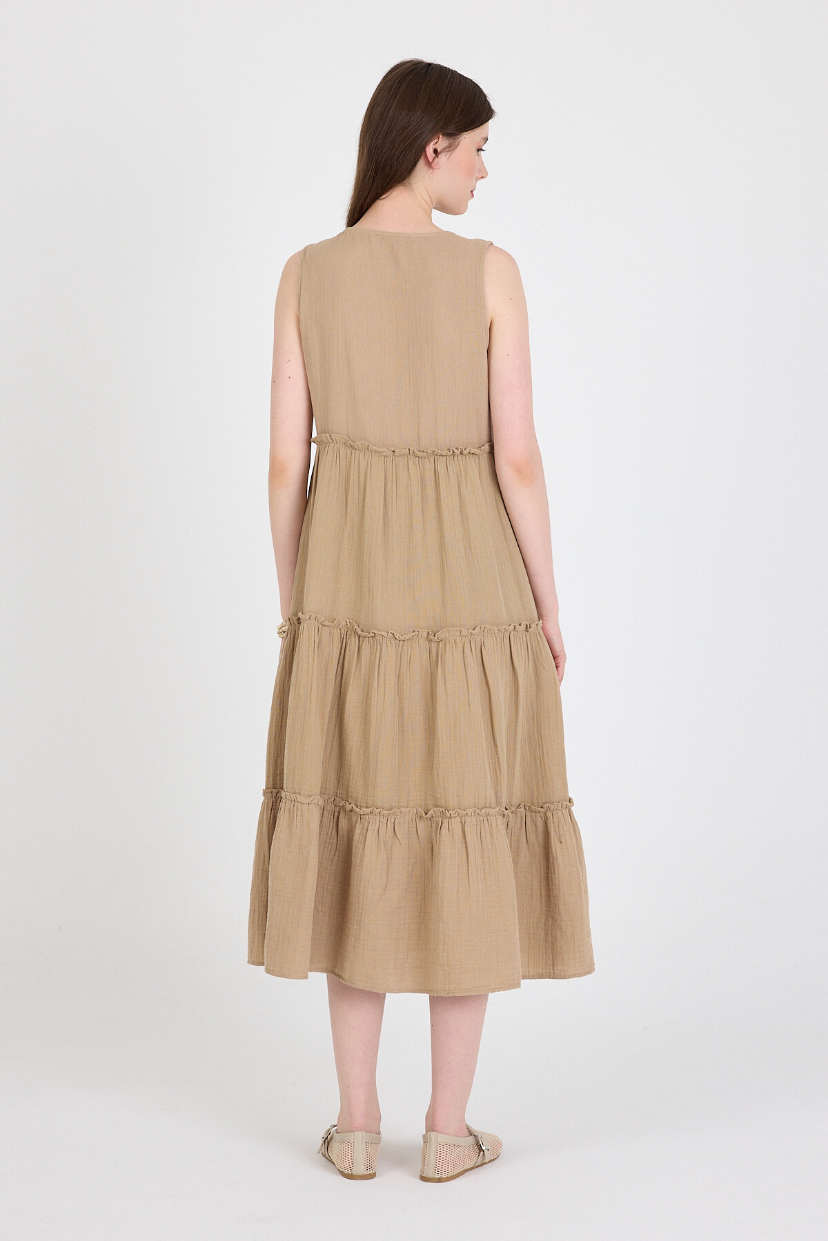 Vizon Keten Görünümlü %100 Pamuk Fırfır Detaylı Kolsuz Midi Elbise 4738A