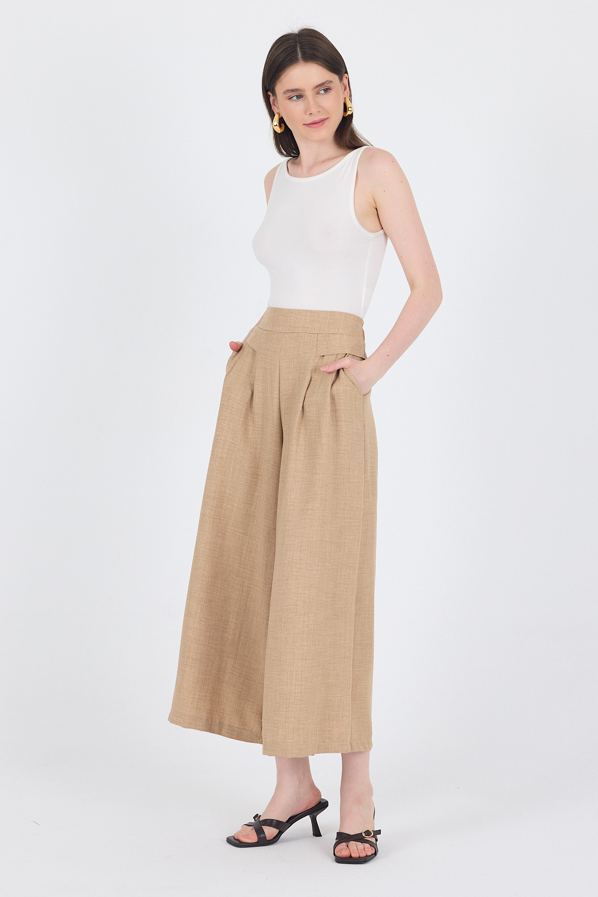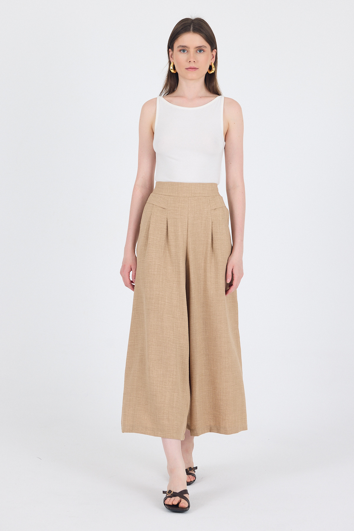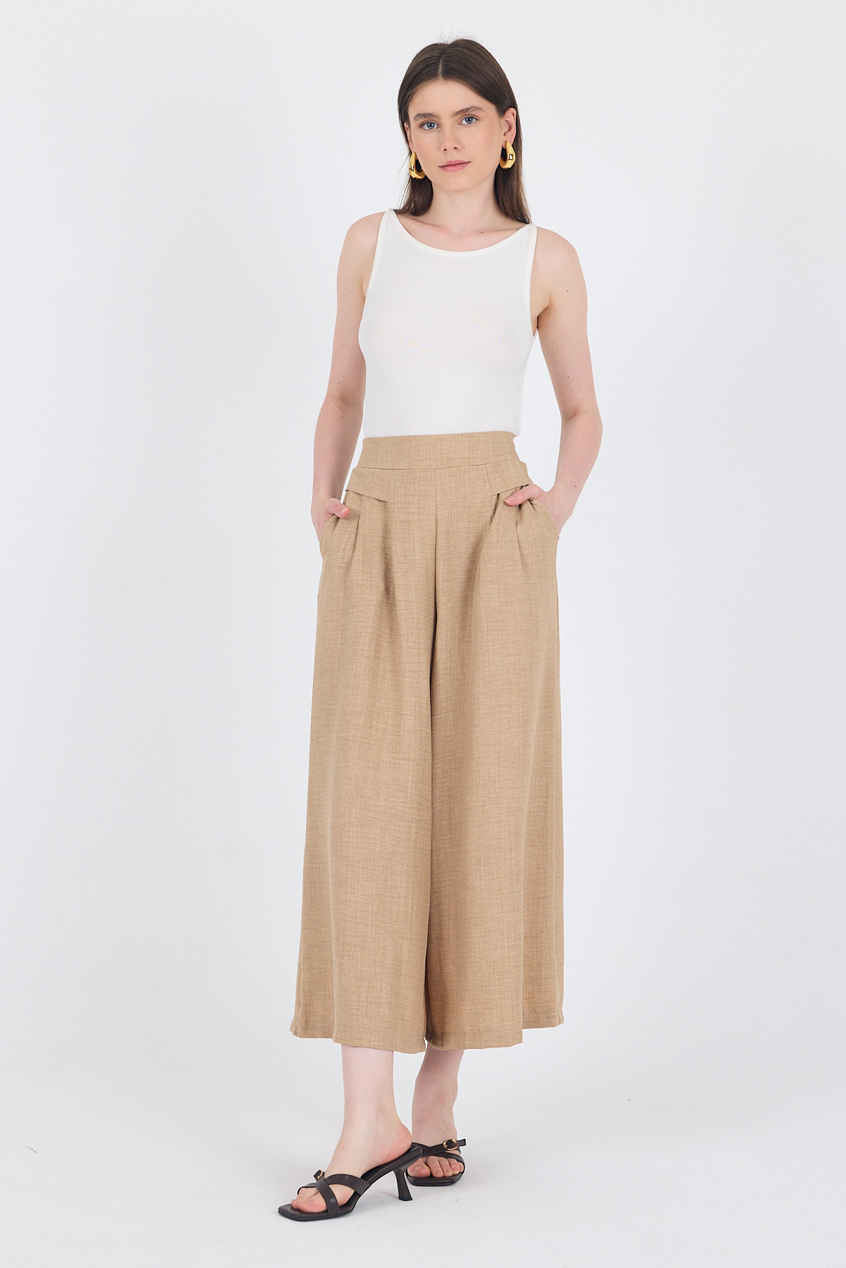 Vizon Pamuklu Keten Dokulu Yüksek Bel Pilili Palazzo Pantolon 4819A