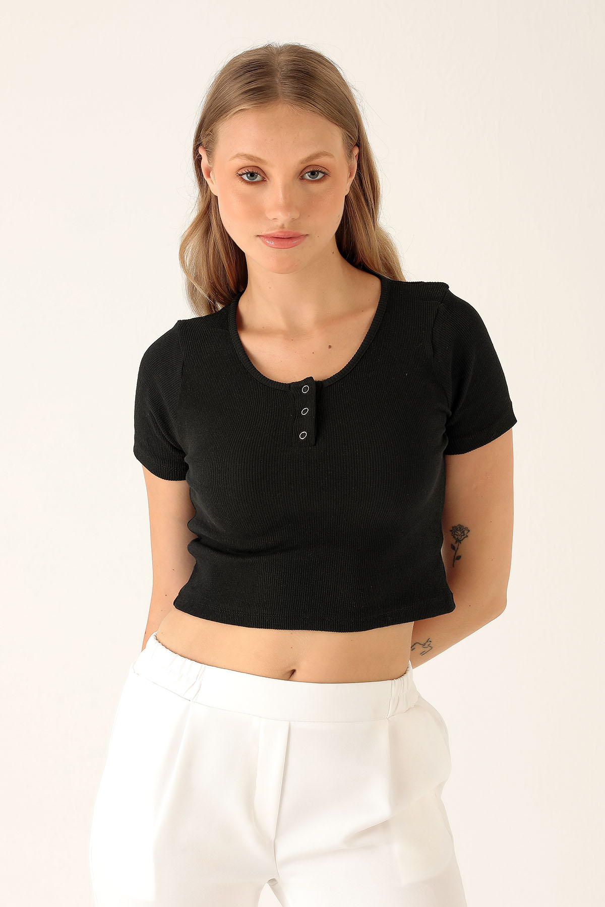 Yaka Çıtçıtlı Bayan Bluz - 1432 Siyah