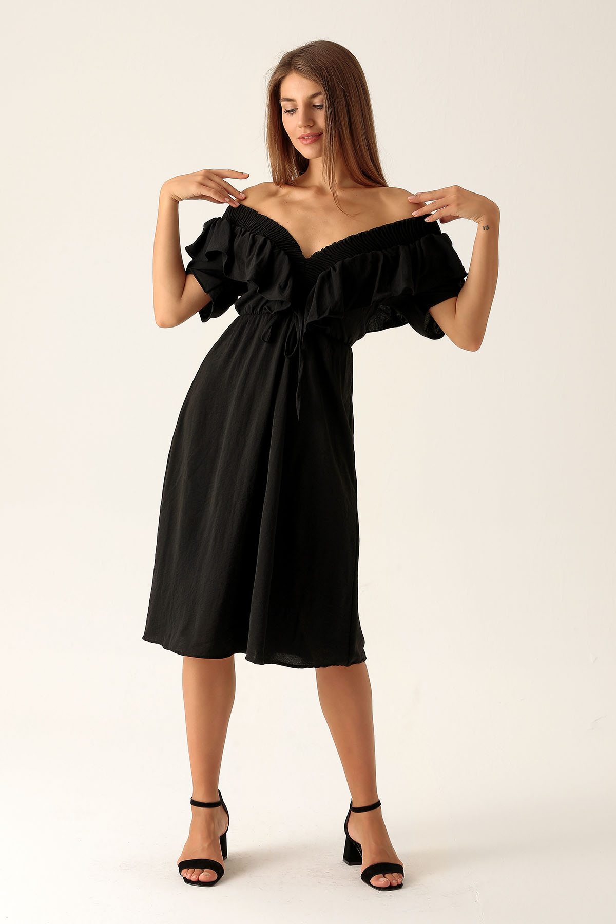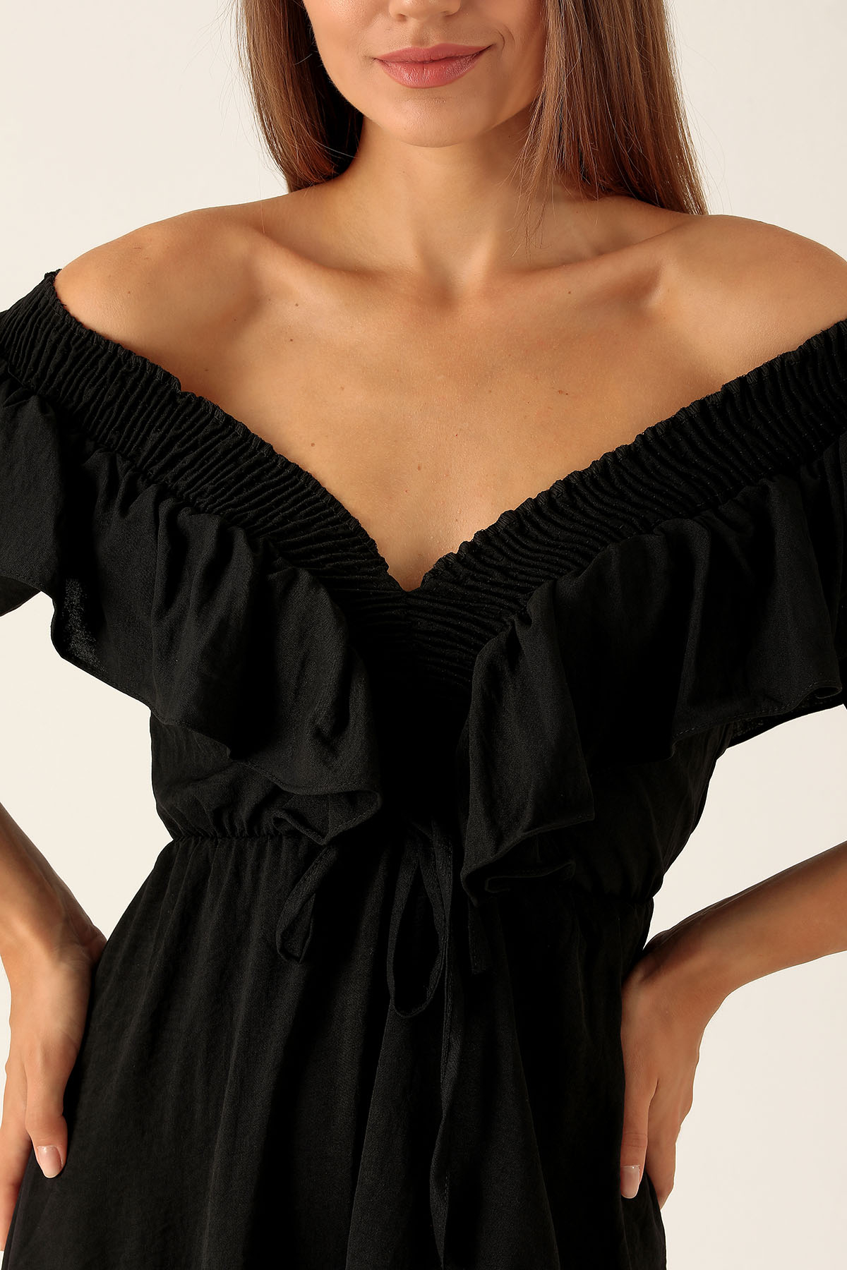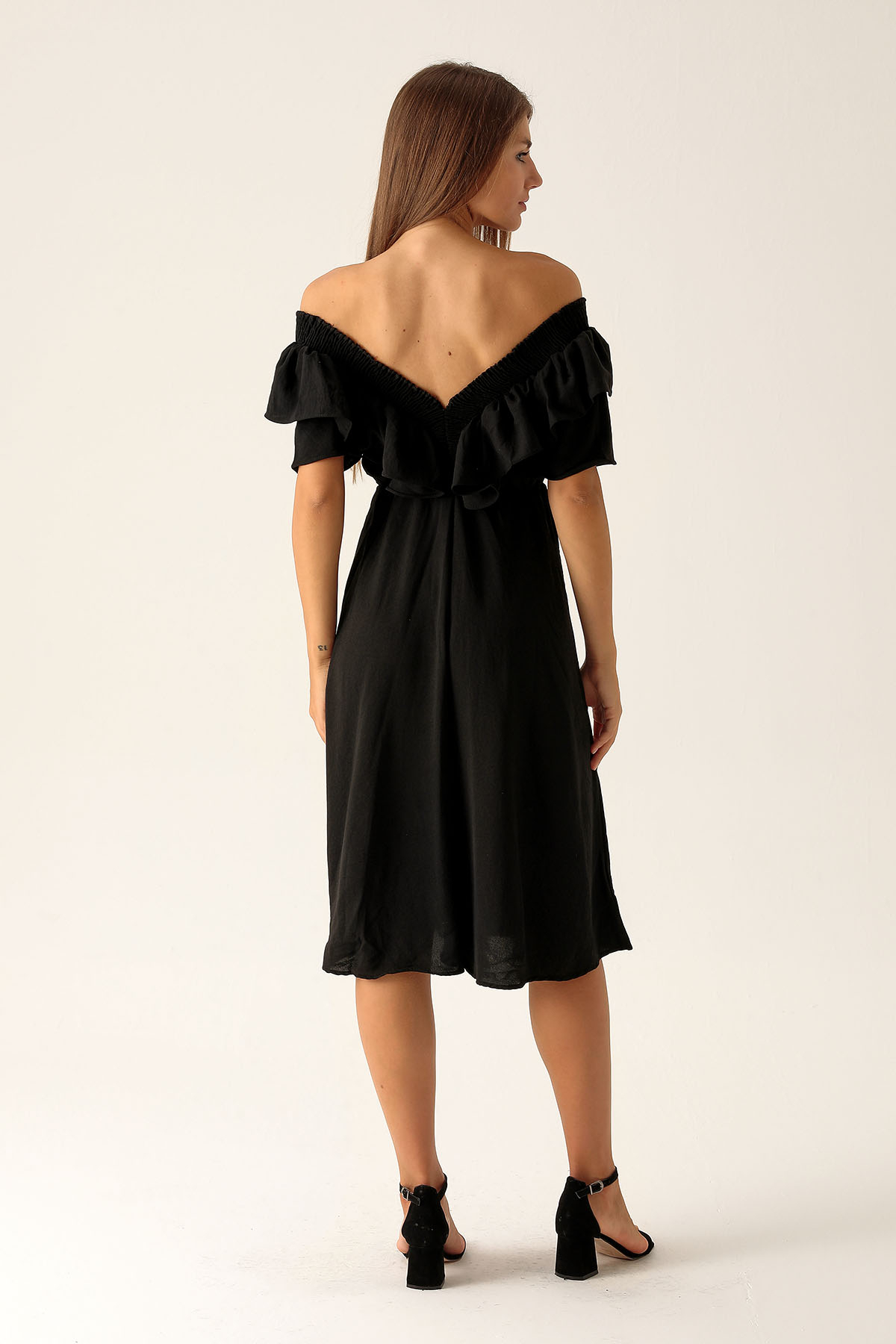Yaka Gipe Detay Volanlı Elbise - 2620 Siyah
