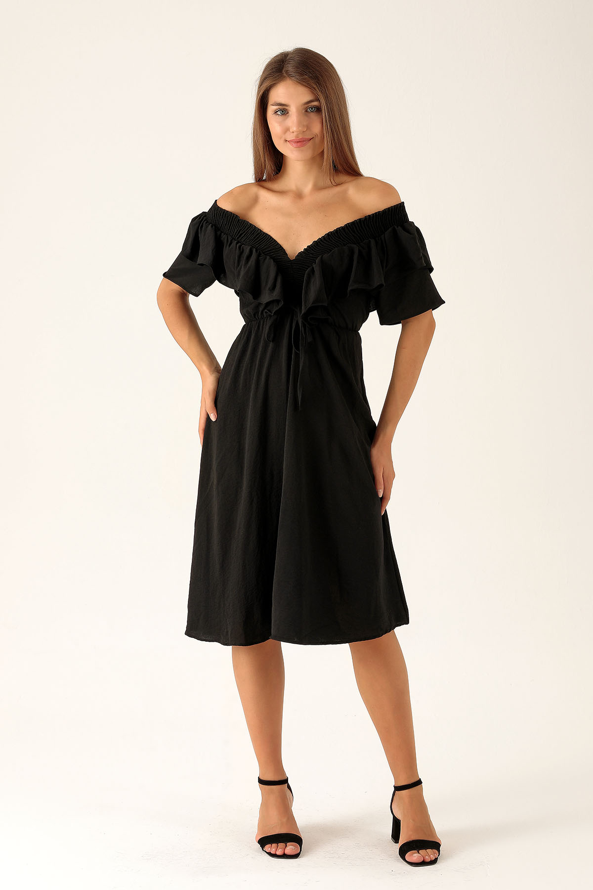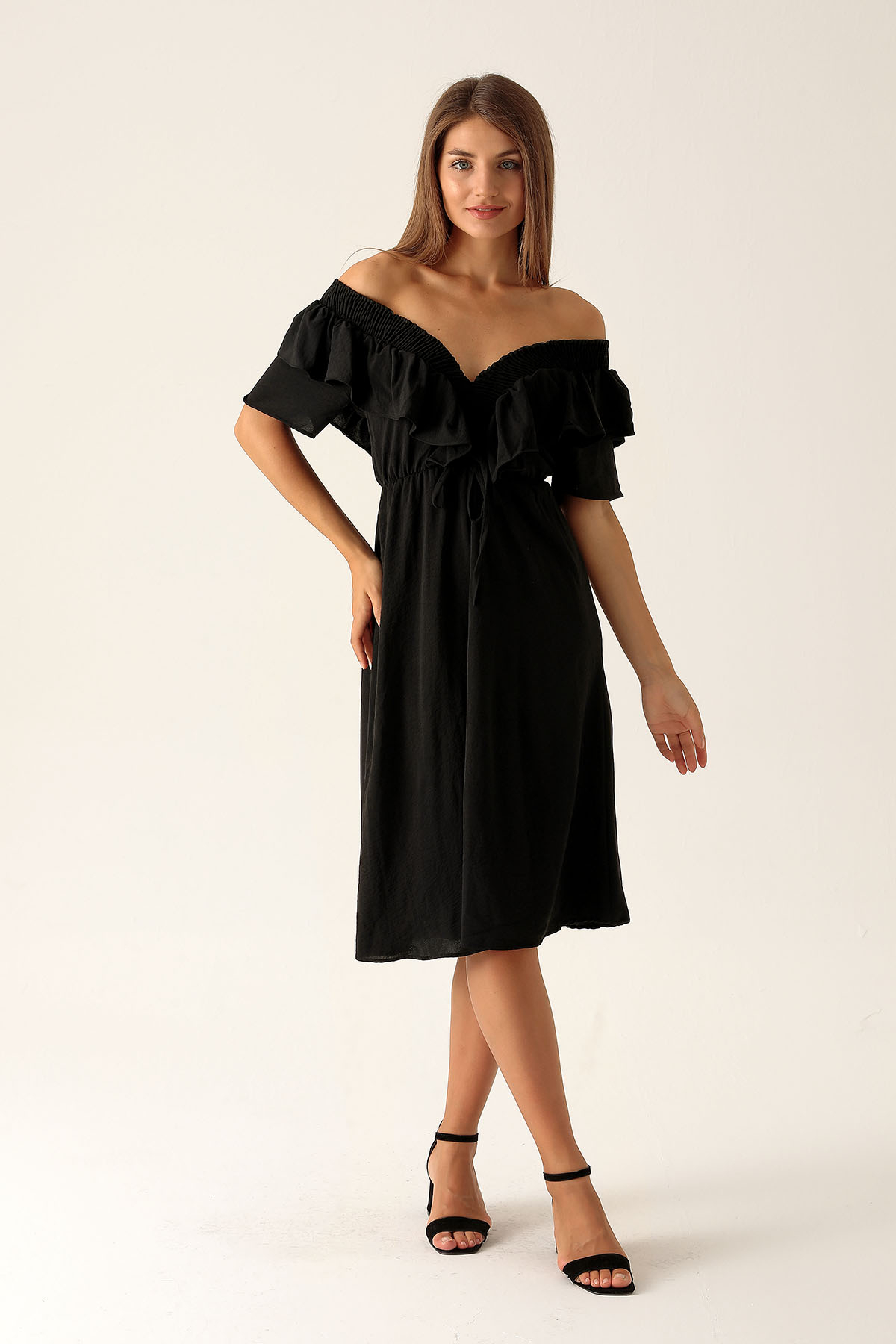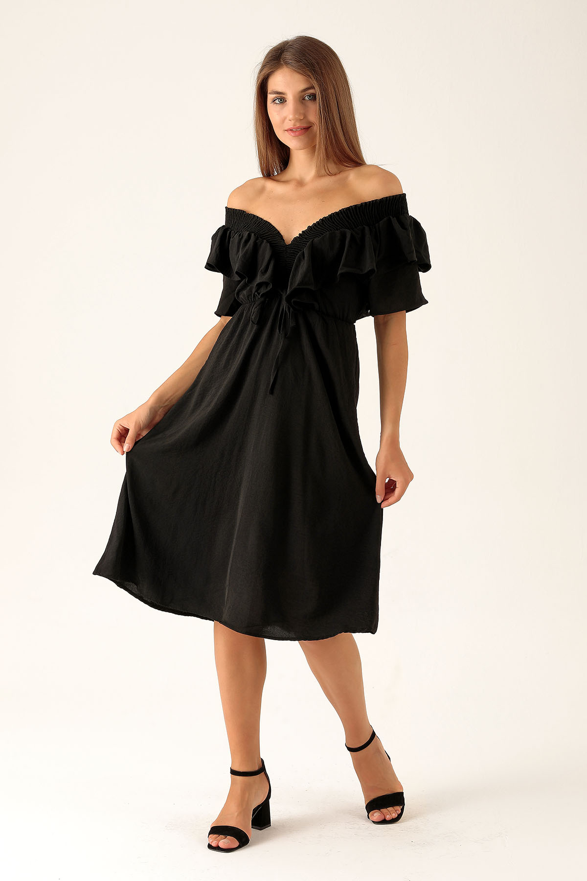 Yaka Gipe Detay Volanlı Elbise - 2620 Siyah