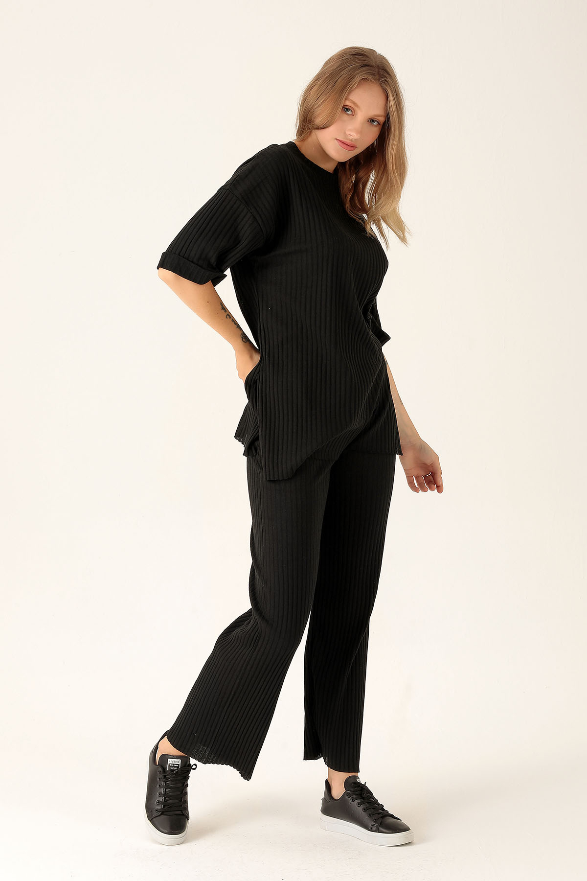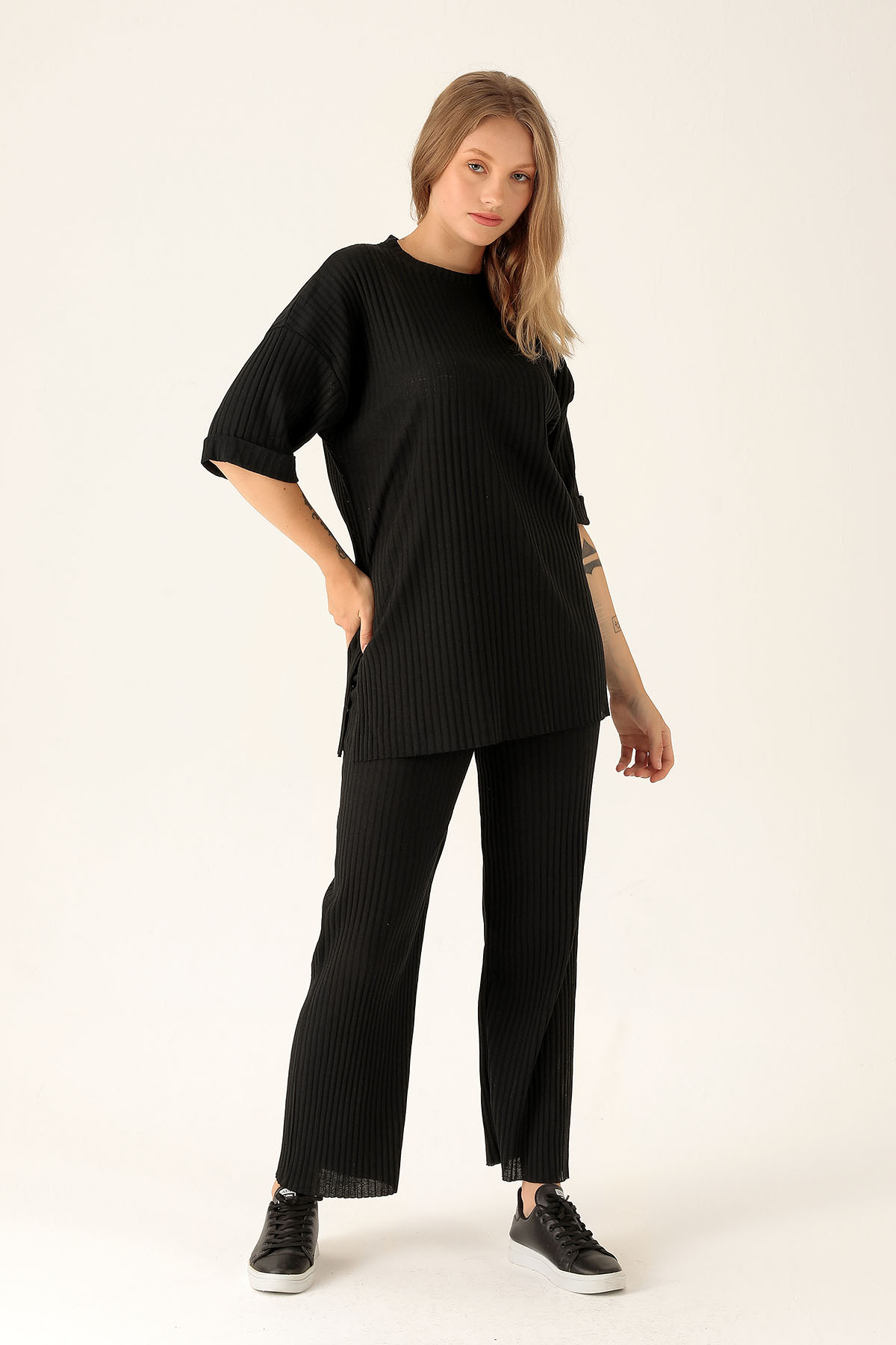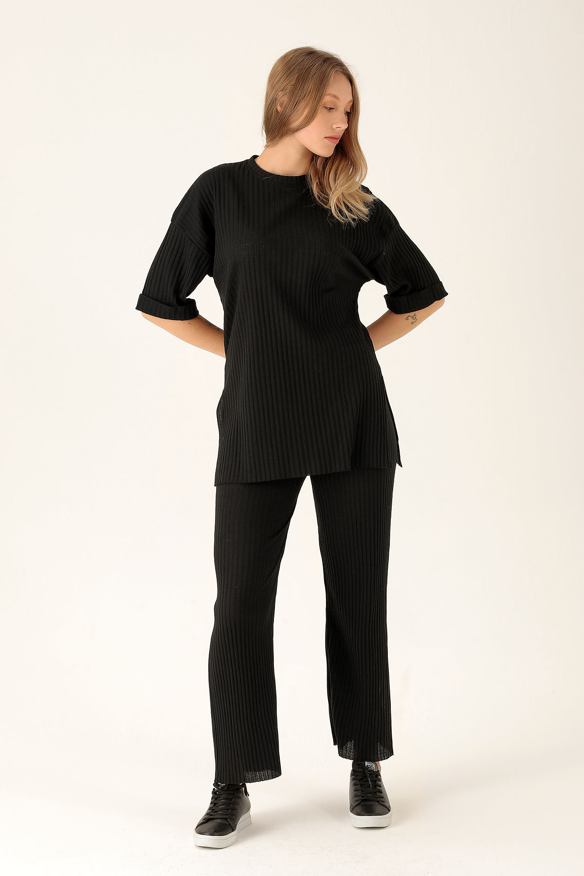 Yan Yırtmac Tişört-Bayan Pantolon Takım - 538 Siyah