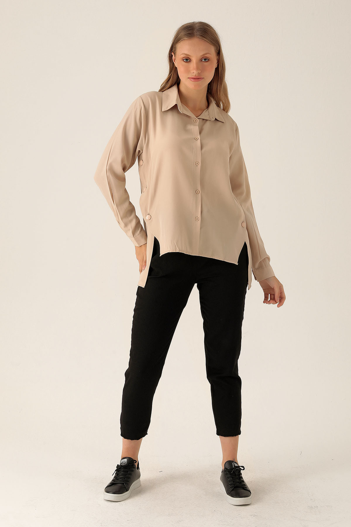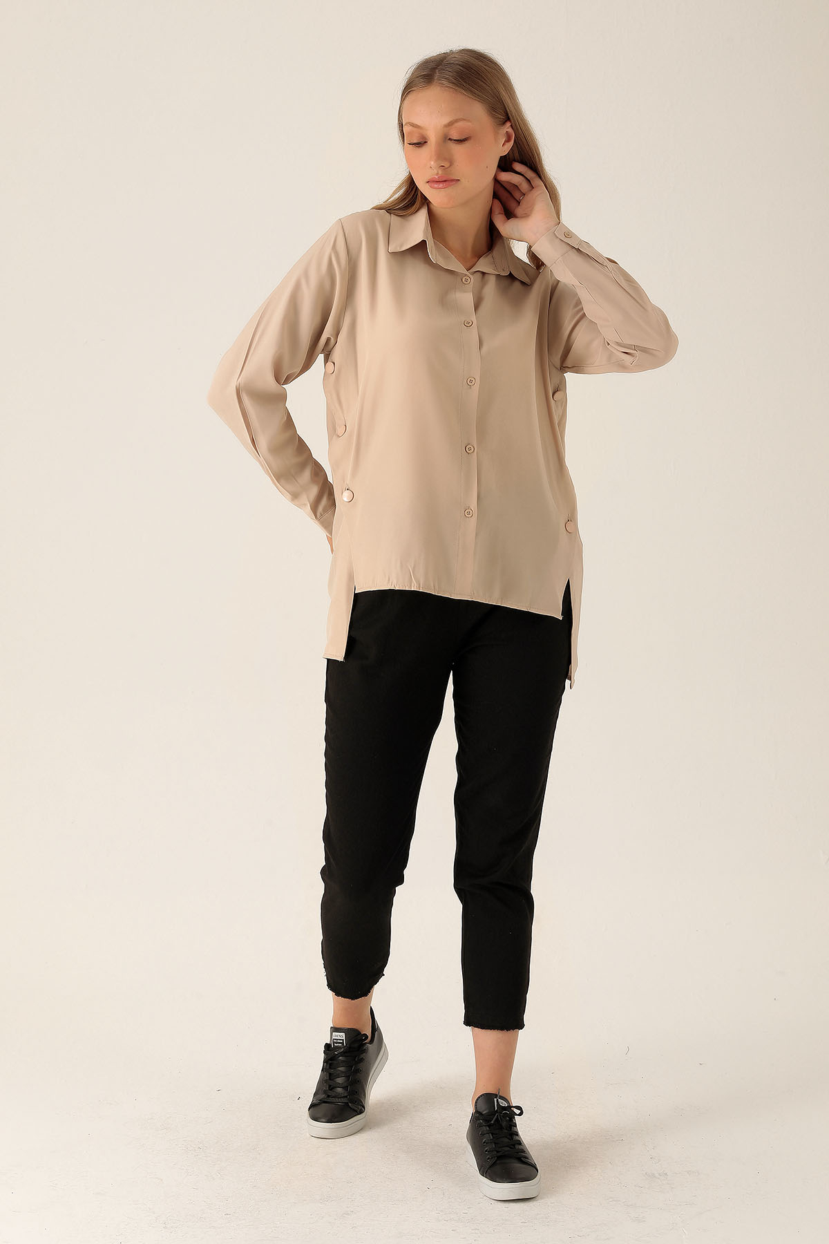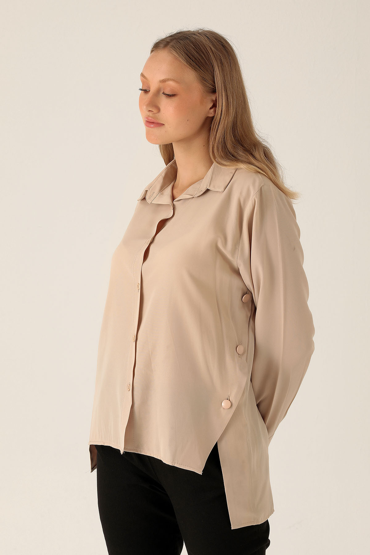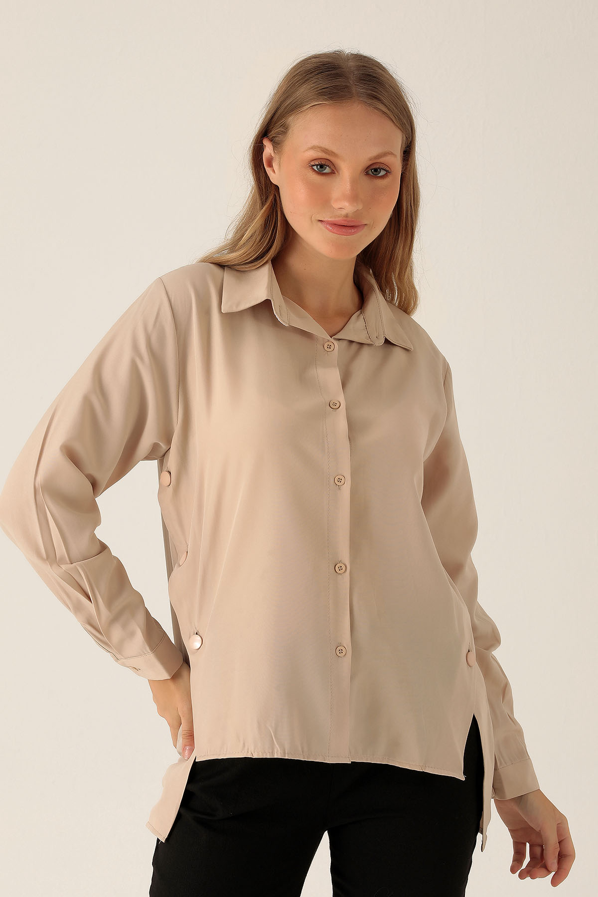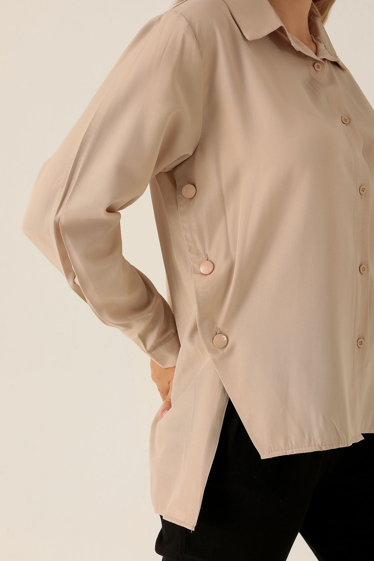 Yandan Çıtçıtlı Düğmeli Bayan Gömlek - 6508A Bej