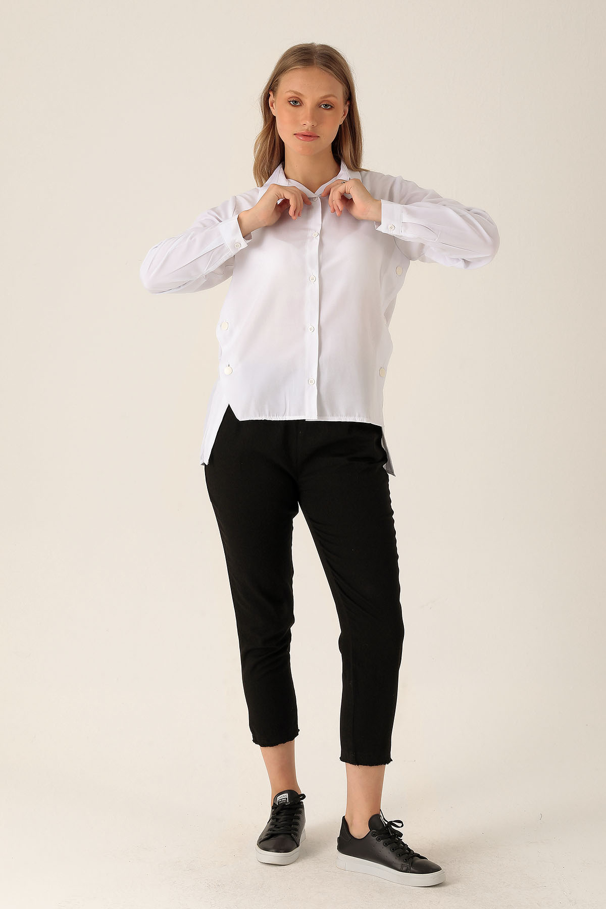 Yandan Çıtçıtlı Düğmeli Bayan Gömlek - 6508A Beyaz