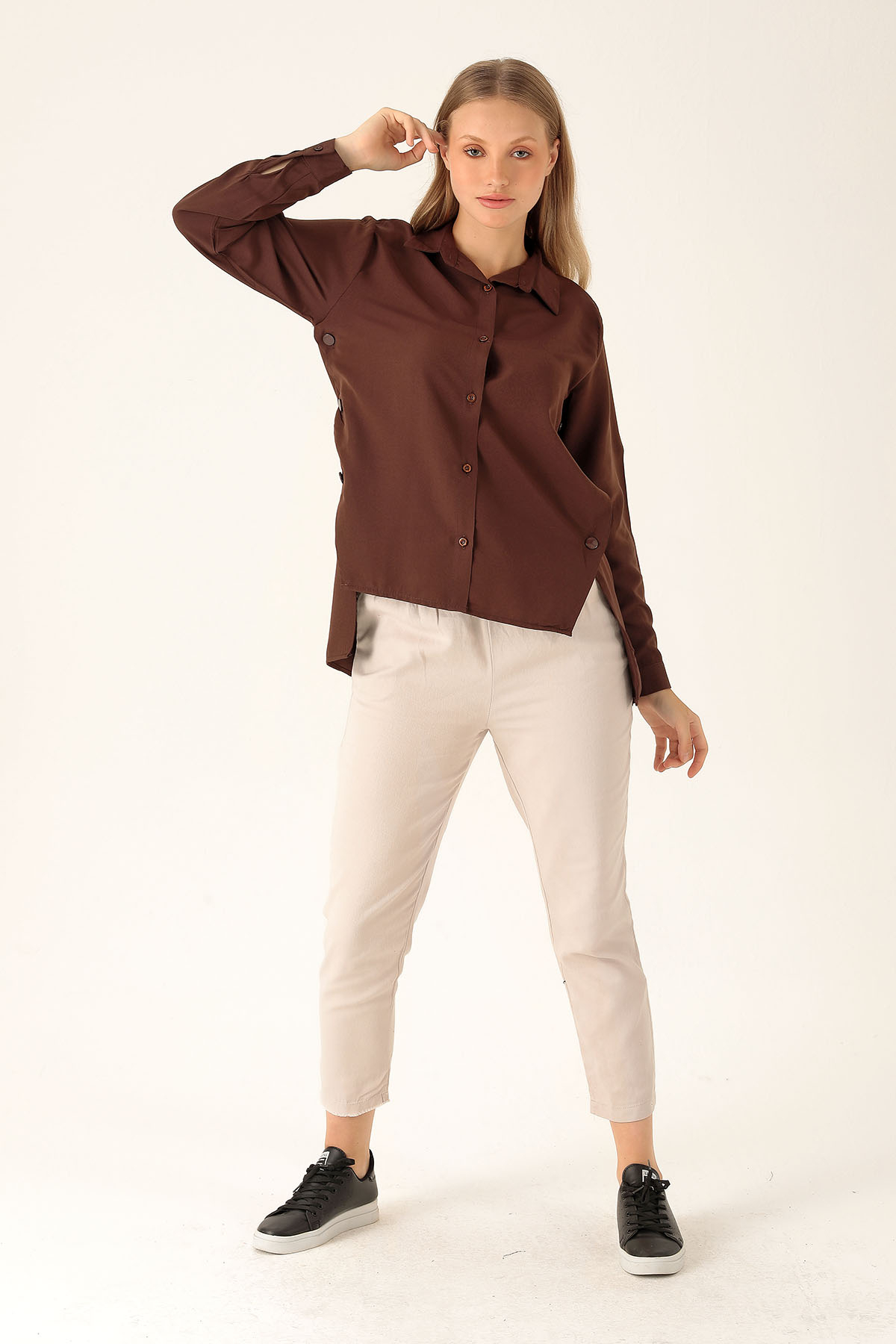 Yandan Çıtçıtlı Düğmeli Bayan Gömlek - 6508A Kahve