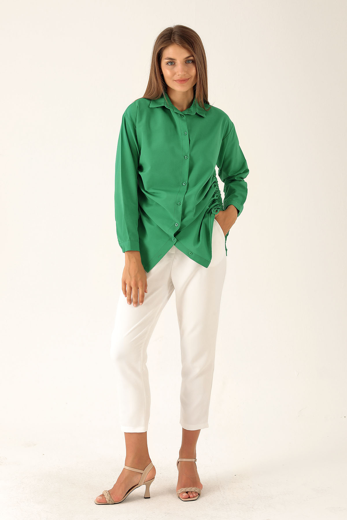 Yanları Büzgülü Bayan Gömlek - 6428A Benetton Yeşili