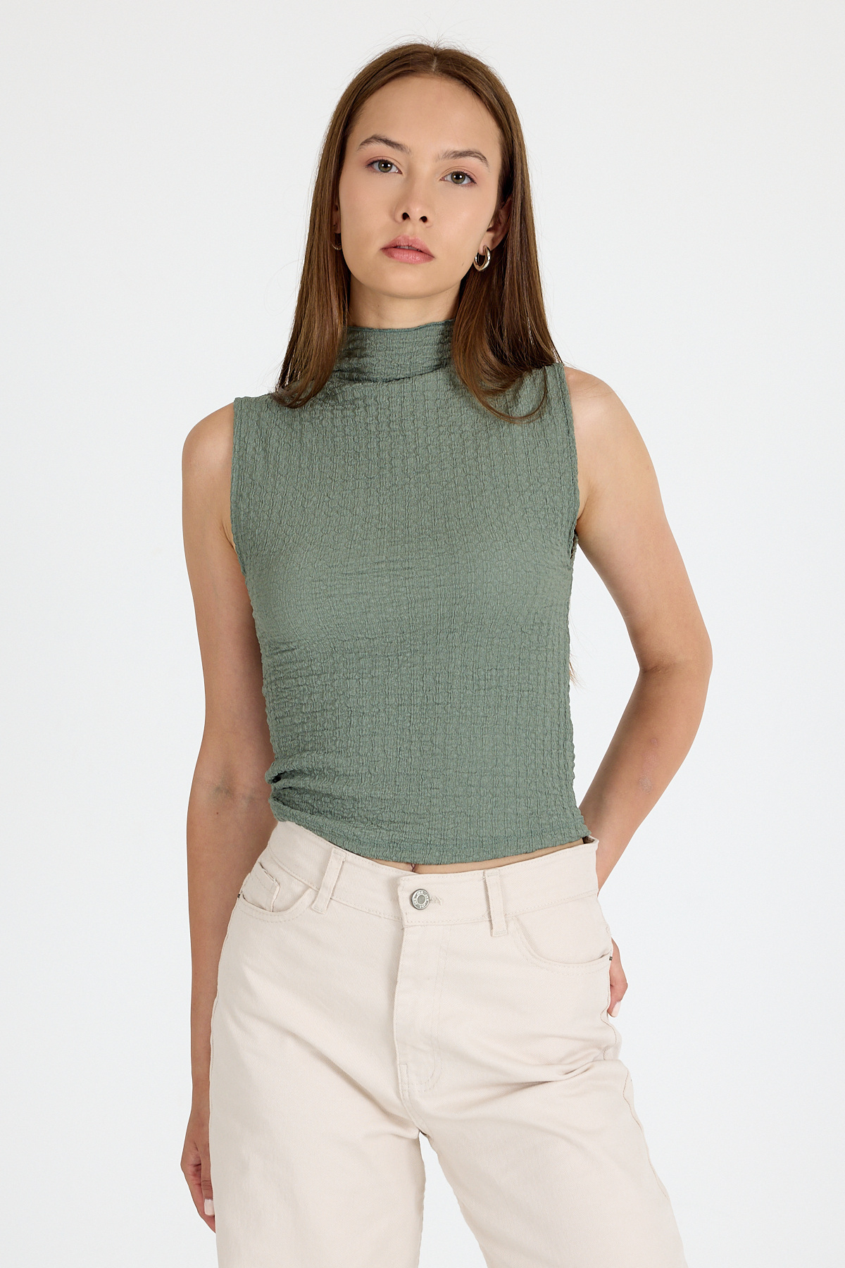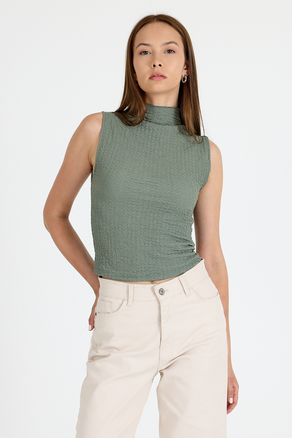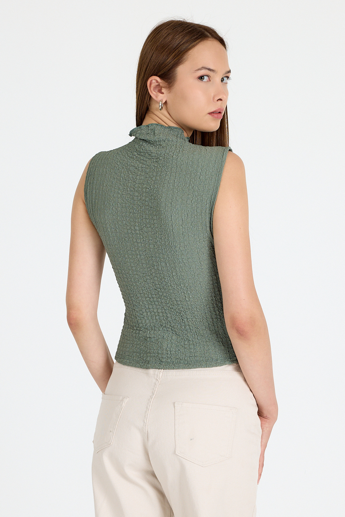 Yeşil Bürümcük Kumaş Dik Yaka Kolsuz Bluz 3458