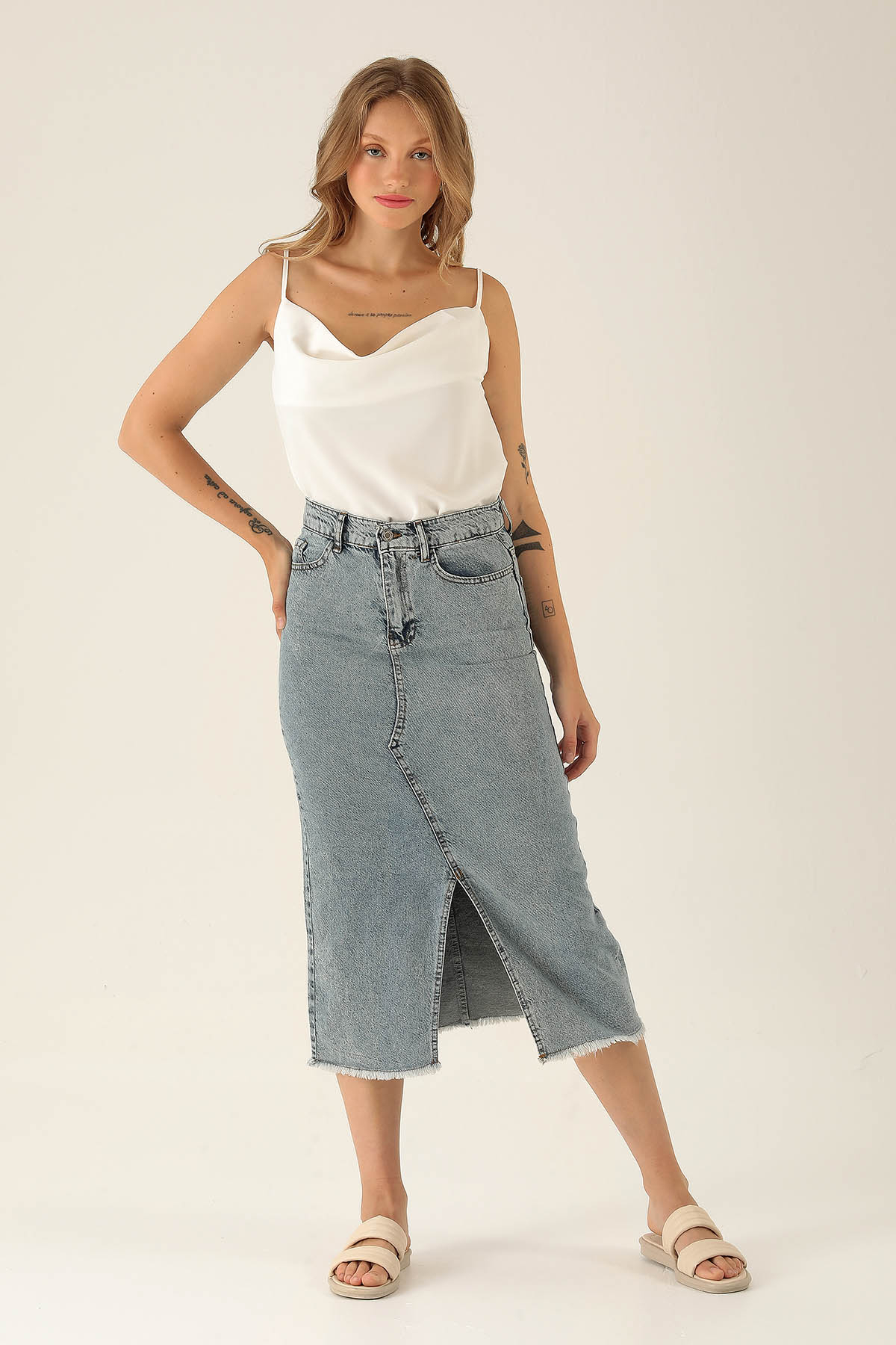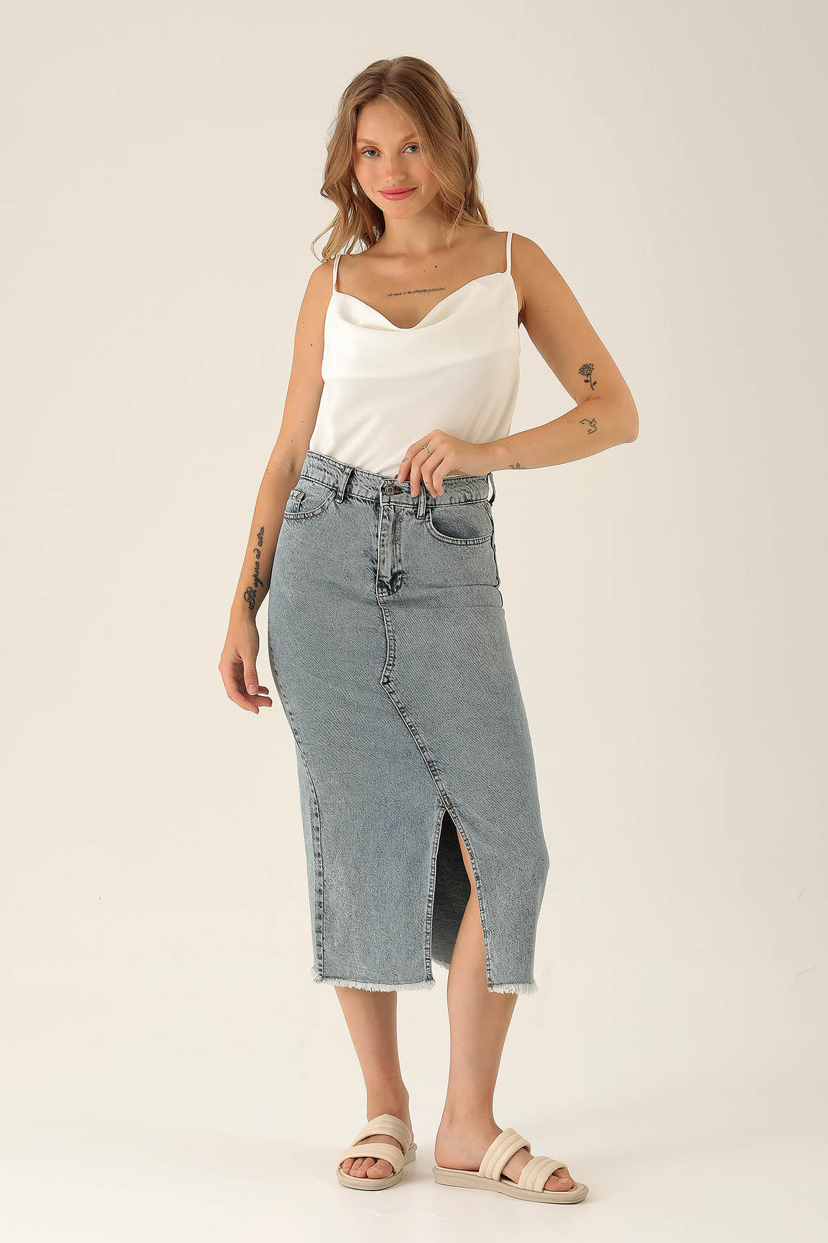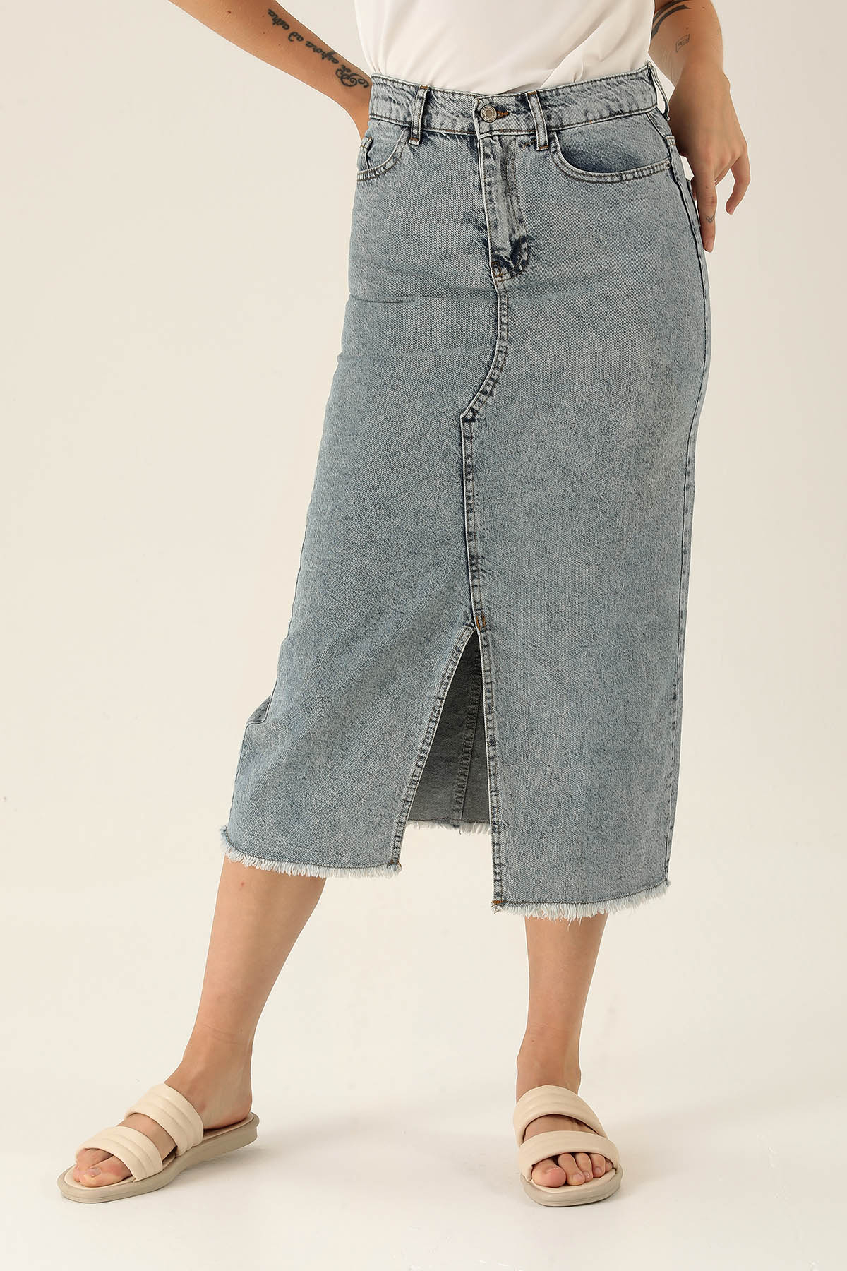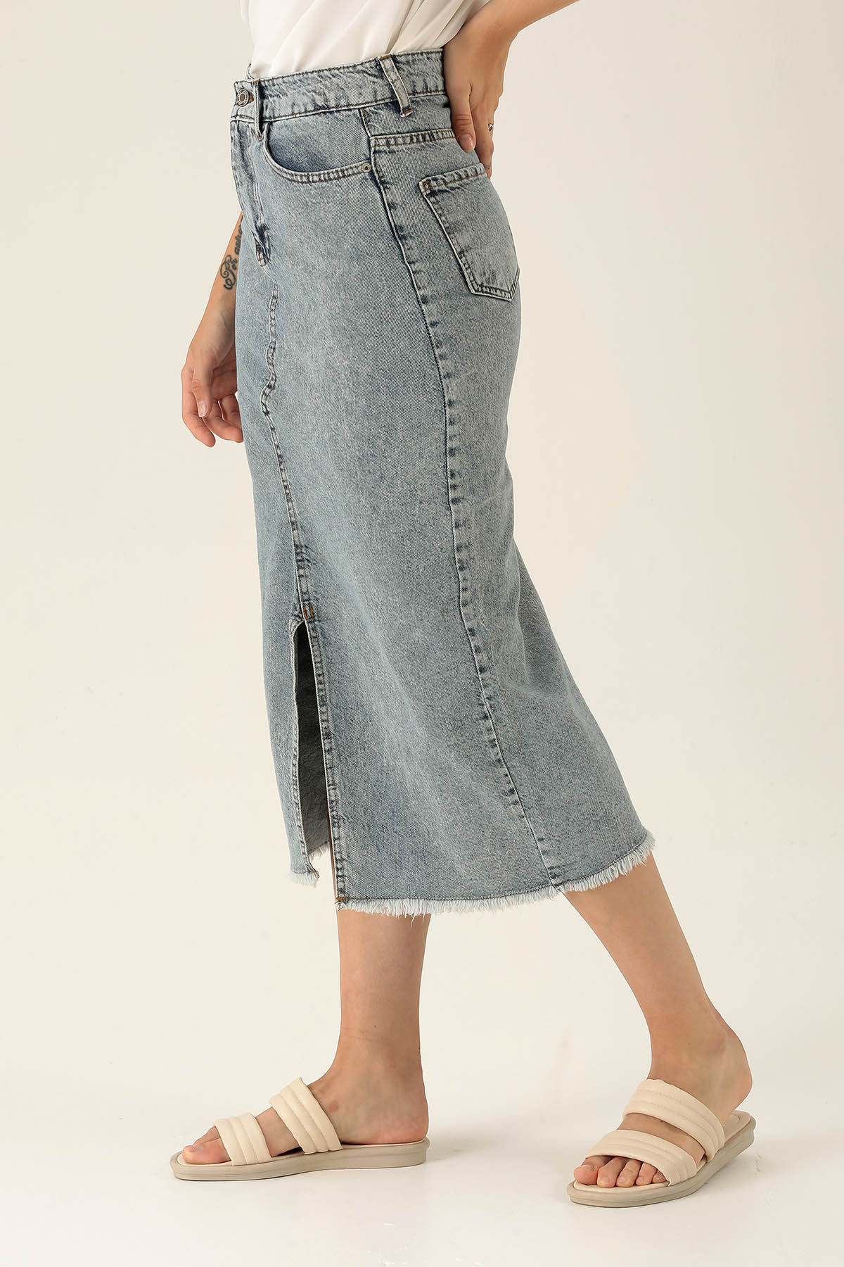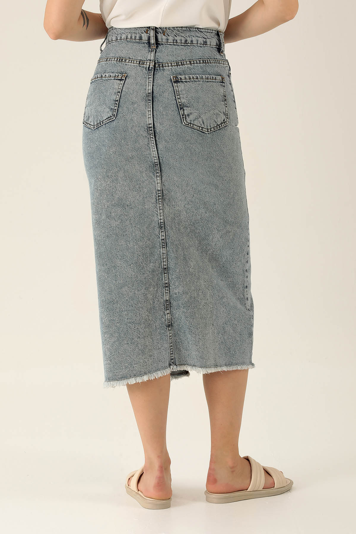 Yırtmaçlı Jean Midi Boy Etek - 3005 Kar Yıkama
