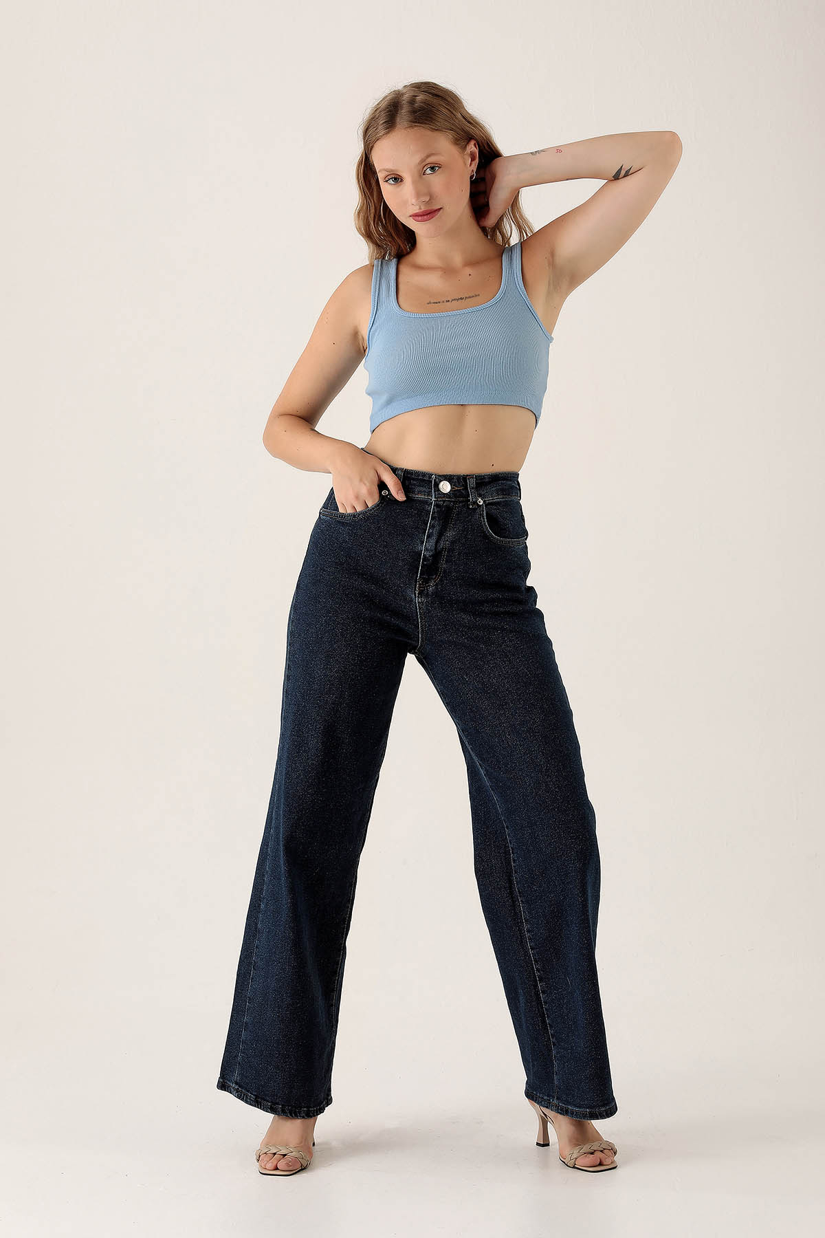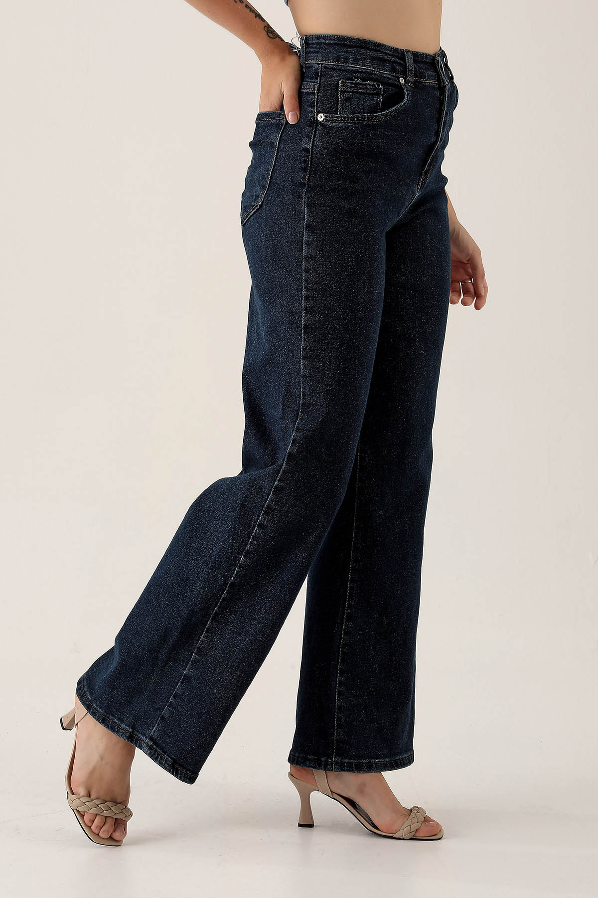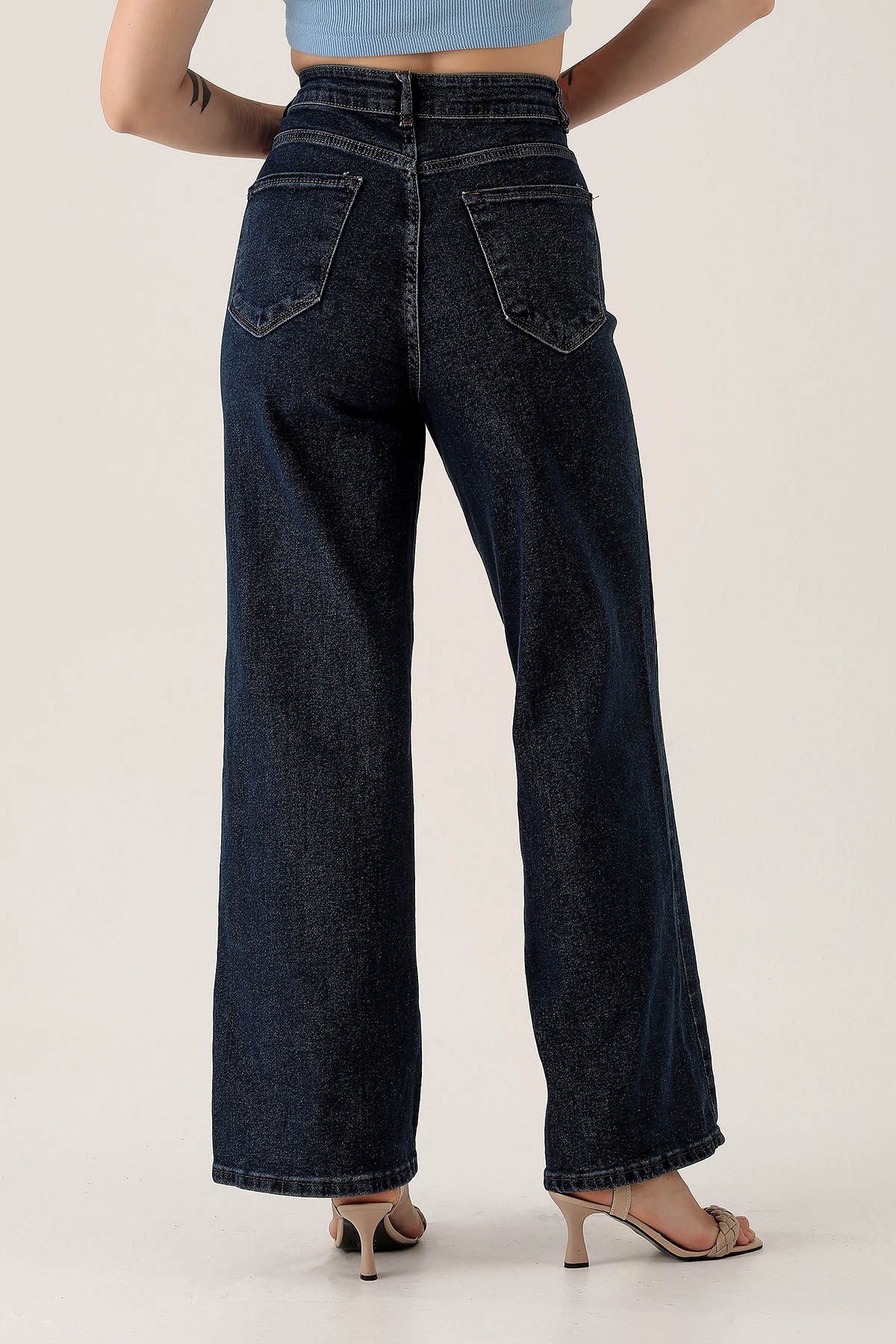 Yüksek Bel Bol Paça Bayan Pantolon - 3024 Koyu Mavi