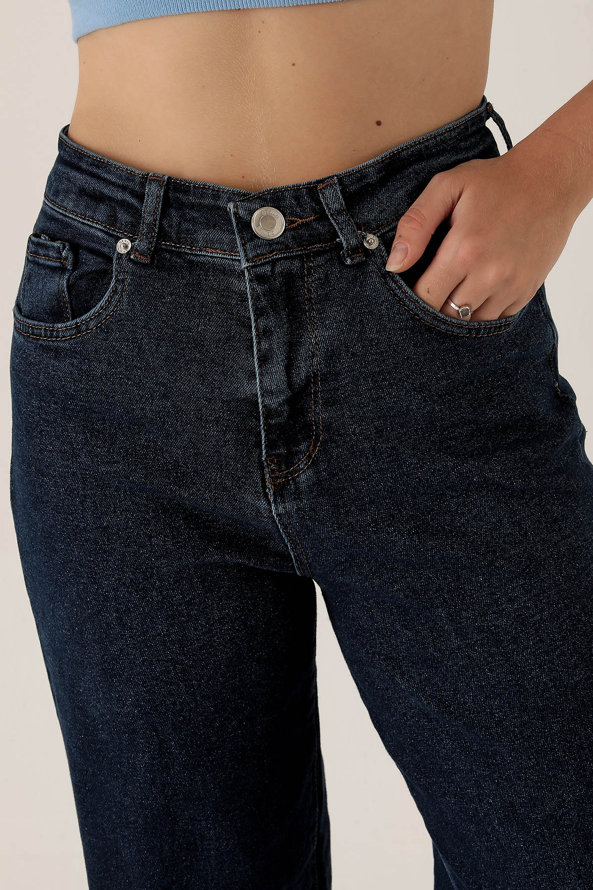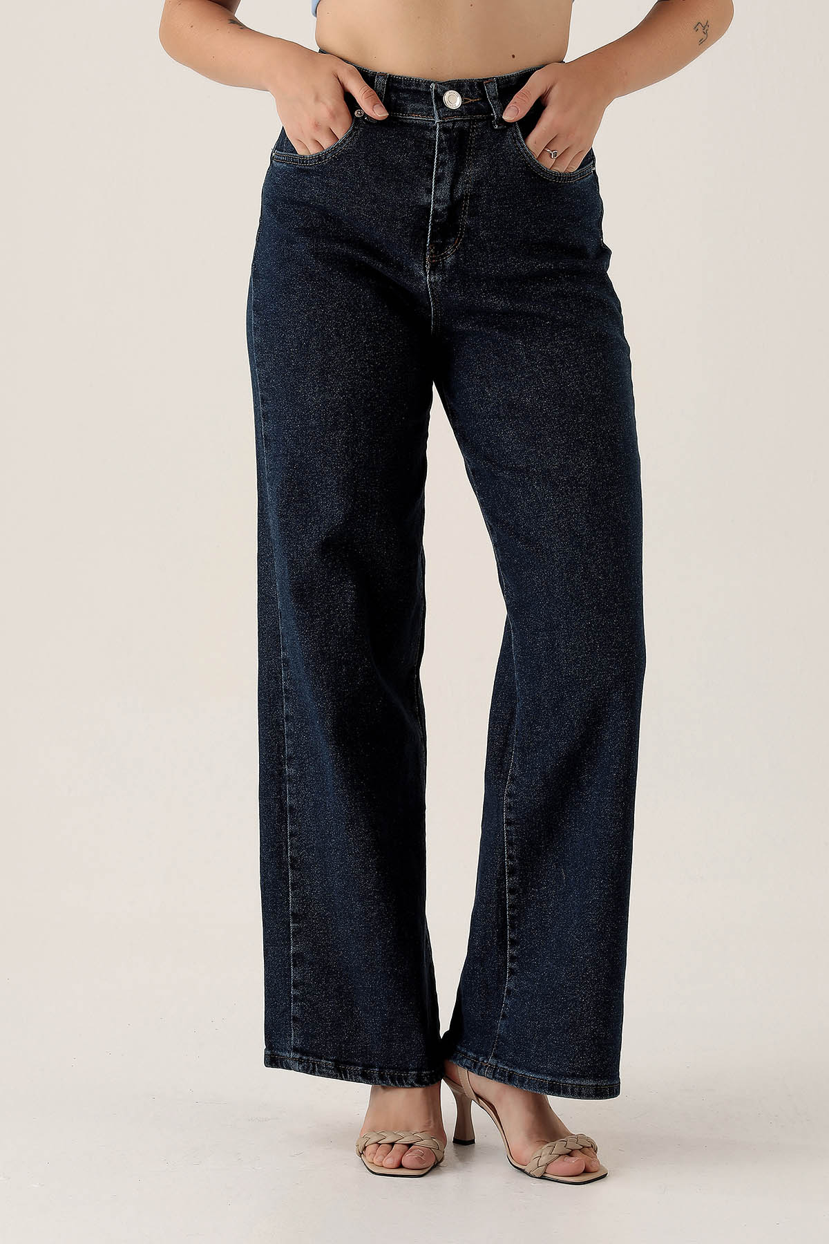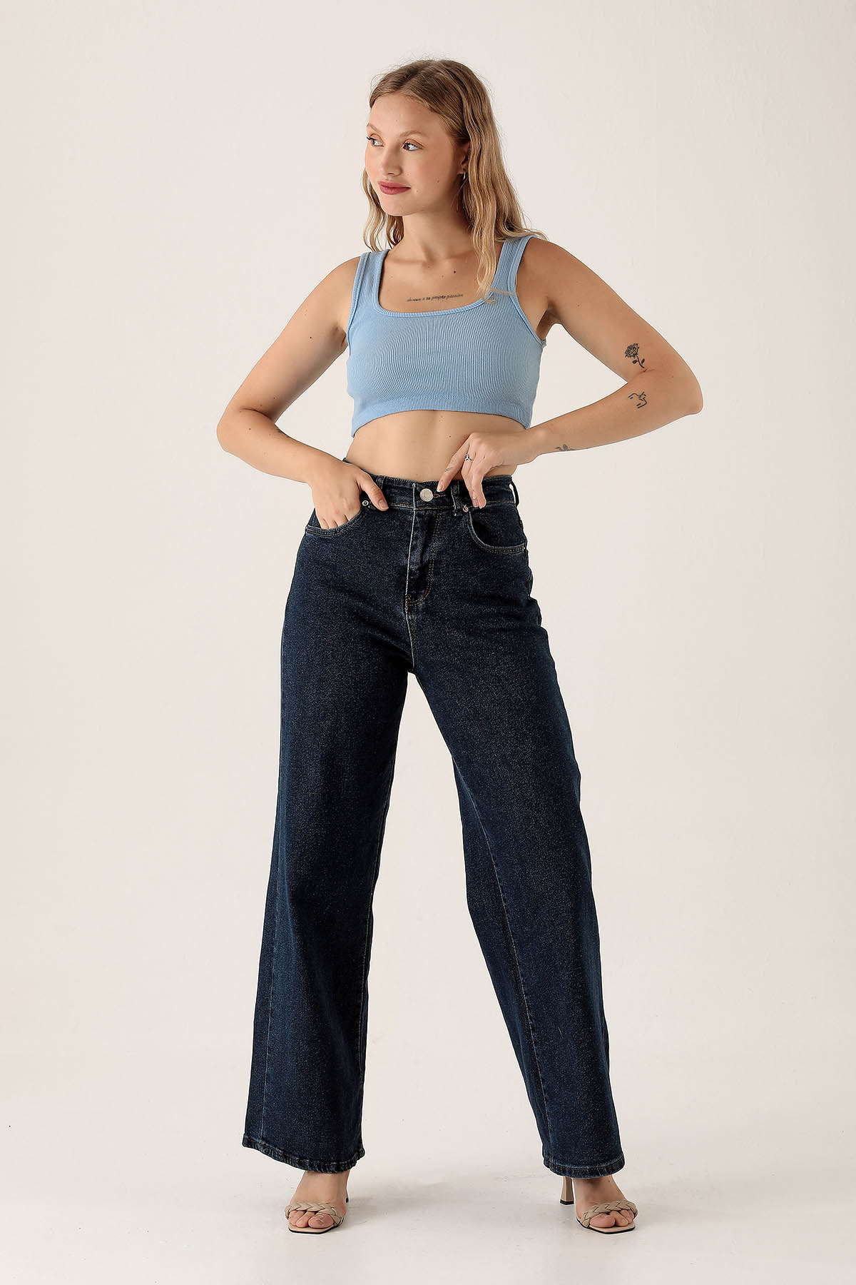 Yüksek Bel Bol Paça Bayan Pantolon - 3024 Koyu Mavi