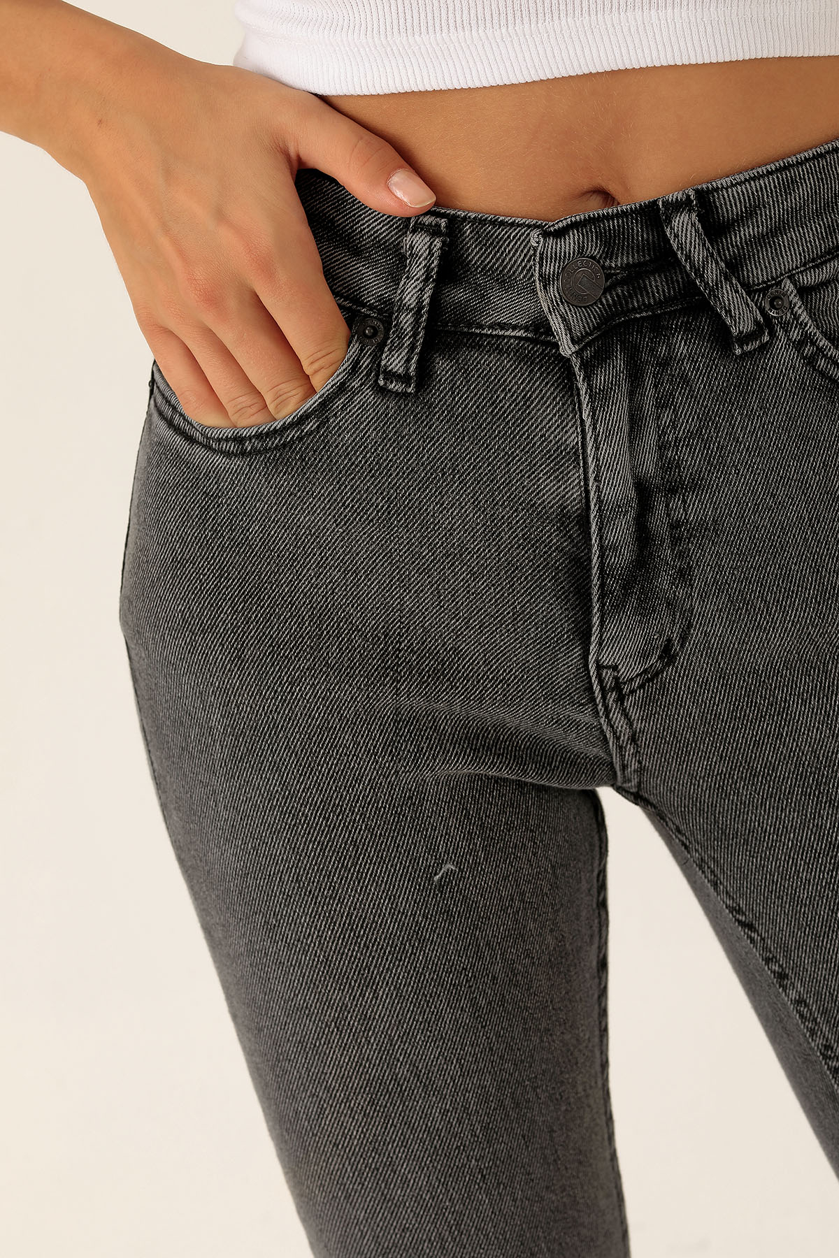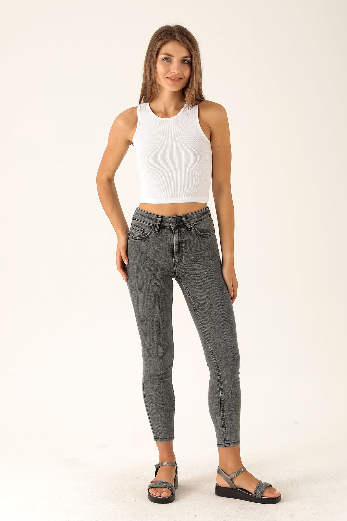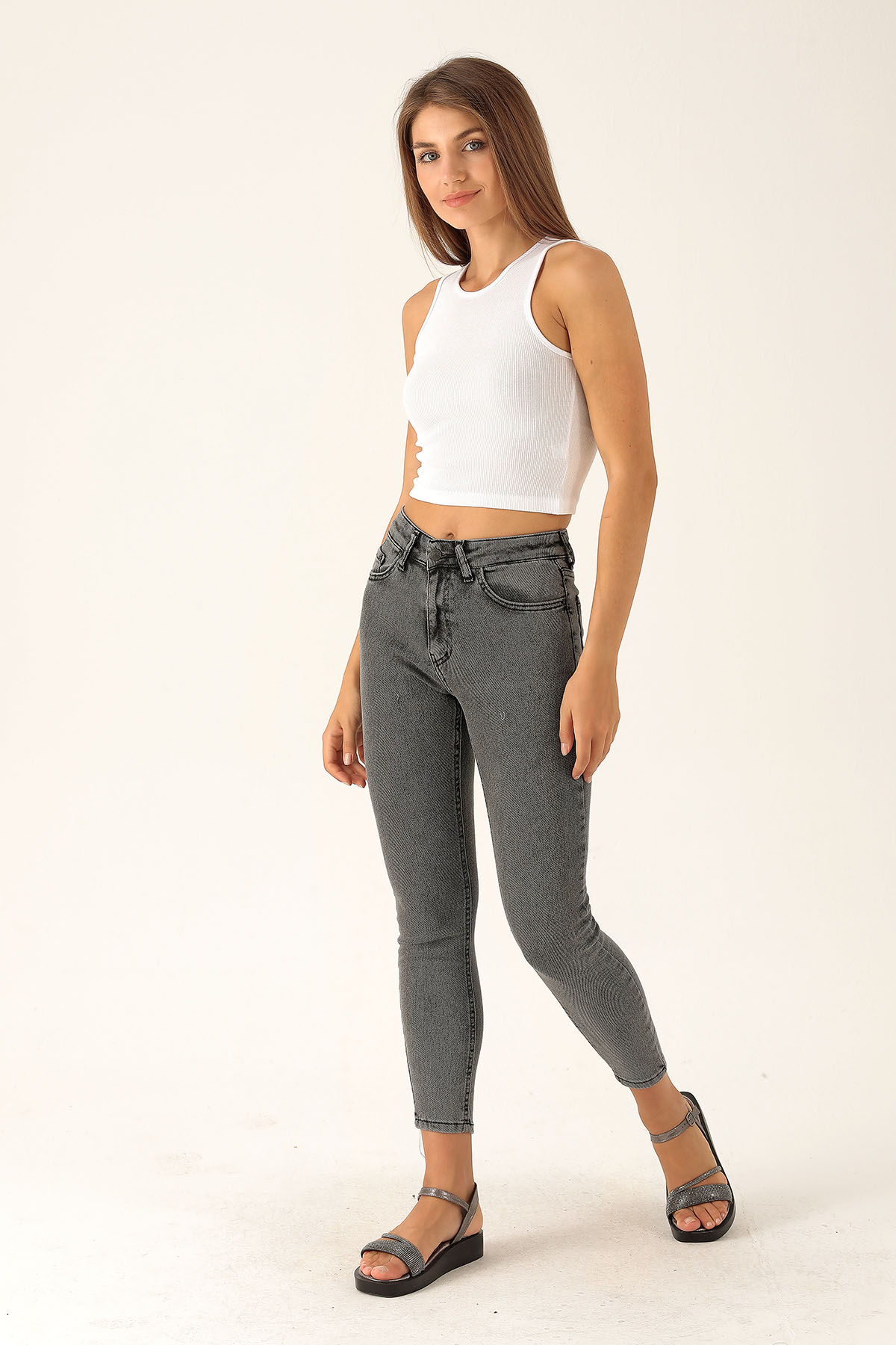 Yüksek Bel Dar Paça Bayan Pantolon - 3023-1 Füme
