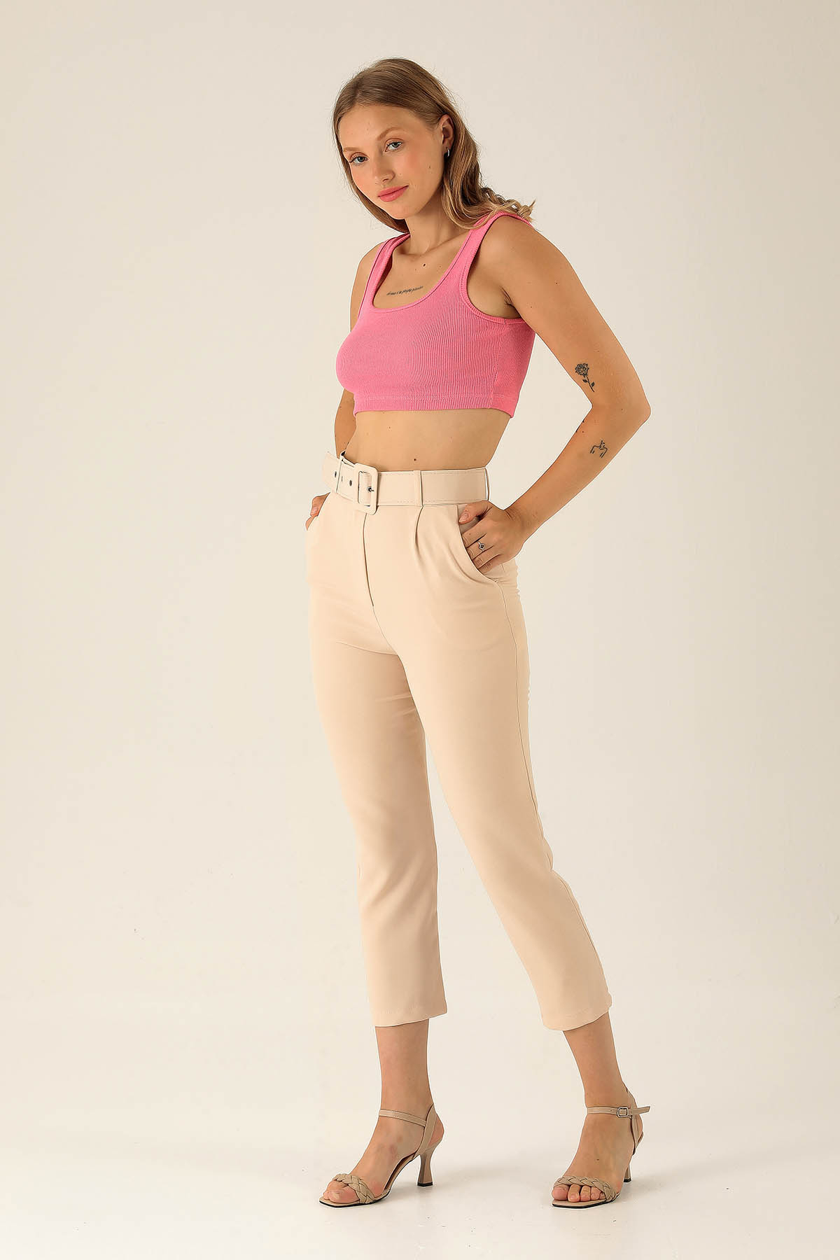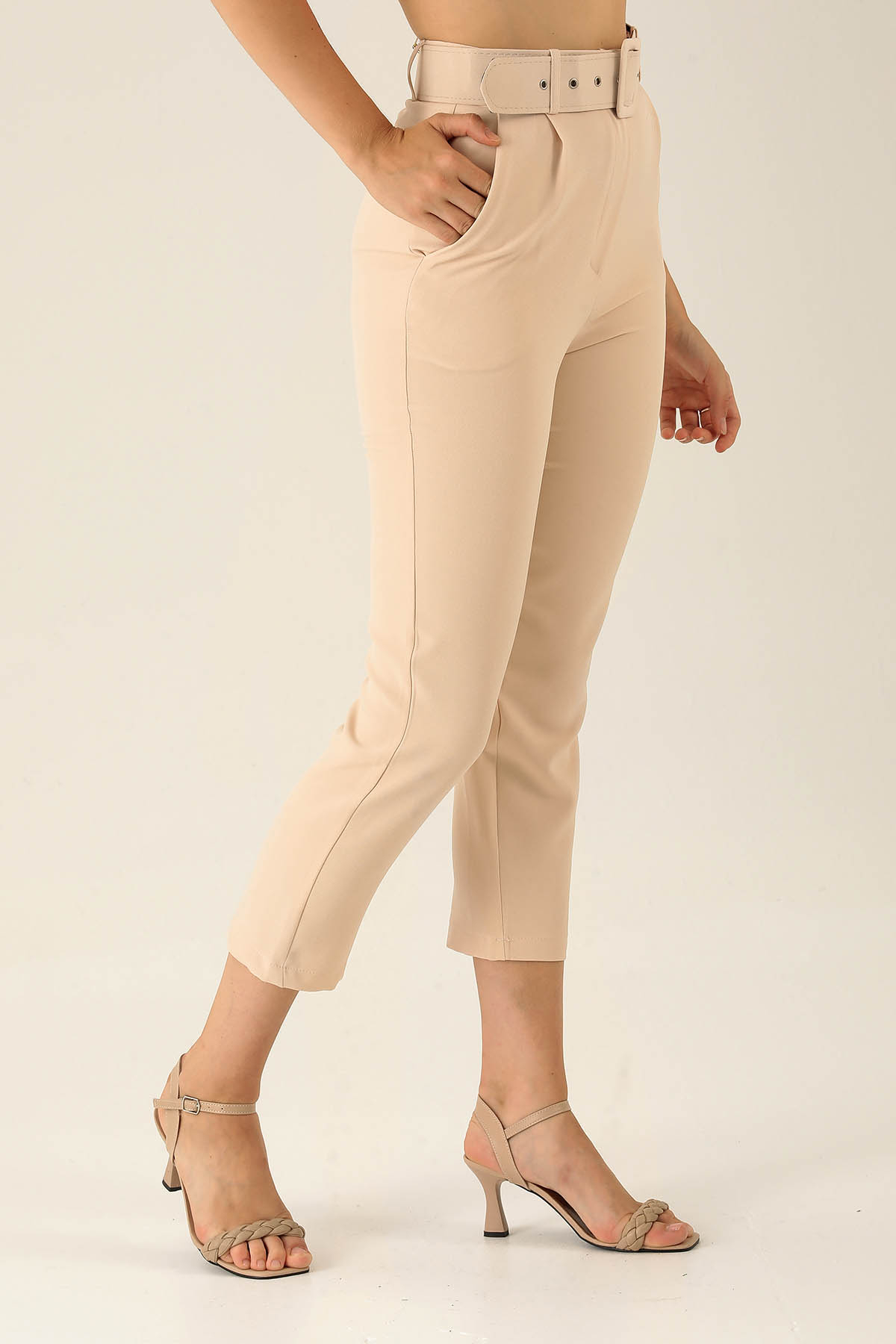Yüksek Bel Kalın Kemerli Bayan Pantolon - 7091A Taş