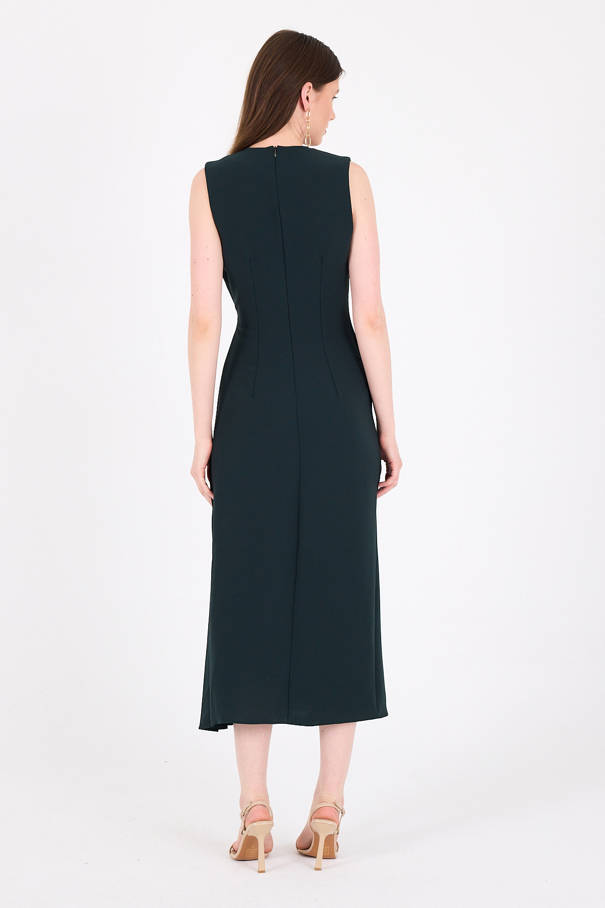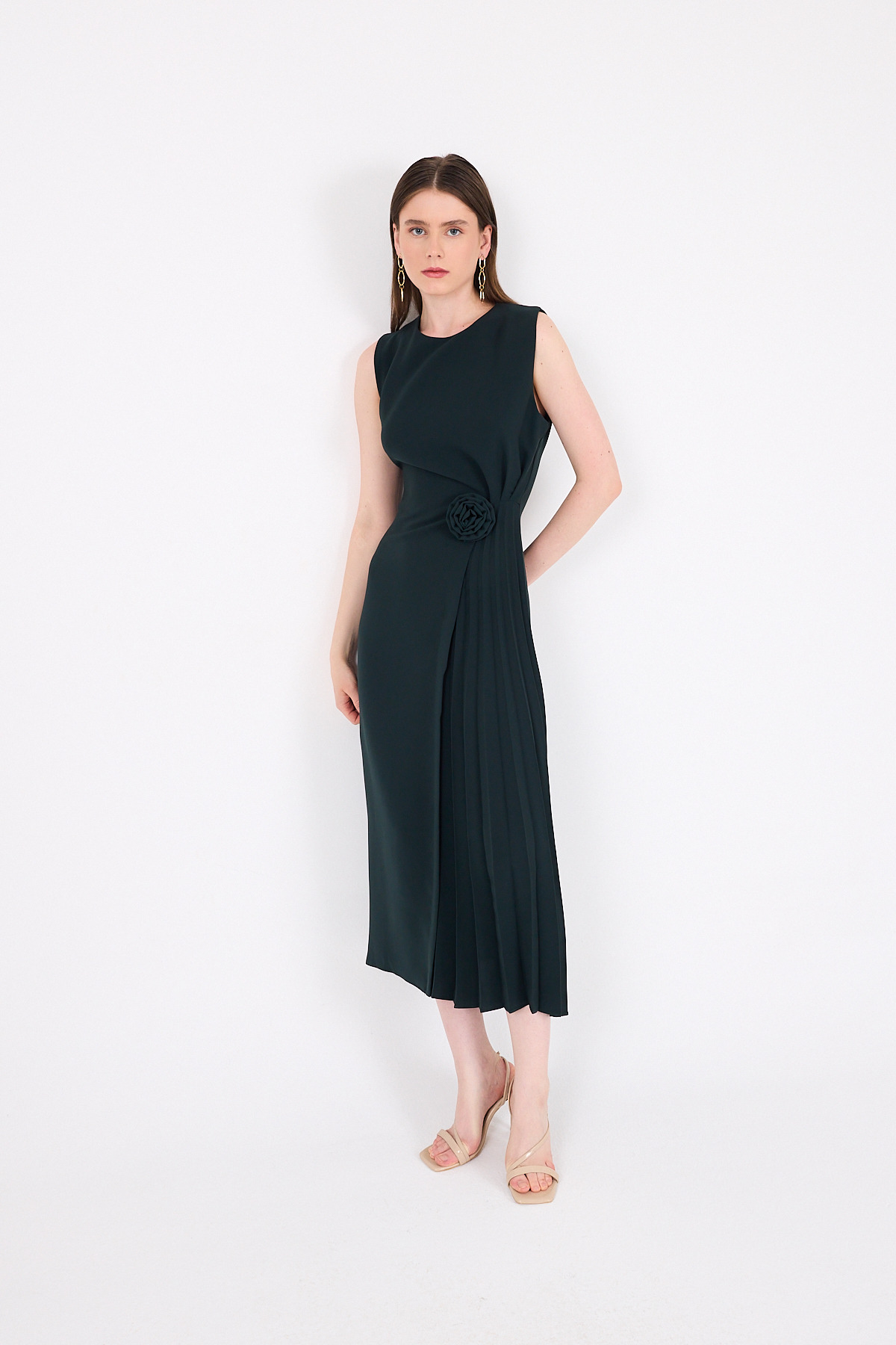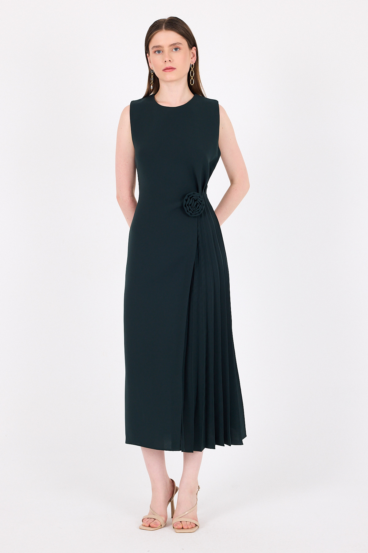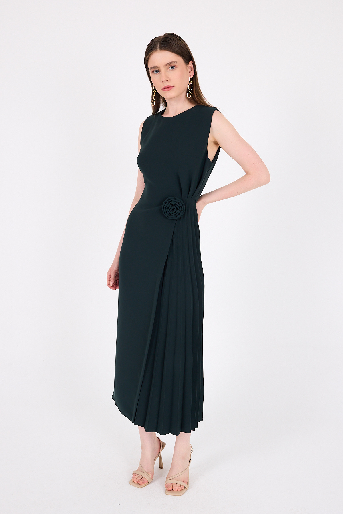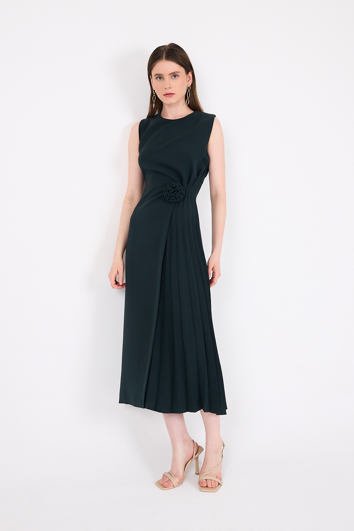 Zümrüt Çiçek Detaylı Pliseli Midi Abiye Elbise 251671